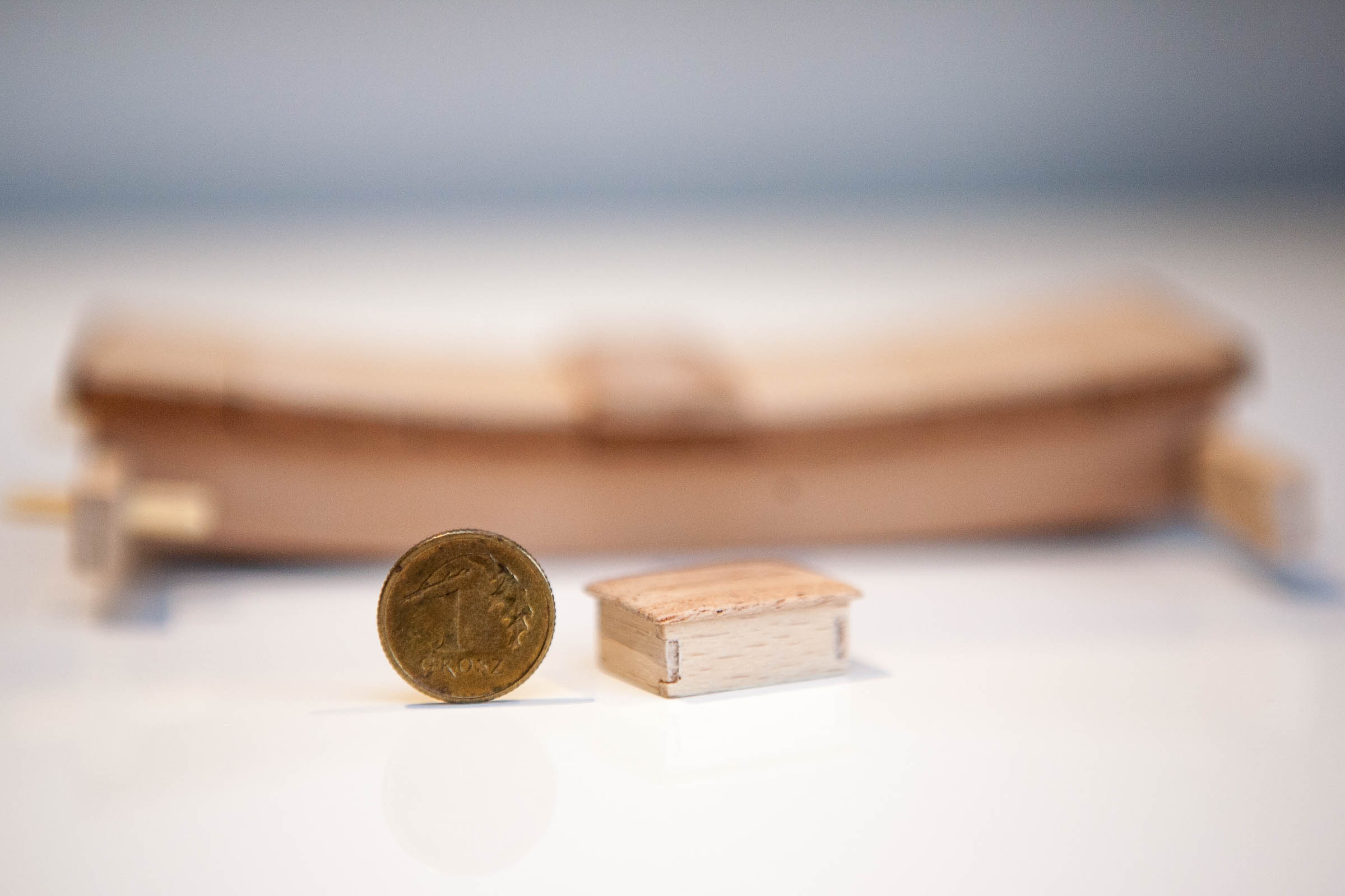 Popracowałem nad nadbudówką/ładownią. Zbudowana z balsy i pokryta fornirem gruszkowym. Pokrywy i podpory ze sklejonych 1/2/3 warstw obłogu bukowego. Elementy stabilizujące z listewek jakiegoś egzotyka.