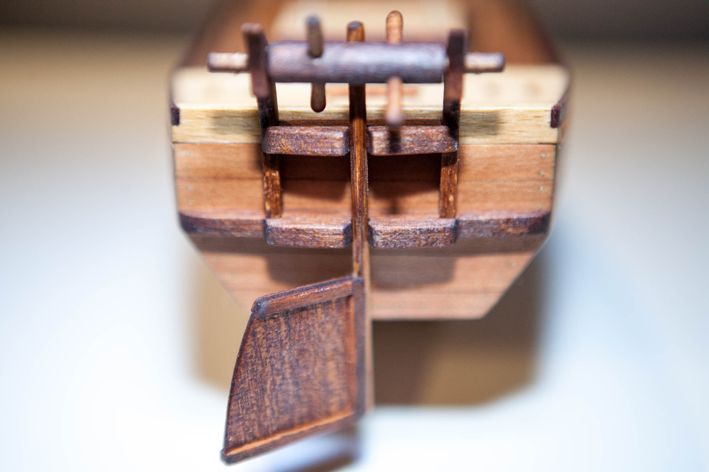 Okucia pozwoliły na montaż kotwicy i elementów na rufie. Prowizoryczna podstawka poszła na złom. Dżonka zasługuje na coś dużo ładniejszego (mam nadzieję, że wyszło godnie).