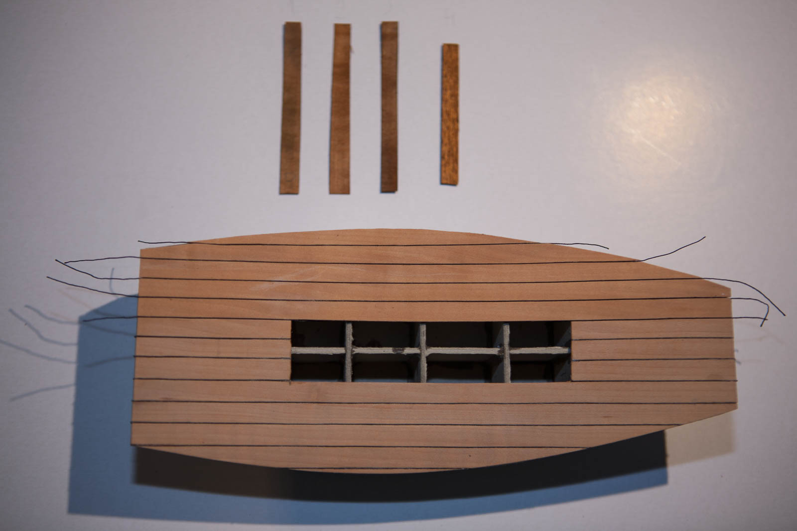 - Pierwsze paski forniru przyklejone na pokładzie. Klej użyty to butapren (grunt na kartonie i nałożenie na plankę - chwyta szybko). Caulking miałem robić zaczerniając krawędzie, jednak mi się nie podobało i skończyłem wklejając czarną nić)