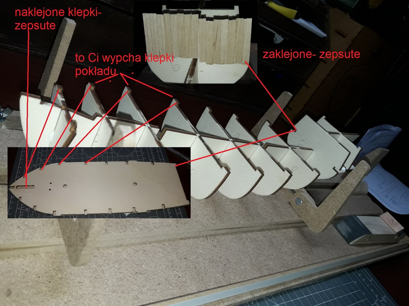 Przecież jest to w instrukcji. Składałem ten model parę lat temu, ale to co daje producent + tłumaczenie jest naprawdę dobre. Musisz czytać plany. Wycinasz 2 otwory pod maszty, 2 pod liny kotwiczne i ten owalny pod bukszpryt. Rozumiem, że przed oklejeniem spasowałeś ten pokład ze sklejki z kadłubem? Jeżeli nie będziesz miał problem.