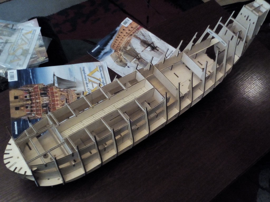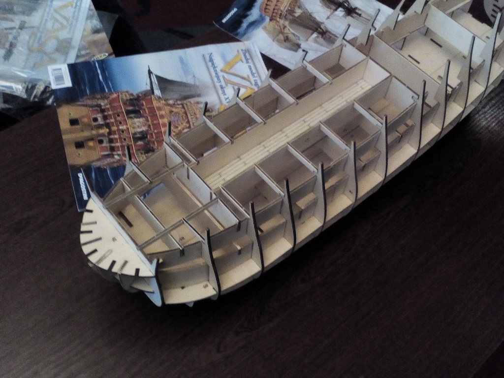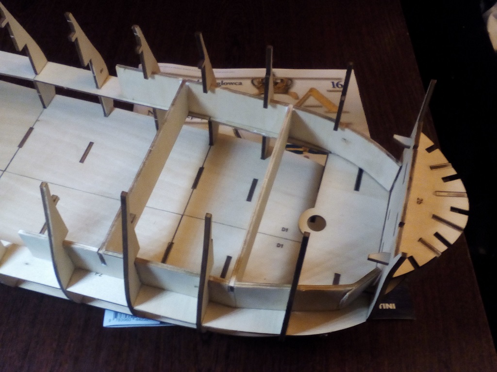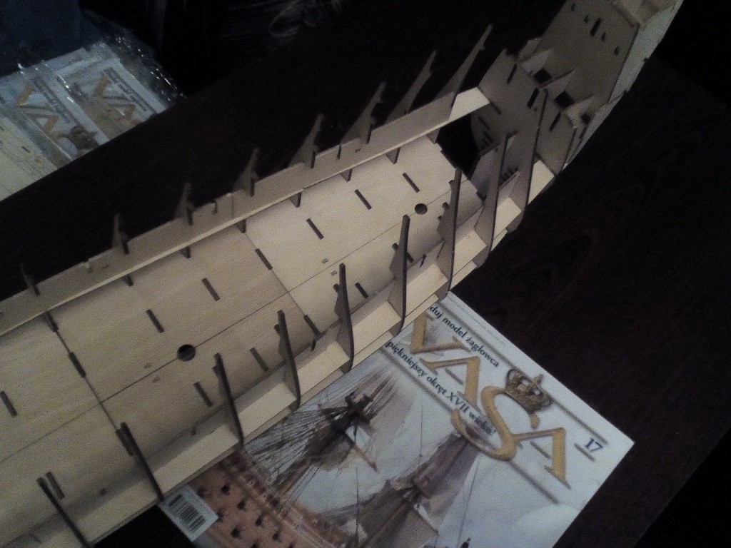 Jak widzę miałeś problem z gięciem elementu ze sklejki (elementy wzdłużne - P5 z zeszytu 16). Szkoda, że nie skorzystałeś z podpowiedzi w grupie VASA, 1628 gdzie radziłem ponacinać piłką (modelarską lub zwykłym brzeszczotem) poprzecznie po wewętrznej stronie co 5 - 8 mm (ja nacinałem co ok. 5 mm i uzyskałem łuk znacznie większy niż potrzeba)