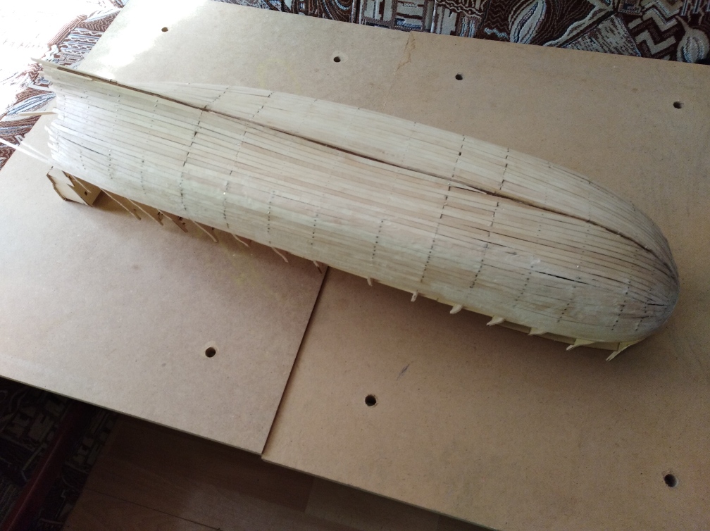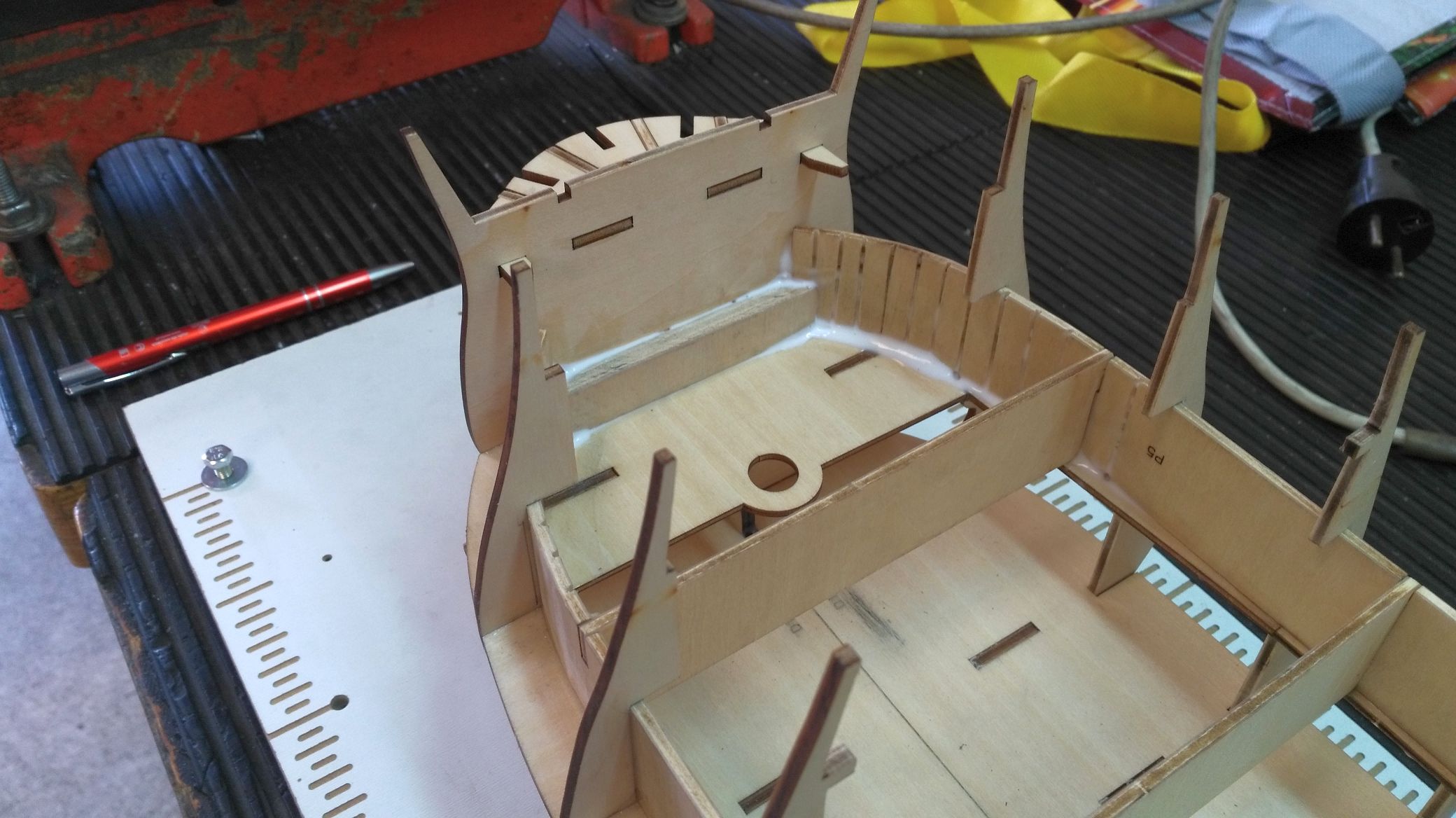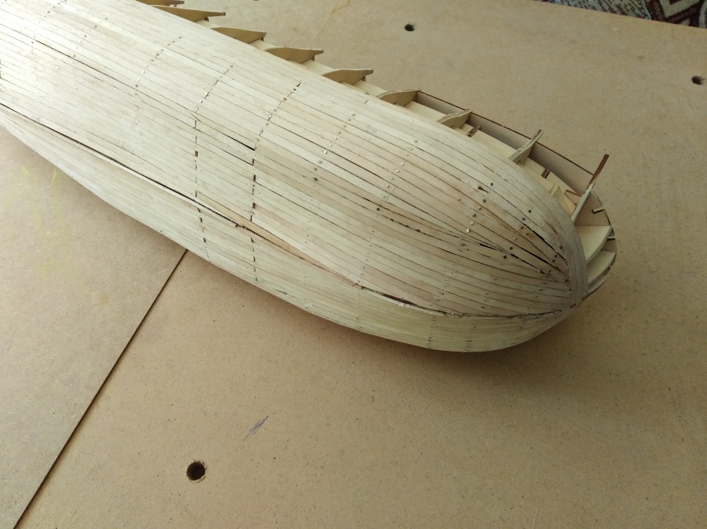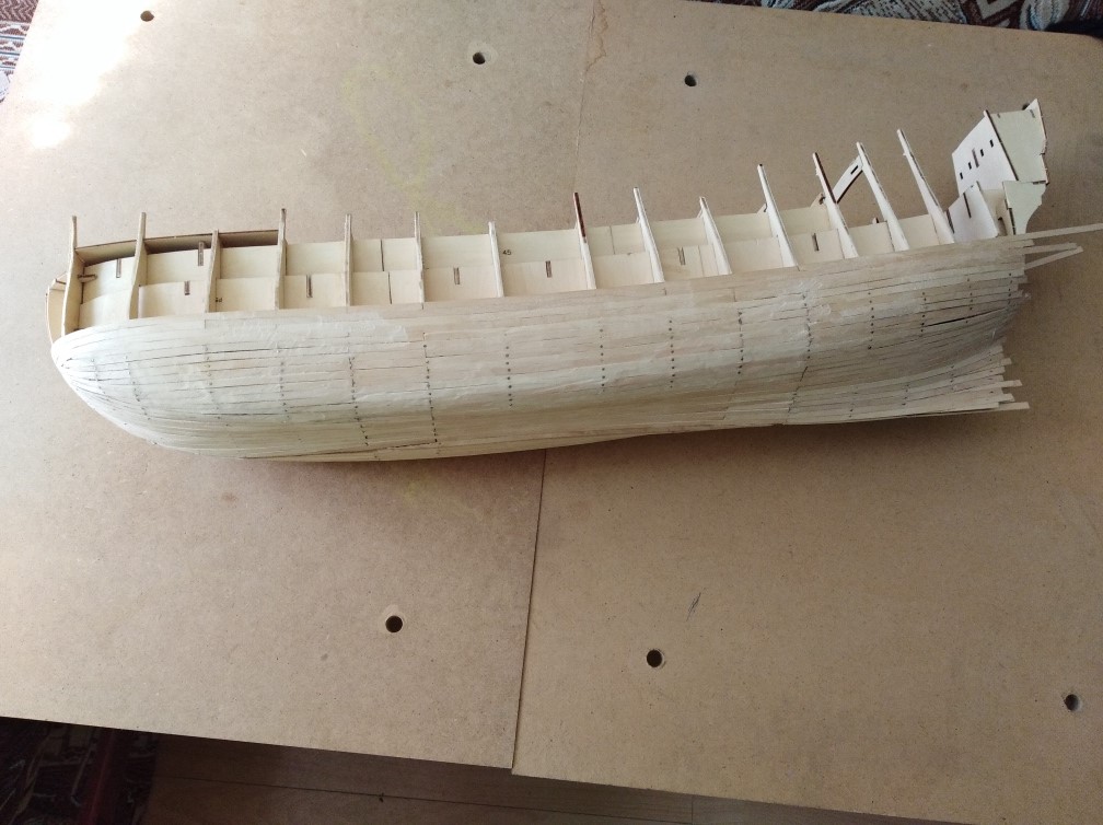 Jak widzę miałeś problem z gięciem elementu ze sklejki (elementy wzdłużne - P5 z zeszytu 16). Szkoda, że nie skorzystałeś z podpowiedzi w grupie VASA, 1628 gdzie radziłem ponacinać piłką (modelarską lub zwykłym brzeszczotem) poprzecznie po wewętrznej stronie co 5 - 8 mm (ja nacinałem co ok. 5 mm i uzyskałem łuk znacznie większy niż potrzeba)