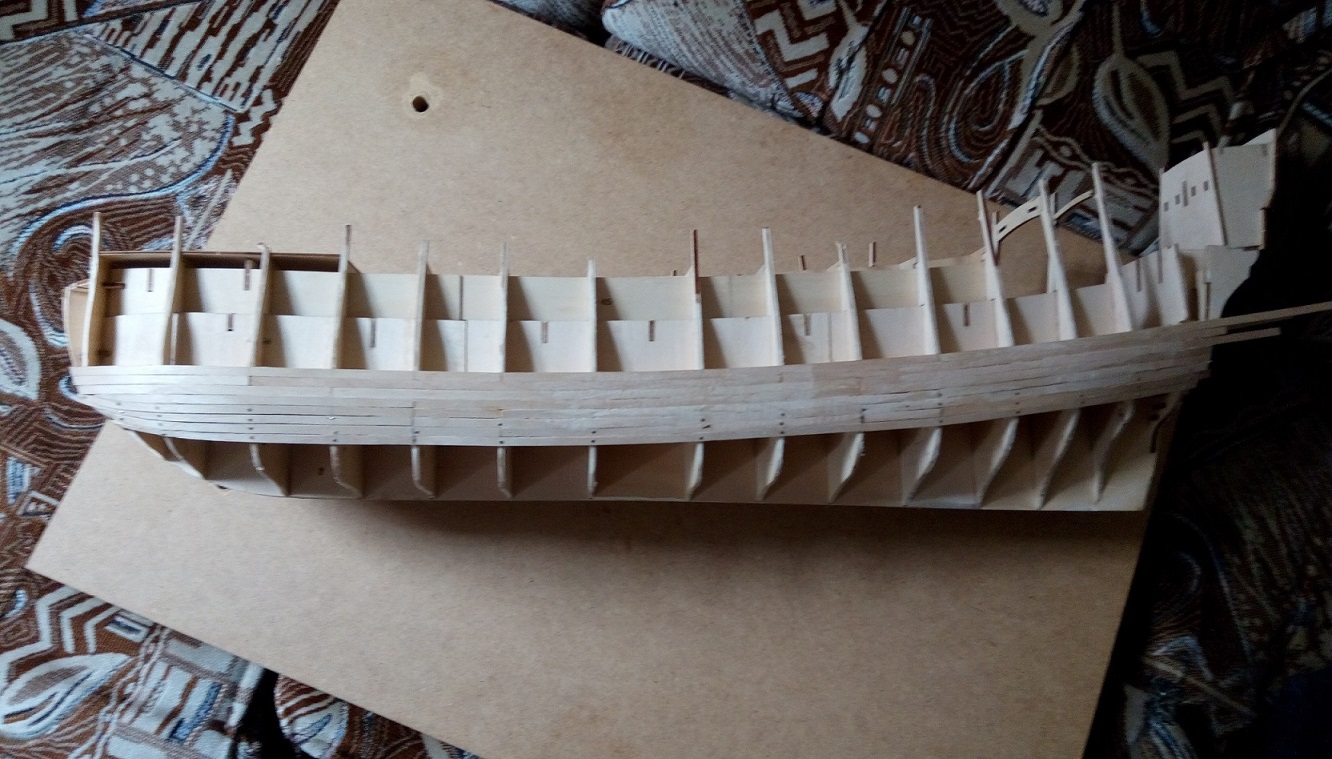 Jak widzę miałeś problem z gięciem elementu ze sklejki (elementy wzdłużne - P5 z zeszytu 16). Szkoda, że nie skorzystałeś z podpowiedzi w grupie VASA, 1628 gdzie radziłem ponacinać piłką (modelarską lub zwykłym brzeszczotem) poprzecznie po wewętrznej stronie co 5 - 8 mm (ja nacinałem co ok. 5 mm i uzyskałem łuk znacznie większy niż potrzeba)