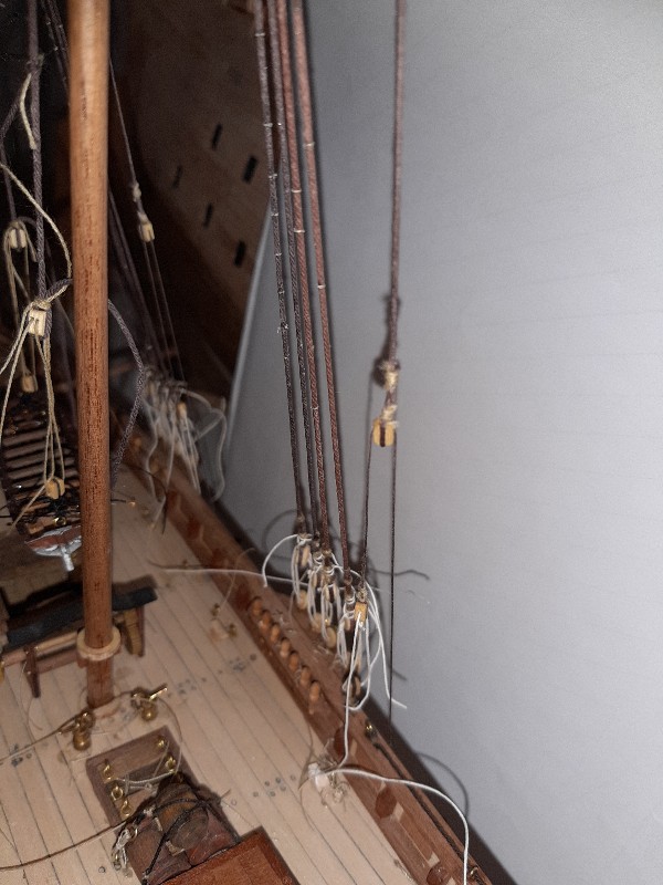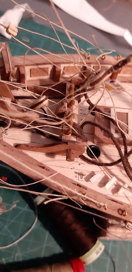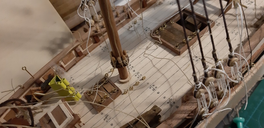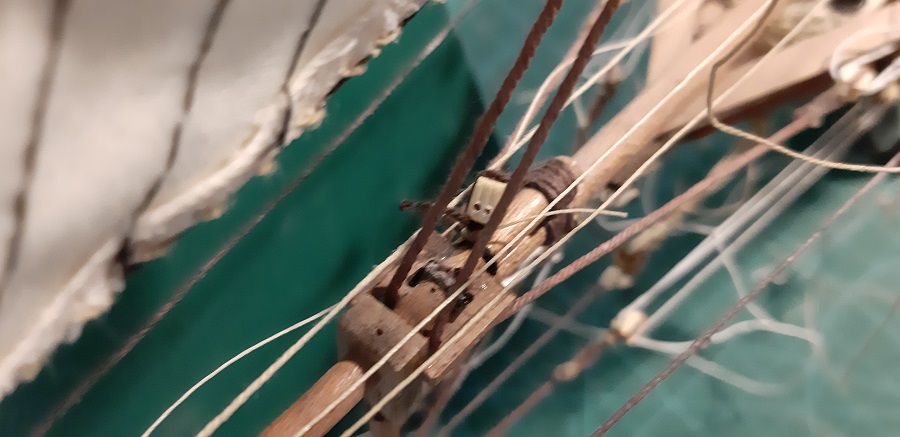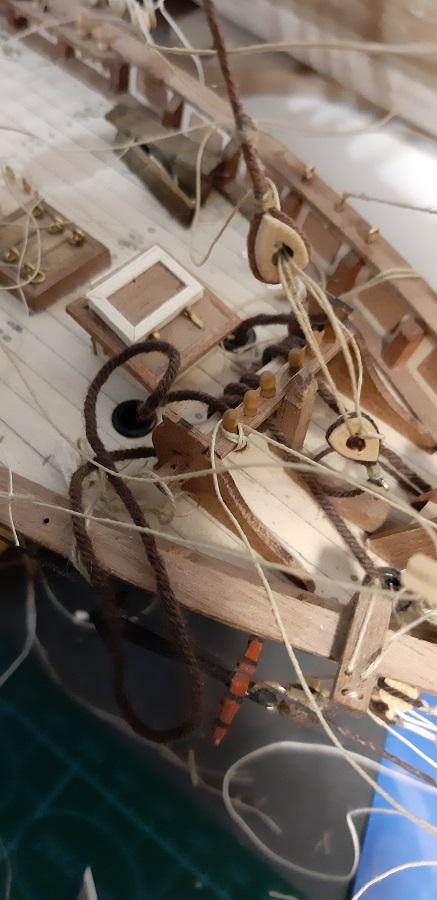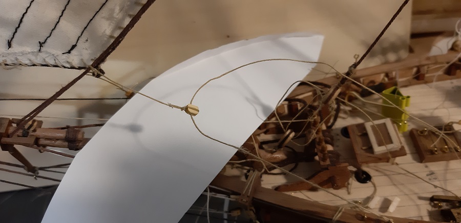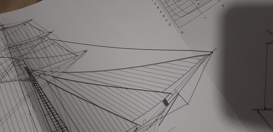 Nie widziałem Twoich planów, ale wydaje mi się, że masz błąd. Na bukszprycie powinieneś mieć nie pojedyncze, ale podwójne bloki. Zwróć uwagę na rysunki podobnego szkunera, wydaje mi się, że brakuje Ci liny 104 która obok liny 102 powinna przechodzić przez podwójny blok i dalej na pokład do nagli.