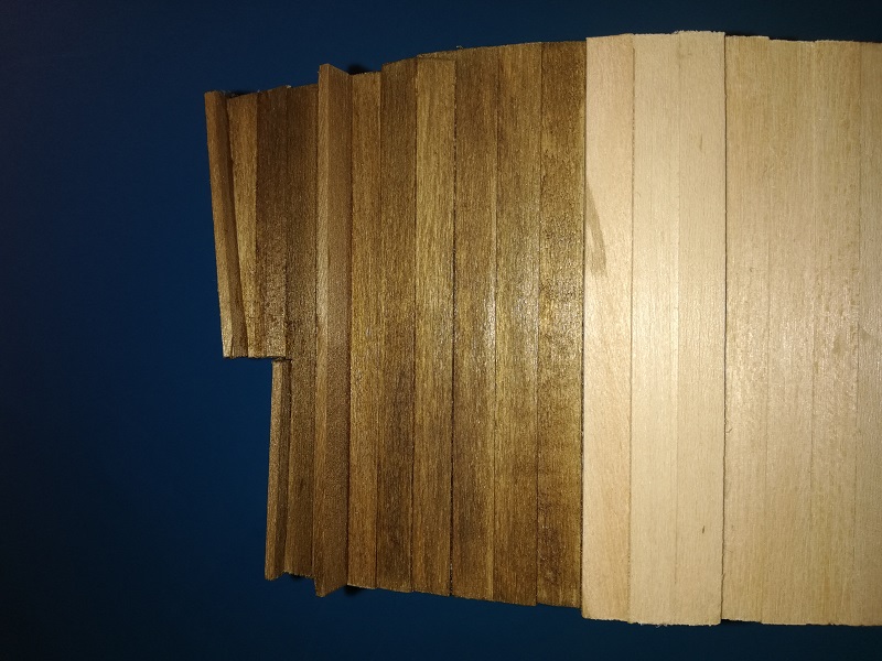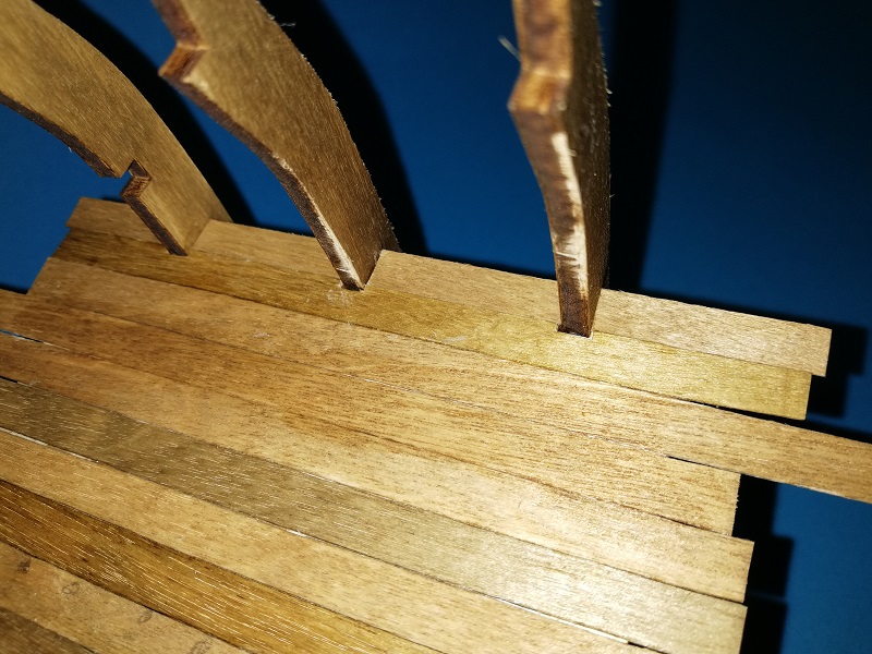 Wkleiłem pokładniki. Pokład jest włożony tylko na sucho dlatego, że chciałem by odległości między wręgami były idealne. Pokładniki bejcowałem i lakierowałem.