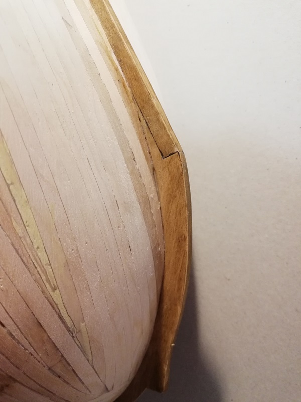 Sorry, że muszę Cię rozczarować, ale położyłeś poszycie błędnie - typowo dla początkującego. Poza tym, rufa u Ciebie zachodzi na poszycie, a powinno być odwrotnie.