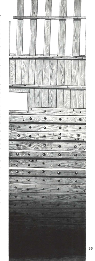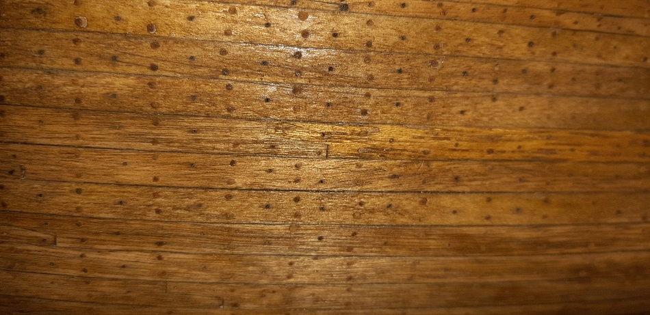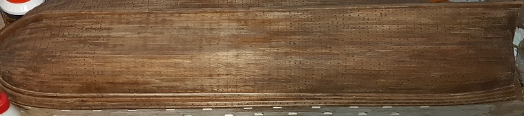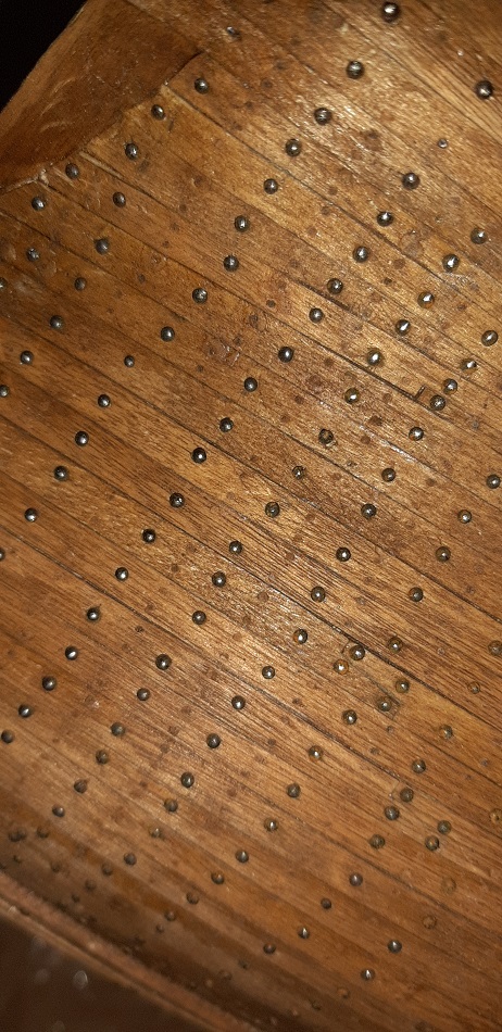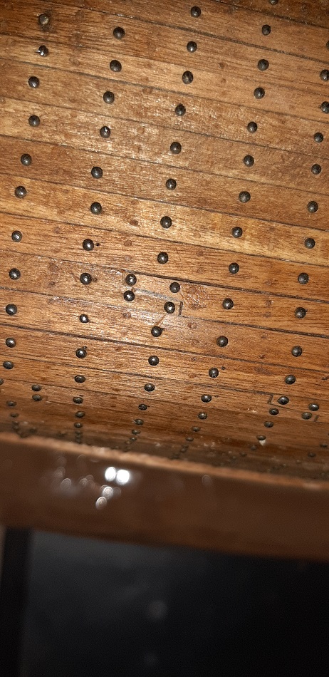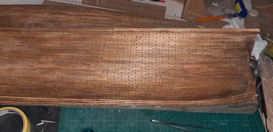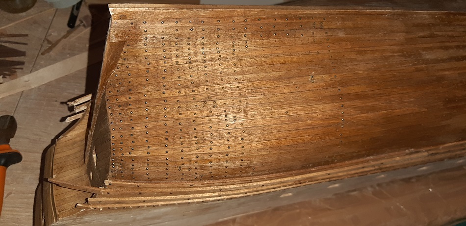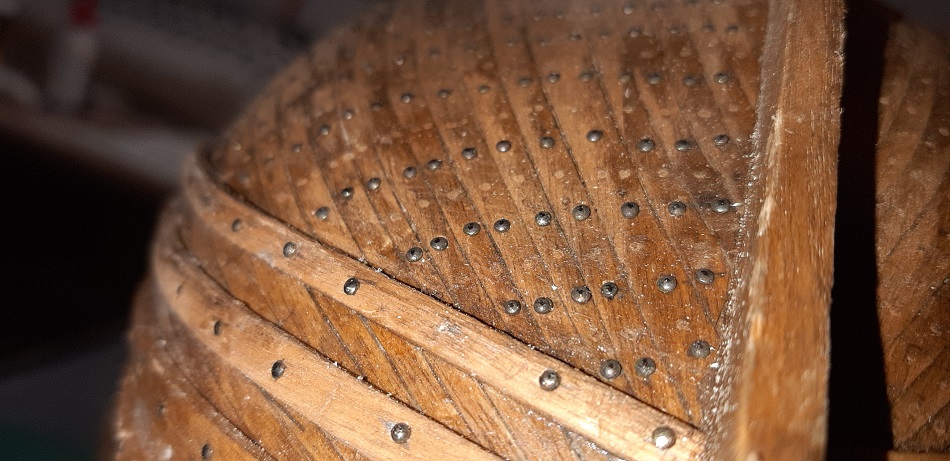 W perspektywie całego ogwoździowanego kadłuba delikatne odchyły od lini na rufie będą mało widoczne. Już teraz kompozycja koloru kadłuba, kołków drewnianych i gwoździ mocno zlewa się.