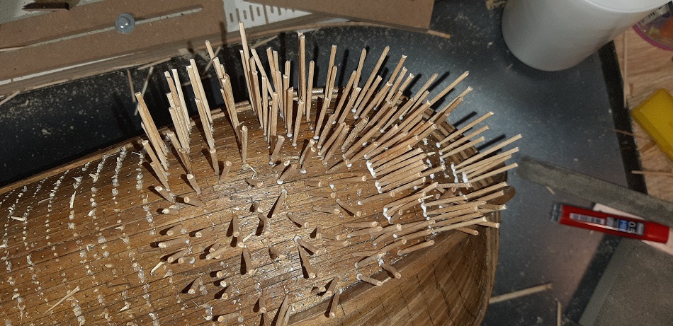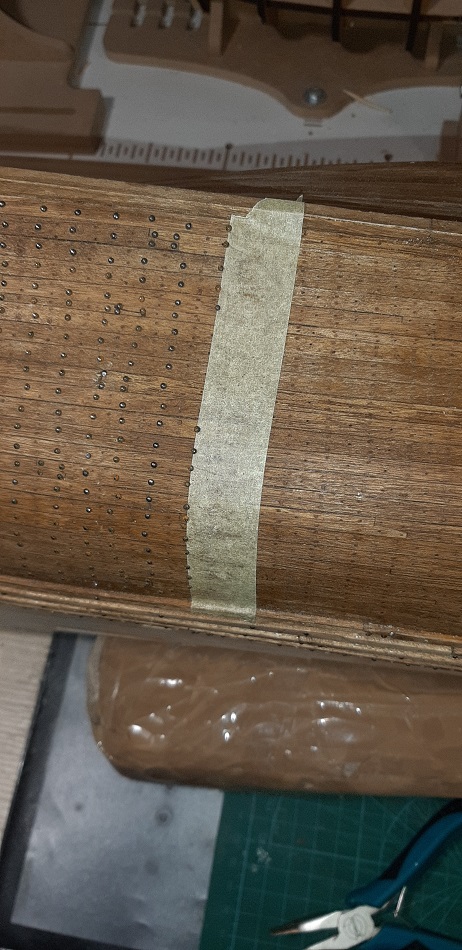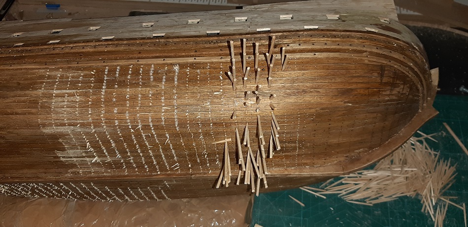 Koniec kołkowanie na jednej burcie. Następna jest zabejcowana. Tak jak mówiłem wszelkie babole, czy odstępstwa od lini prostej znikają przytłoczone ilością gwoździ.