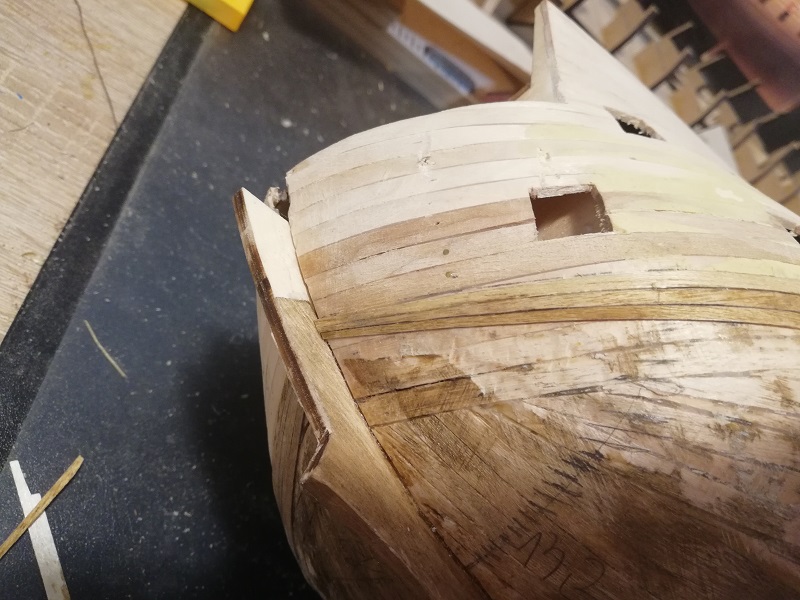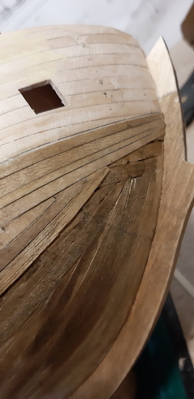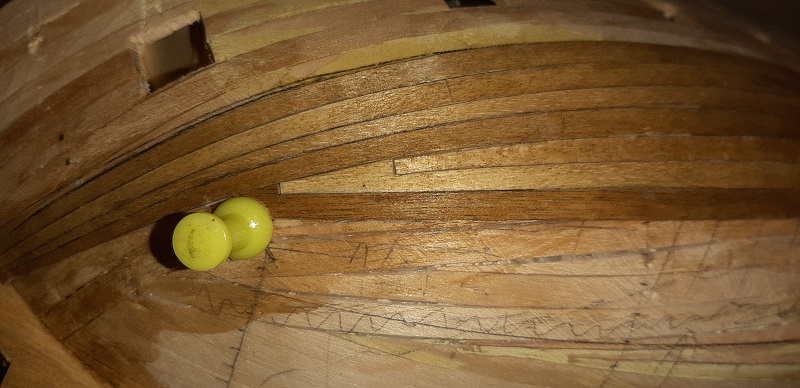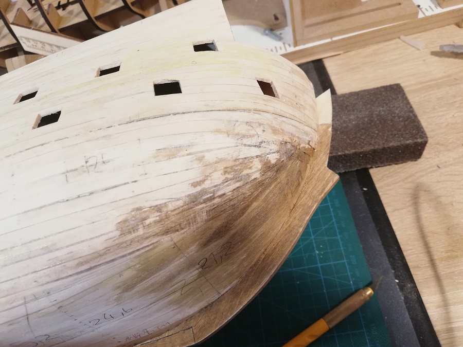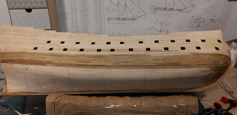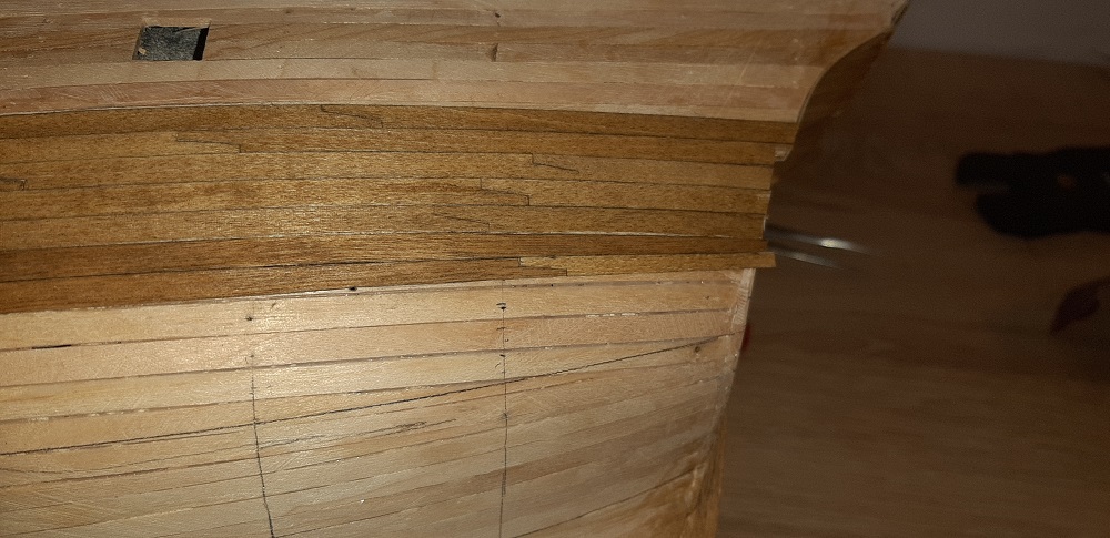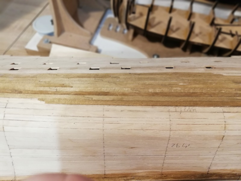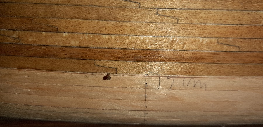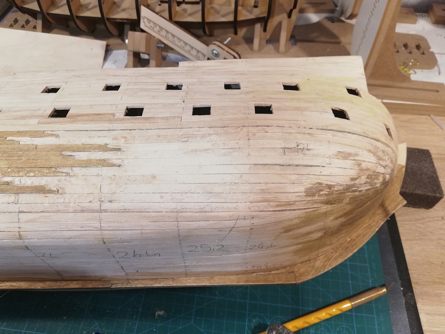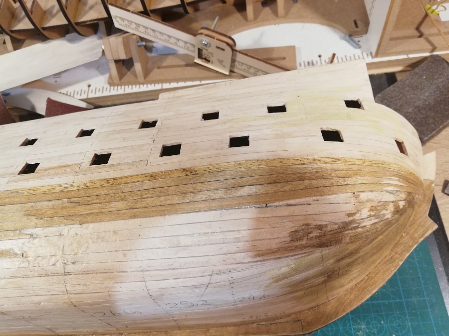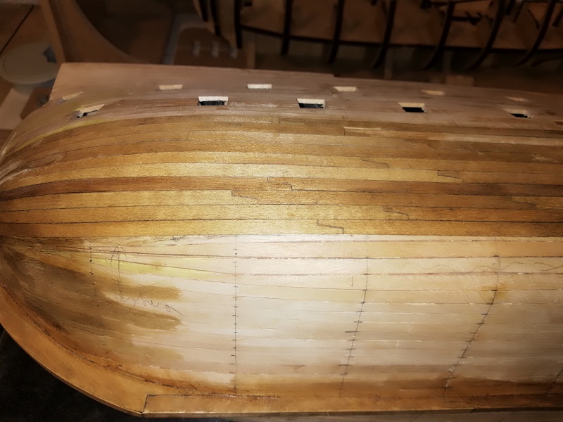 Właściwie nic się prawie nie zmieniło, doszedł tylko 1 rząd na jednej z burt i zacząłem kolejny na przeciwnej. I za radą kolegi z MSW zabejcowałem dziób na ciemny kolor, by nie było widać ewentualnych prześwitów. https://modelshipworld.com/index.php?/t ... stini-165/