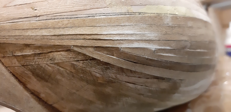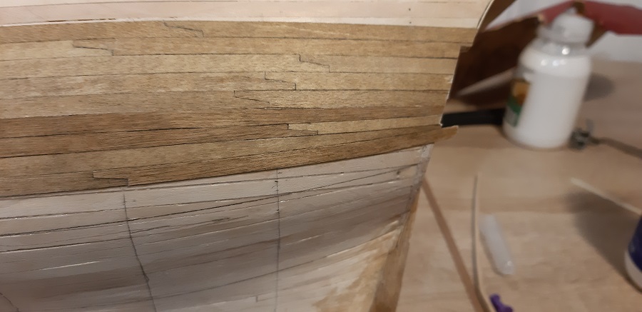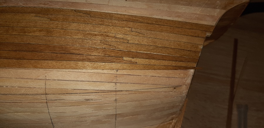 Pół dnia dziś siedziałem przy Vasie, wyznaczałem stealery, co ile mm listewka ma się zwężać do dziobu, układałem, testowałem. I nijak przy listewkach 0,5mm, 5mm, 300mm nie da się tego zrobić. Nawet gdyby pierwsze planka szła nienaturalnie do góry i tak N-ta na środku kadłuba za chiny nie dojdzie do dziobu.