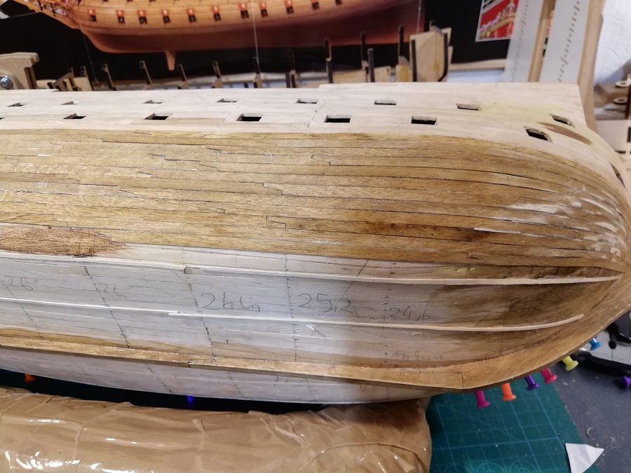 Tomku nieporozumienie między podpowiadającymi a kol. Wiktorem polega na tym, że Wiktor klei drugie poszycie PROSTYMI listwami z forniru, a na tym kadłubie prawidłowo jak mu podpowiadasz nie da się tego zrobić (PROSTYMI listwami). Listwy w tej części powinny być PROFILOWANE do odpowiedniego kształtu. Doskonale to widać było na pierwszym poszyciu jak PROSTE listwy naturalnie się układają na tym kadłubie - notabene nieprawidłowo.