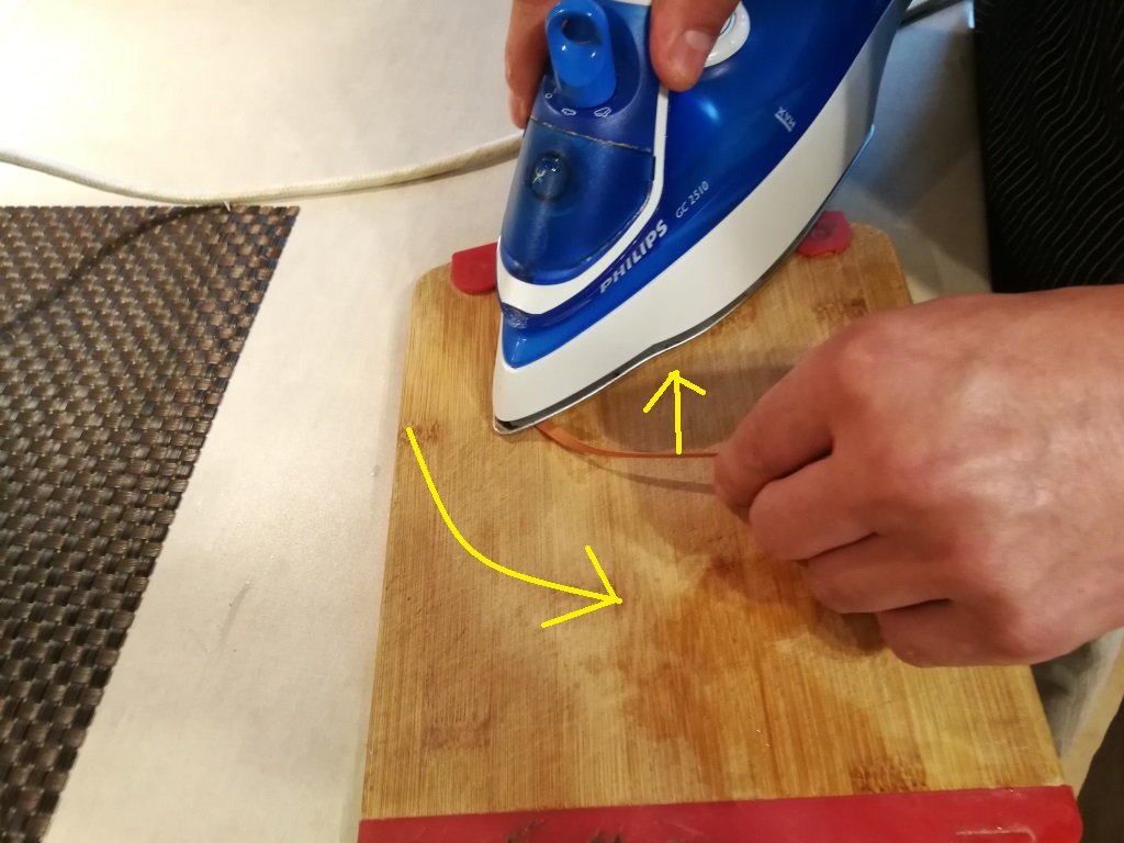 Metoda prosta - dobrze zmoczony najlepiej w gorącej wodzie pasek forniru traktujesz żelazkiem. Cały myk to "podprasowywanie" forniru pod żelazko z jednoczesnym jego wyginaniem. Robisz to ruchem kolistym żelazka - to co pod nim utrwala kształt a przed podginasz do kształtu. Pokazują to strzałki. i drugie zdjęcie przeprasowaniu. Fornir grusza 0.6 , pasek ok 4-5 mm.