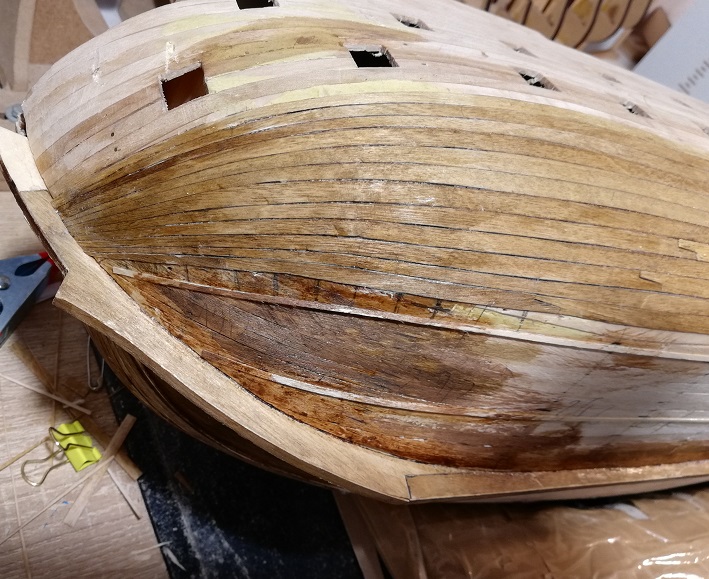 Po mojemu, to zbytnio scieniles te Twe gorne planki na dziobie i dlatego kazda nastepna z nich musi potem isc nadmiernie ku gorze - stad potem powstaje sytuacja ze te bardzo spiczaste planki musza sie nadmiernie wyginac bocznie i powstaja te szpary, ktore potem trzeba silnie na klej dociskac.