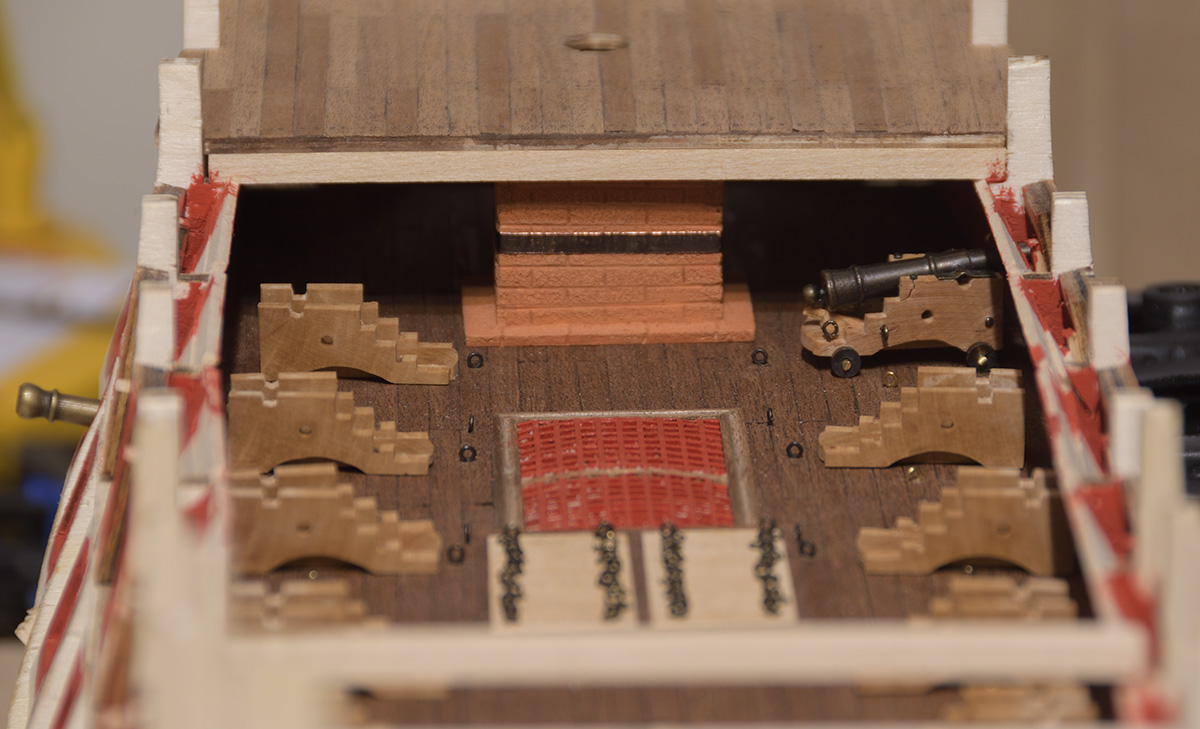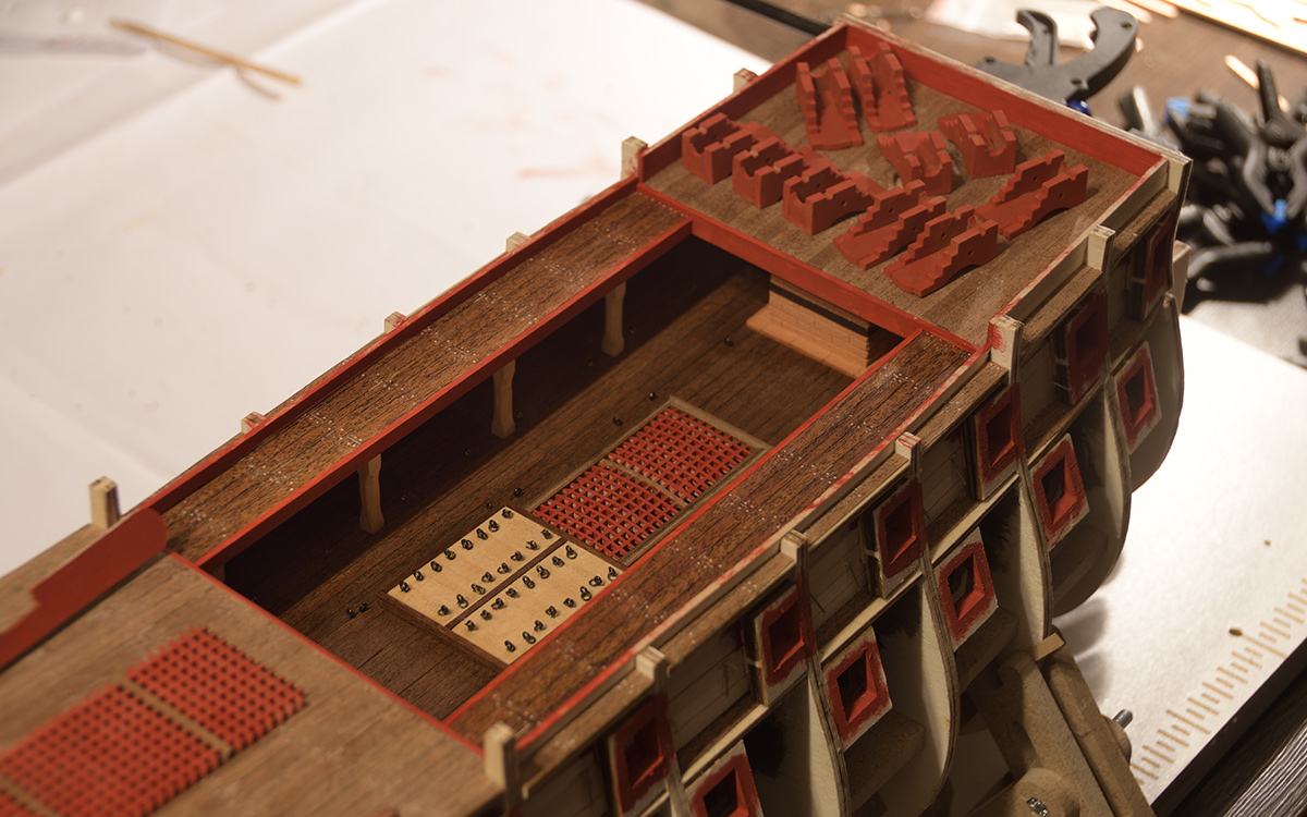Ja rozwiązałem sobie to następująco: w najniższym rzędzie wyciemniłem tło widoczne przez furty działowe, dorobiłem ze złomu (dosadniej byłoby powiedzieć - ze śmieci) uchwyty na półlufy. W górnym rzędzie gdzie pada światło z przeciwległych ambrazur, lub z odkrytego środka trzeba się trochę bardziej postarać. Wykorzystam firmowe lawety, jako drugą część lufy, znowu kawałek wałeczka i wystającą końcówkę z zestawu.