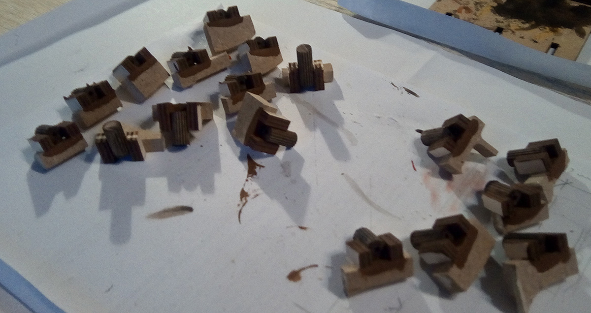 "Atrapa" - to dobry tytuł dla tego odcinka. OcCre stosuje sporo uproszczeń, kuchenka jest jednym z przykładów. Są to w zasadzie trzy ścianki widziane od tyłu, nic poza tym, od niewidocznego środka jest sklejka. Na wierzch położyłem szpachlę do drewna, trochę wyrównałem, wyżłobiłem rowki i zostawiłem, aby uzyskać fakturę porowatej cegły.