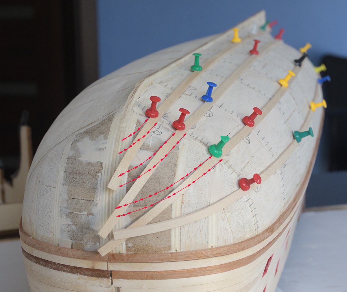 Batteny dziobowe dalbym tak, po lagodnych lukach - jak na zdjeciu nizej.