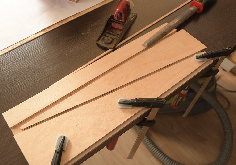 Listewki są dosyć sztywne, wszak mają 2mm grubości. Plus, że nie przejmuję się falami Dunaju, bo to powinno się zniwelować i w ostatecznym szlifie (mam nadzieję) zniknie. Minus, że ta sztywność utrudnia wyginanie nawet po namoczeniu i gięciu na gorąco. Niemniej walczę dalej.