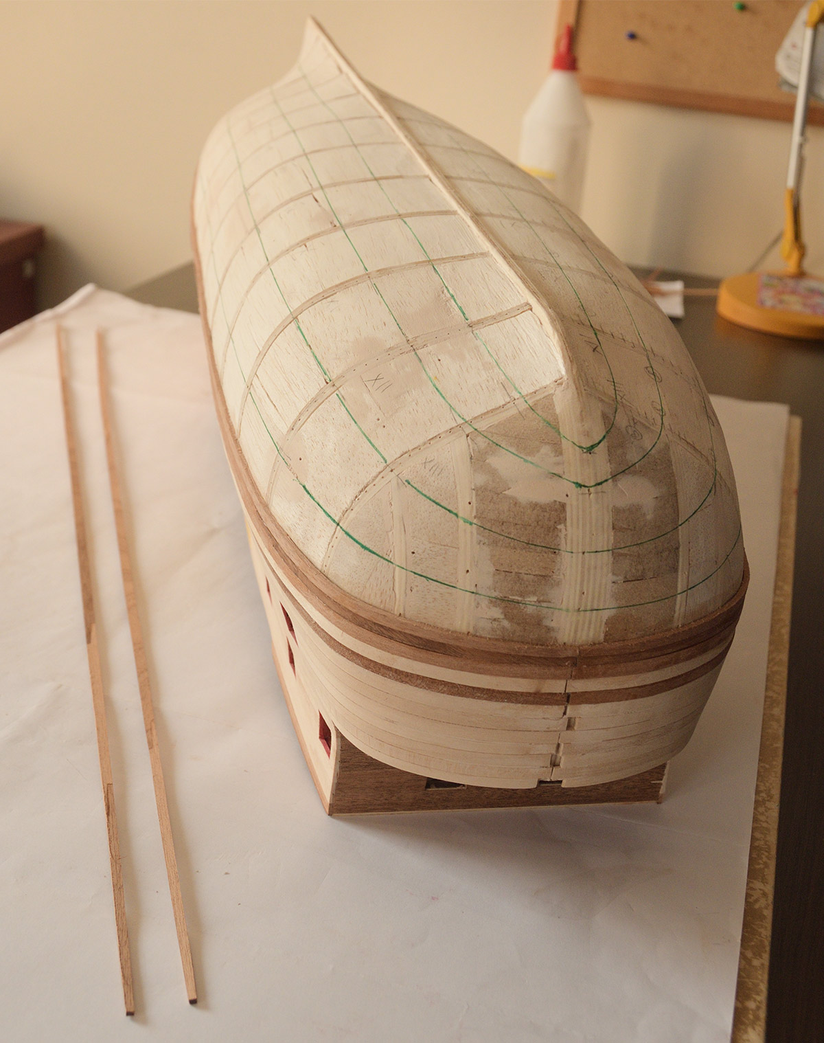 Mozna tez, zamiast battenow, stosowac czarna nitke przyklejona tymczasowo do kadluba, albo nawet linie w olowku, wykreslona po luku. I do tej linii bedziesz odczytywal pomiary szerokosci planek.
