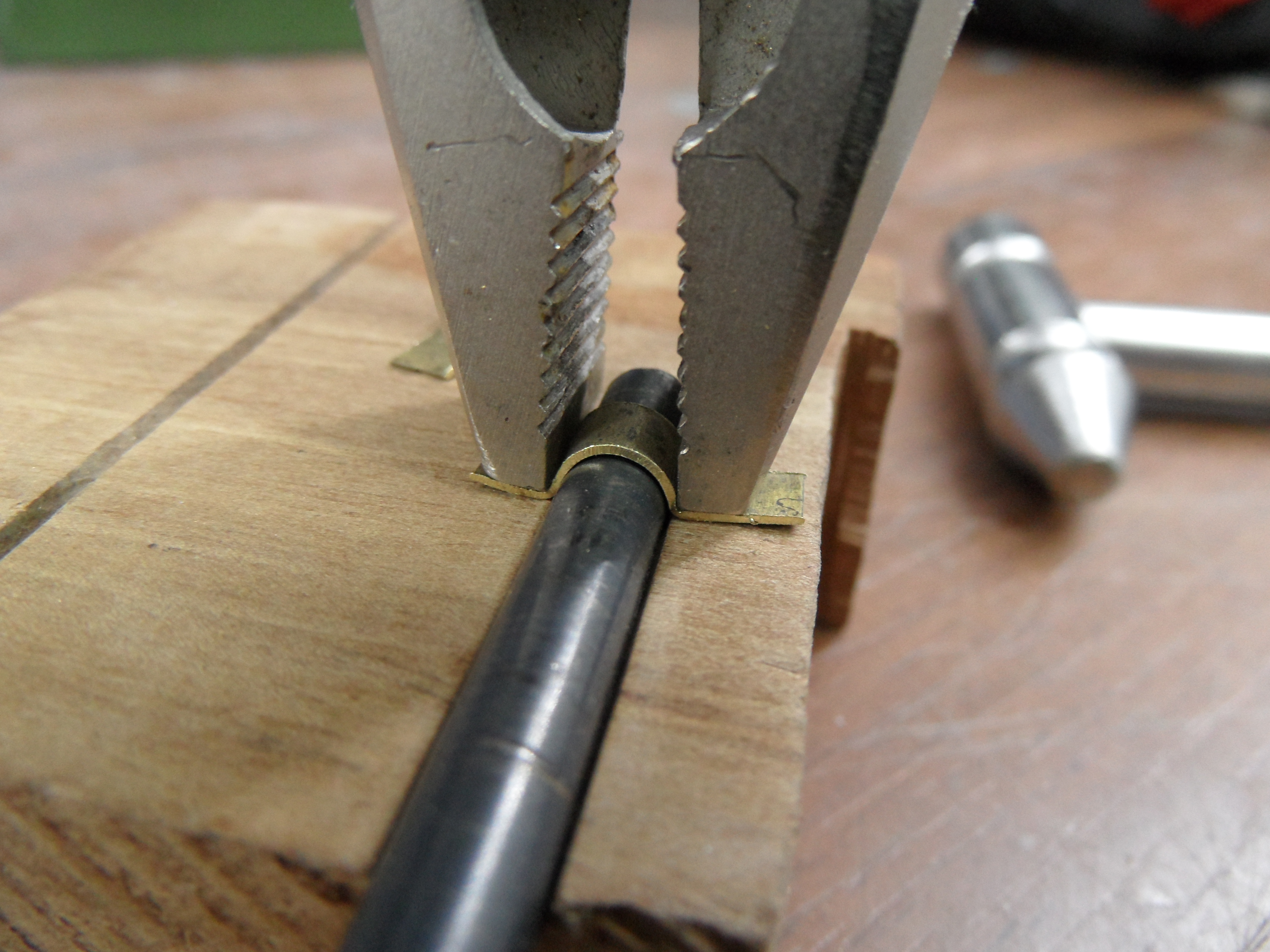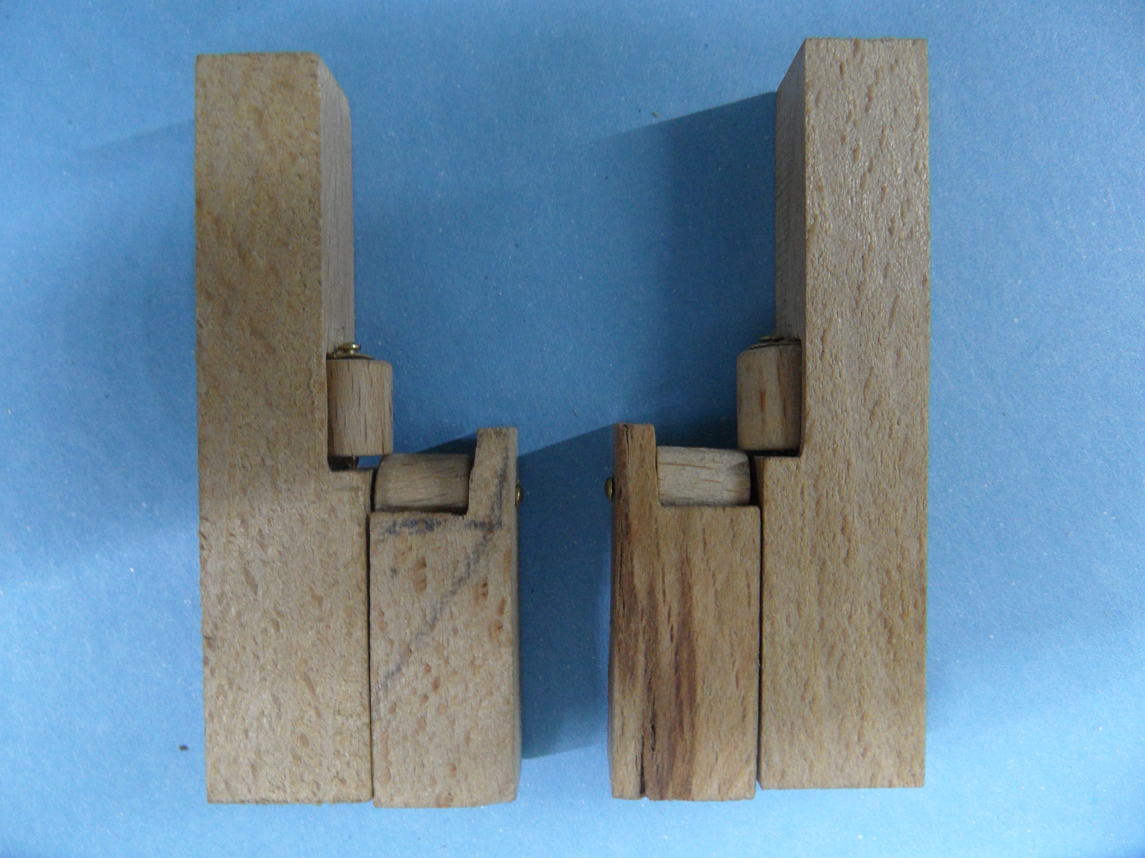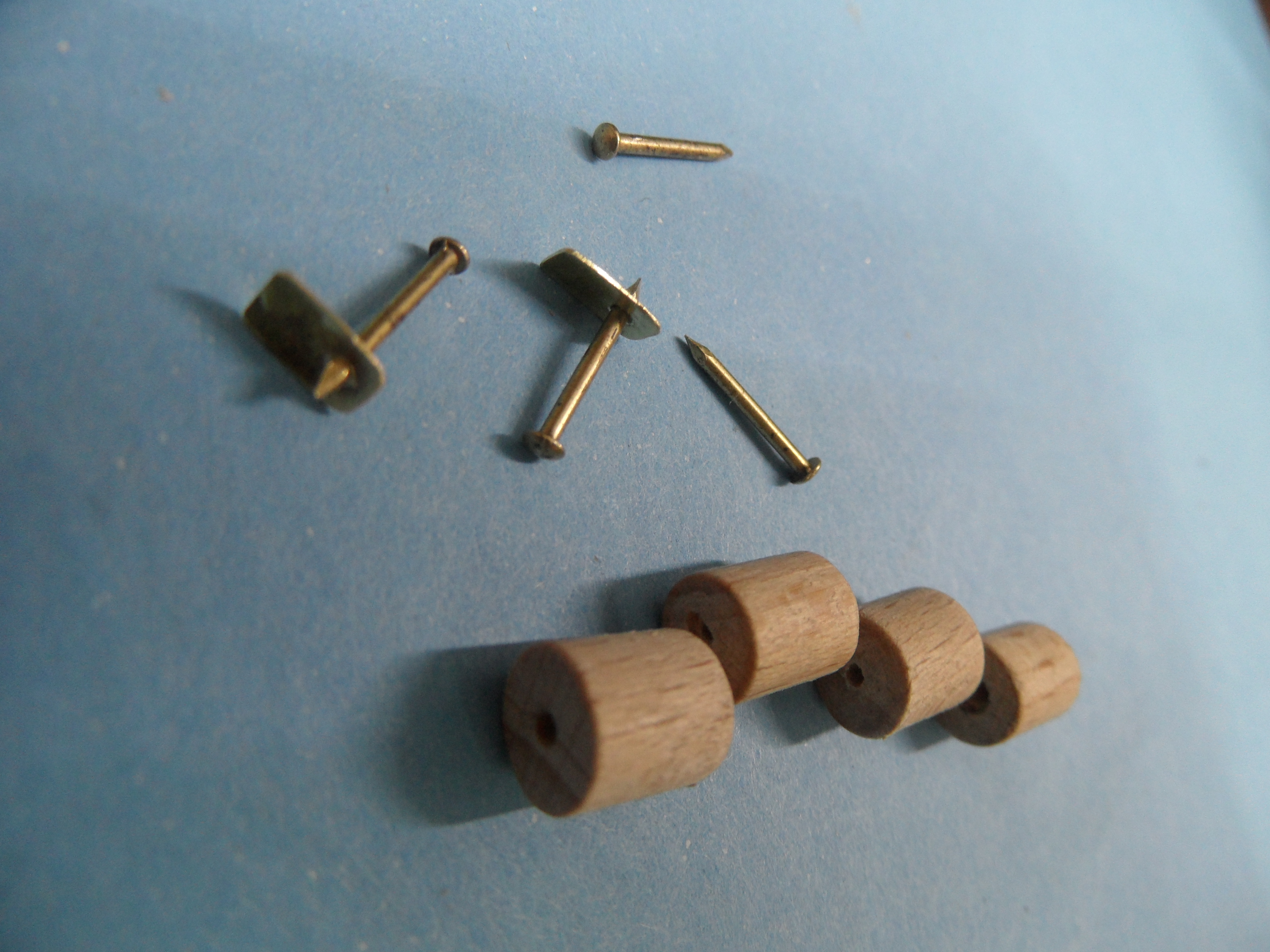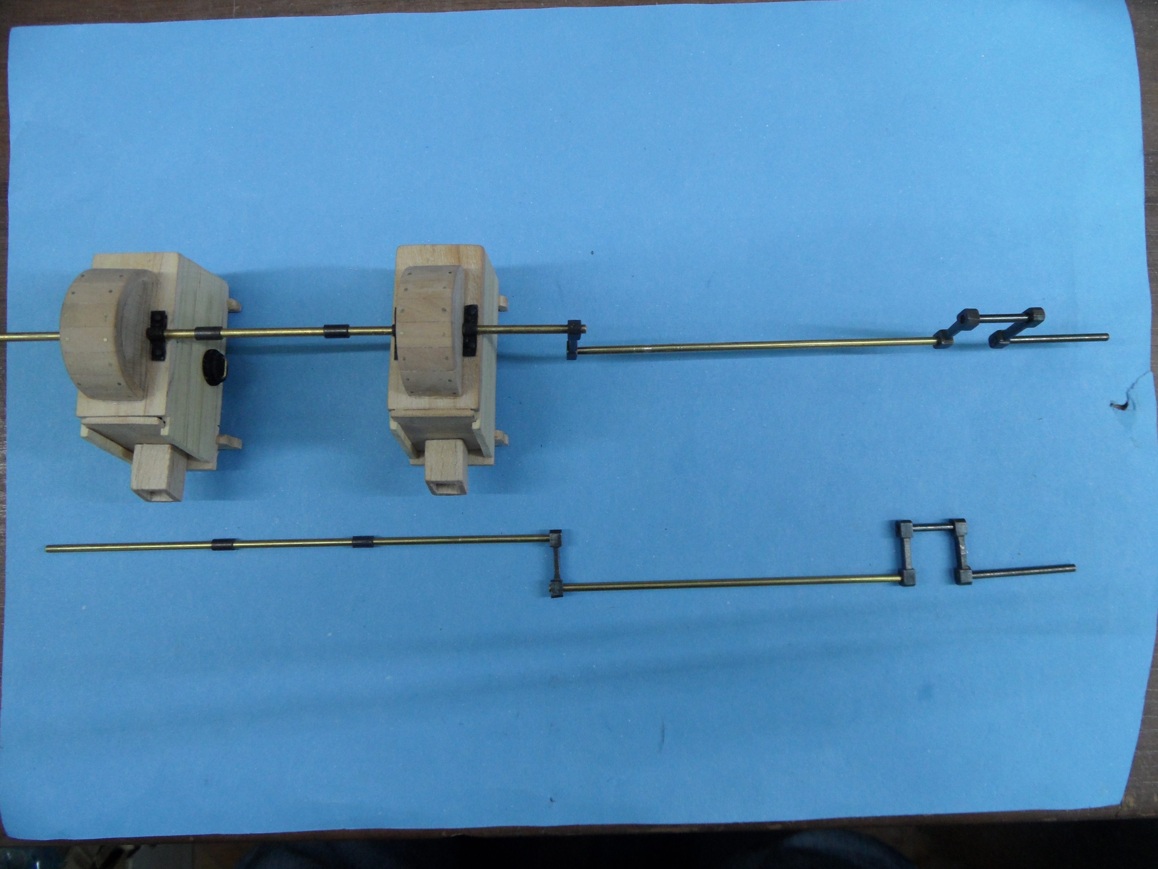c. osie wałków z gwoździ mosiądzowanych, a uchwyty rolki w belce pionowej z blaszki mosiężnej gr. 0,7 mm.