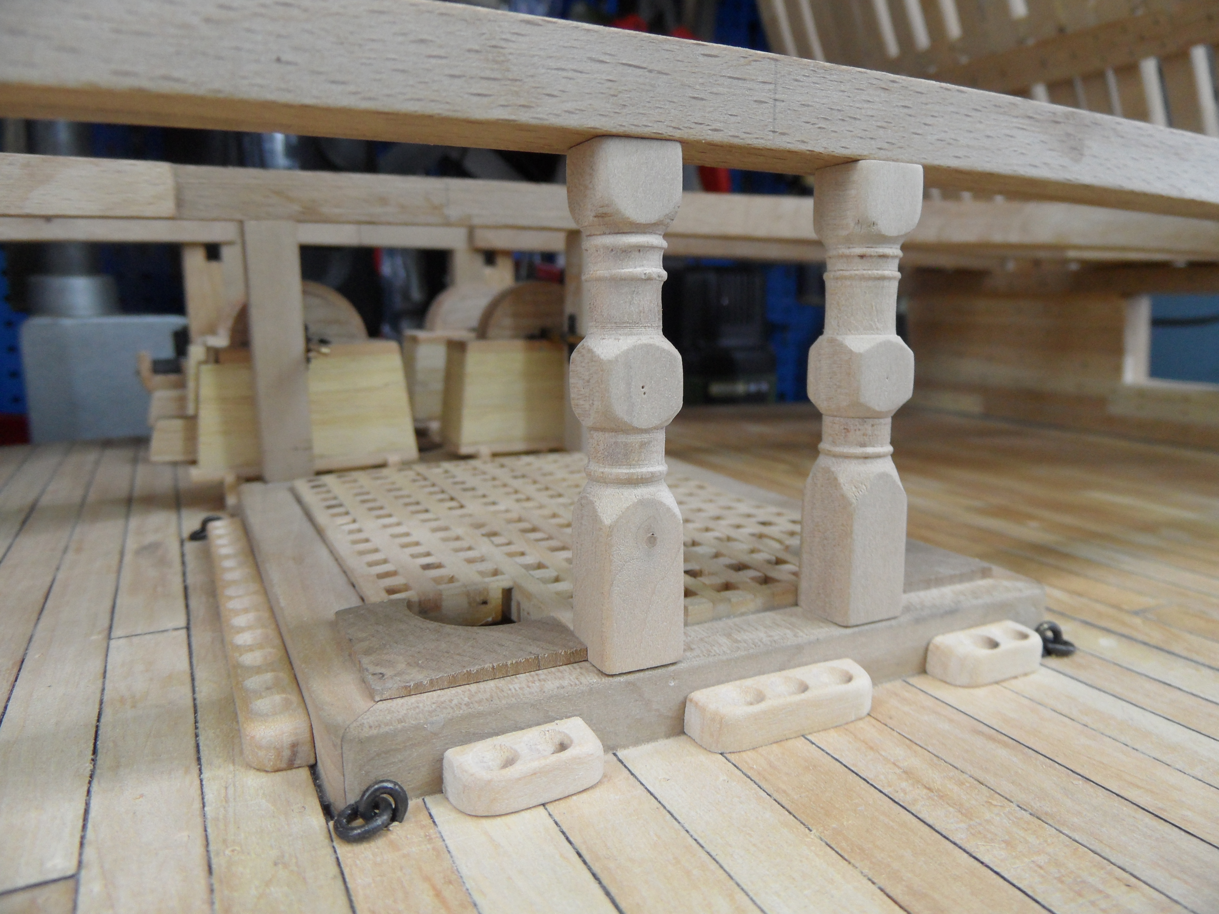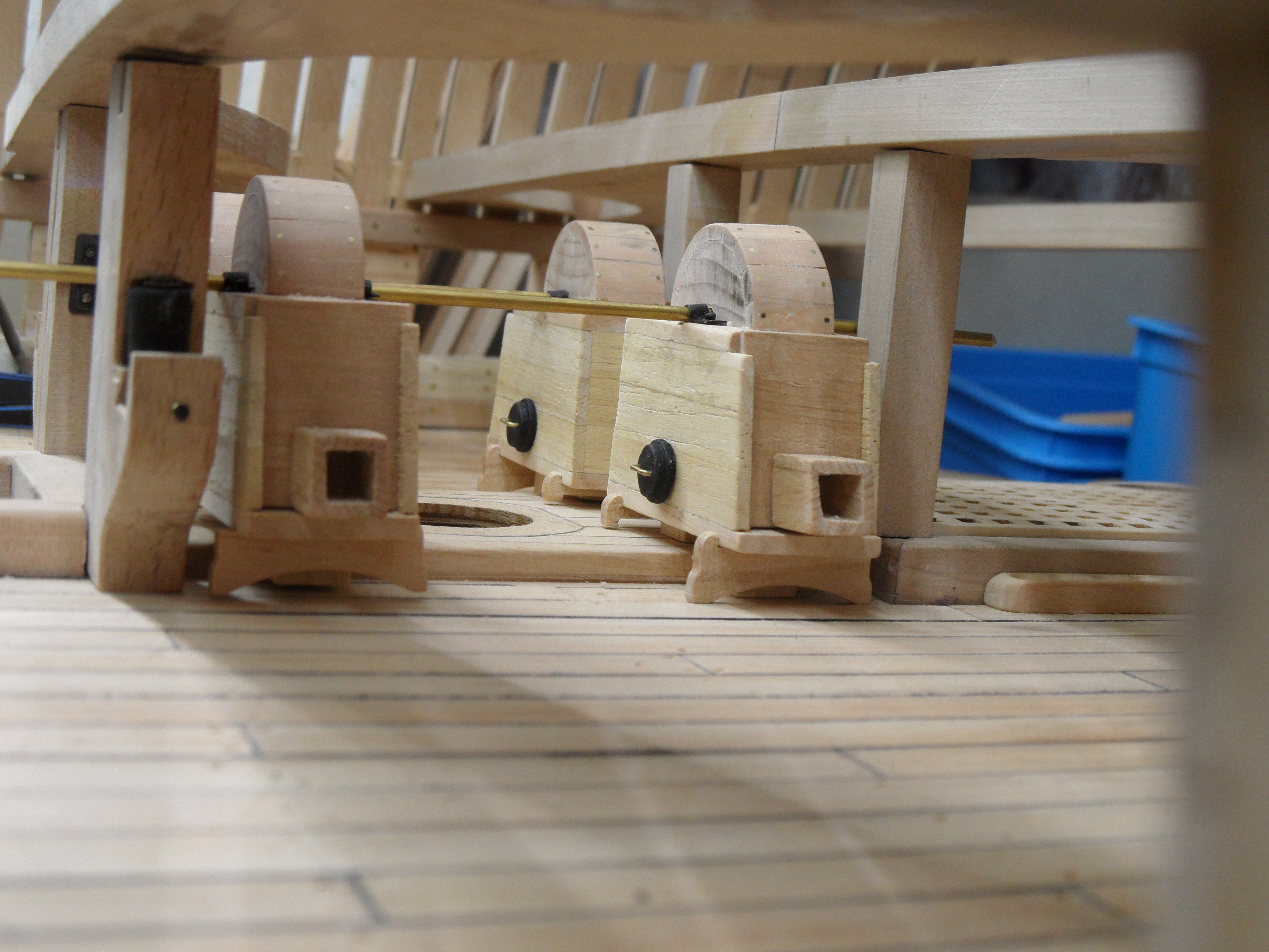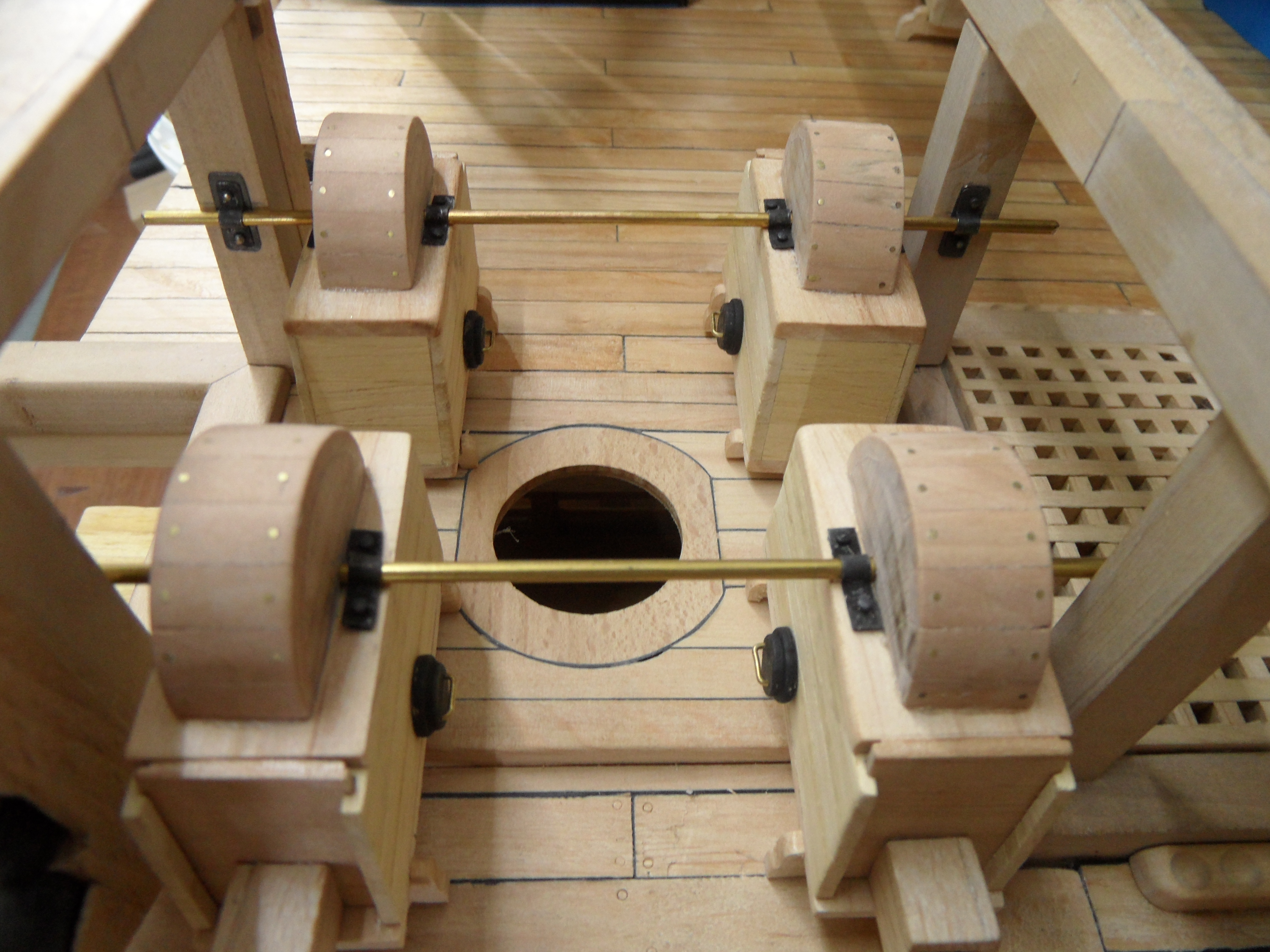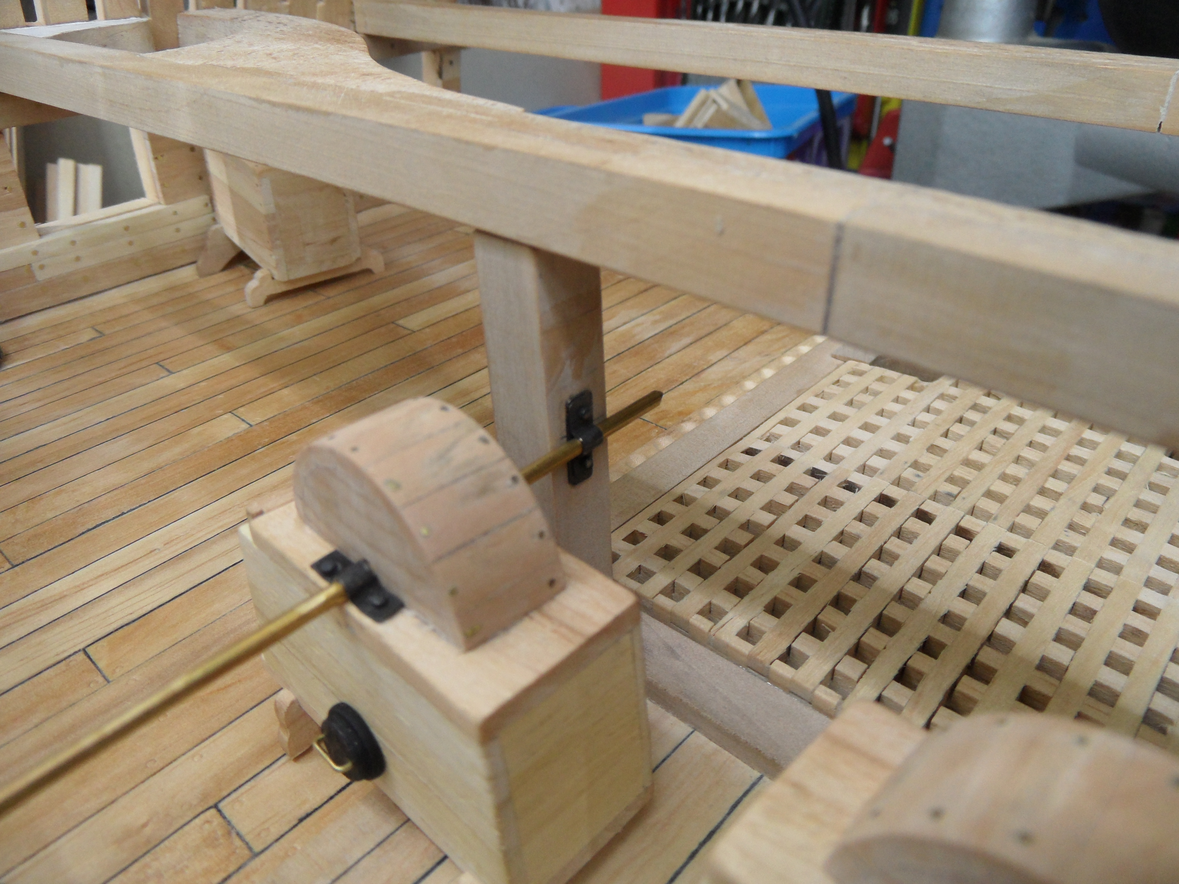 Wykonałem również próbę zmajstrowania uchwytów do korb pomp umieszczonych na belkach podtrzymujących pokładniki wyższego pokładu.