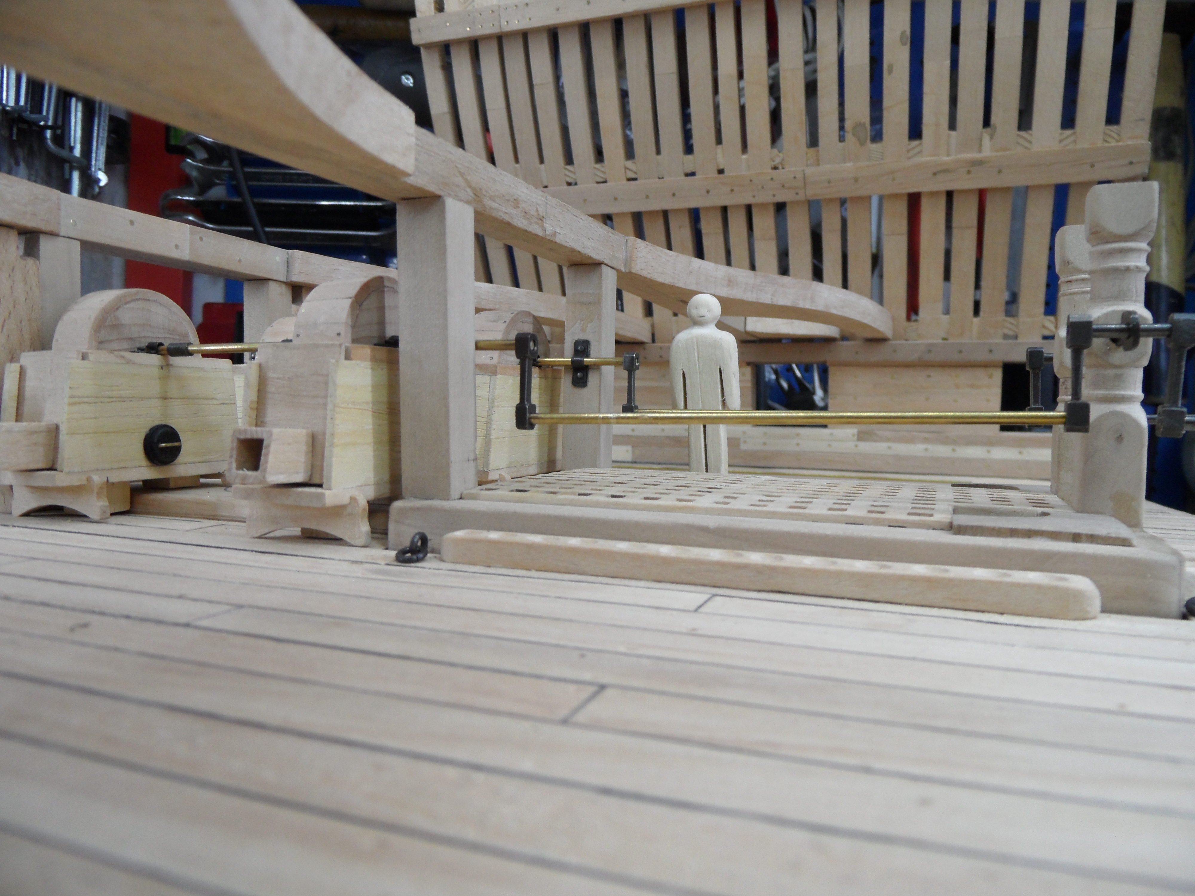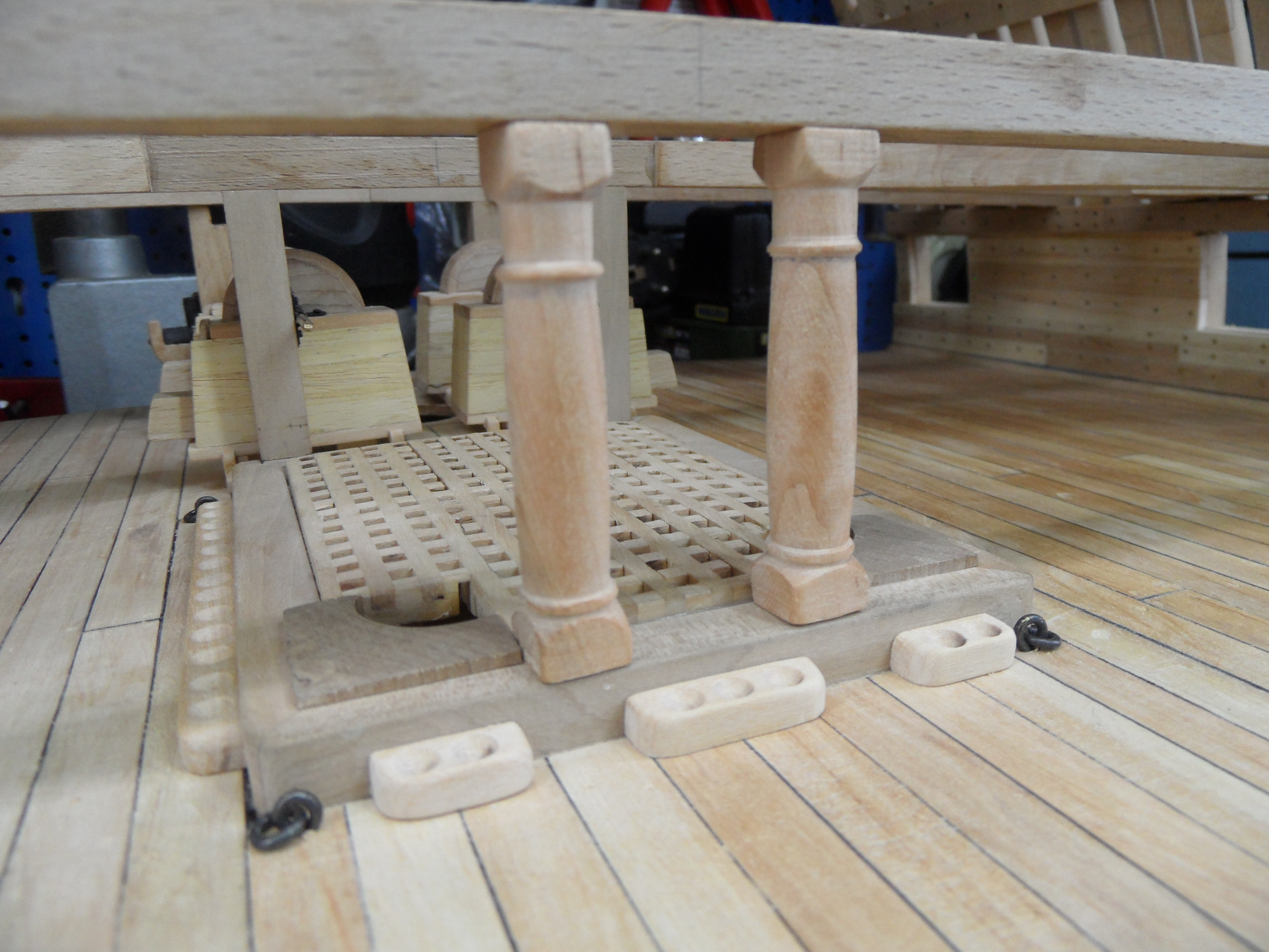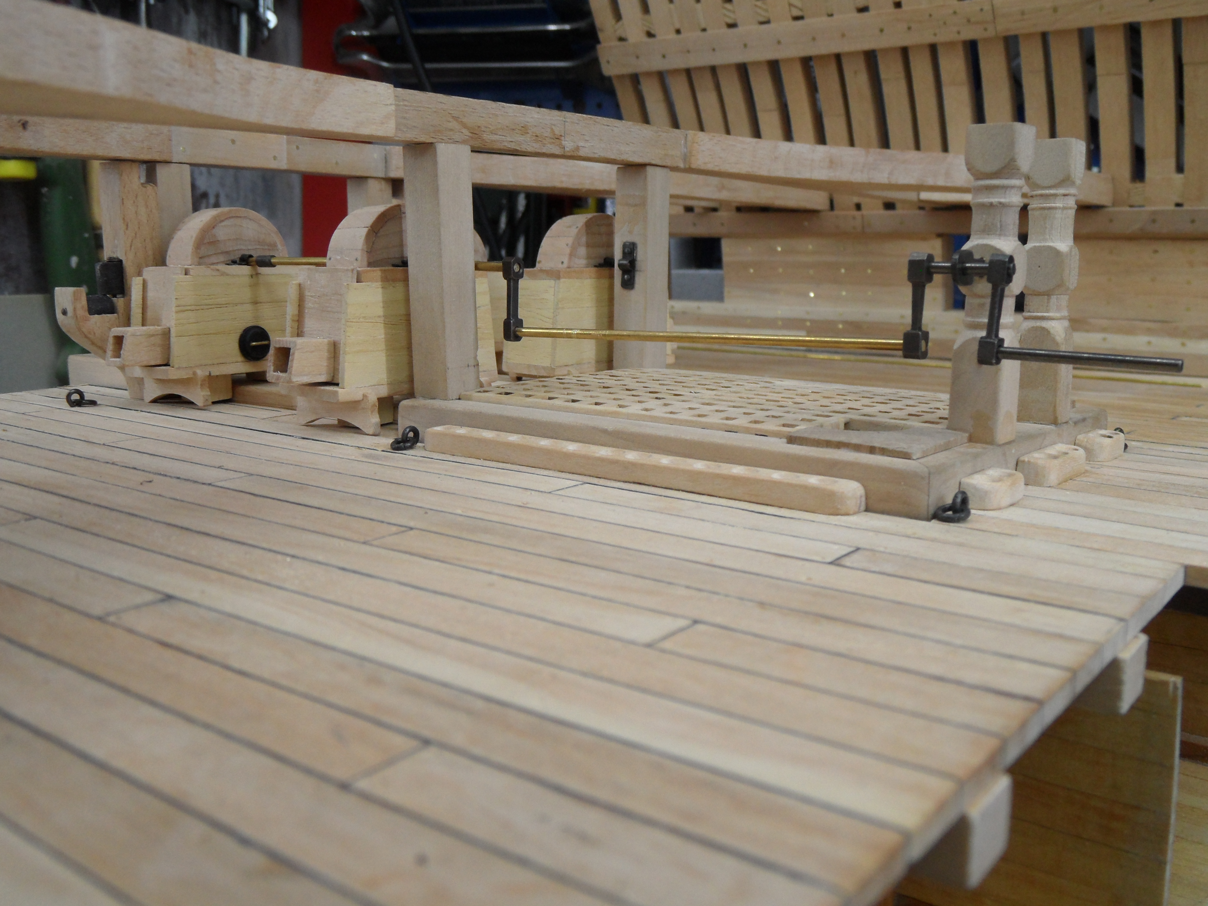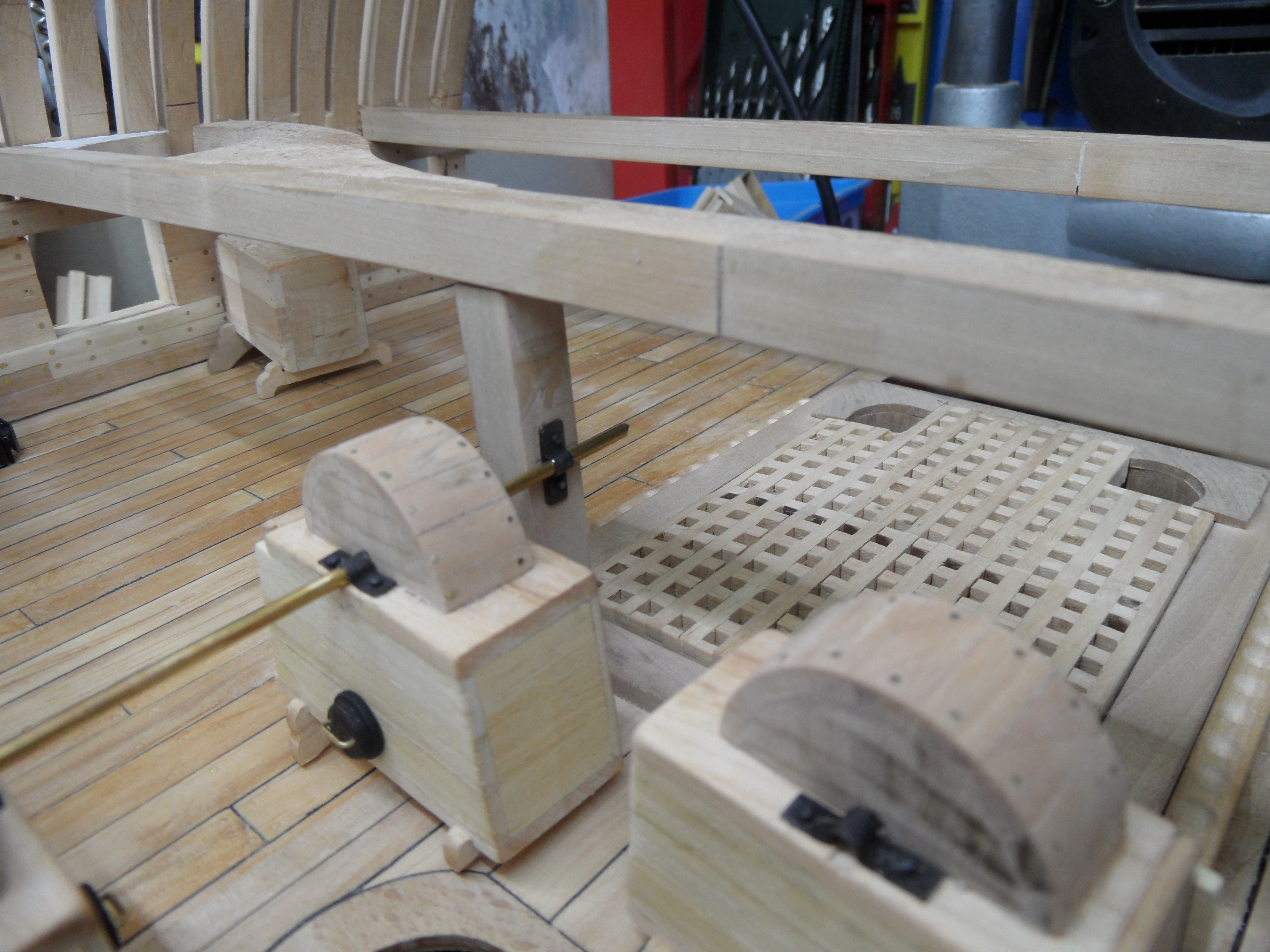 Wykonałem również próbę zmajstrowania uchwytów do korb pomp umieszczonych na belkach podtrzymujących pokładniki wyższego pokładu.