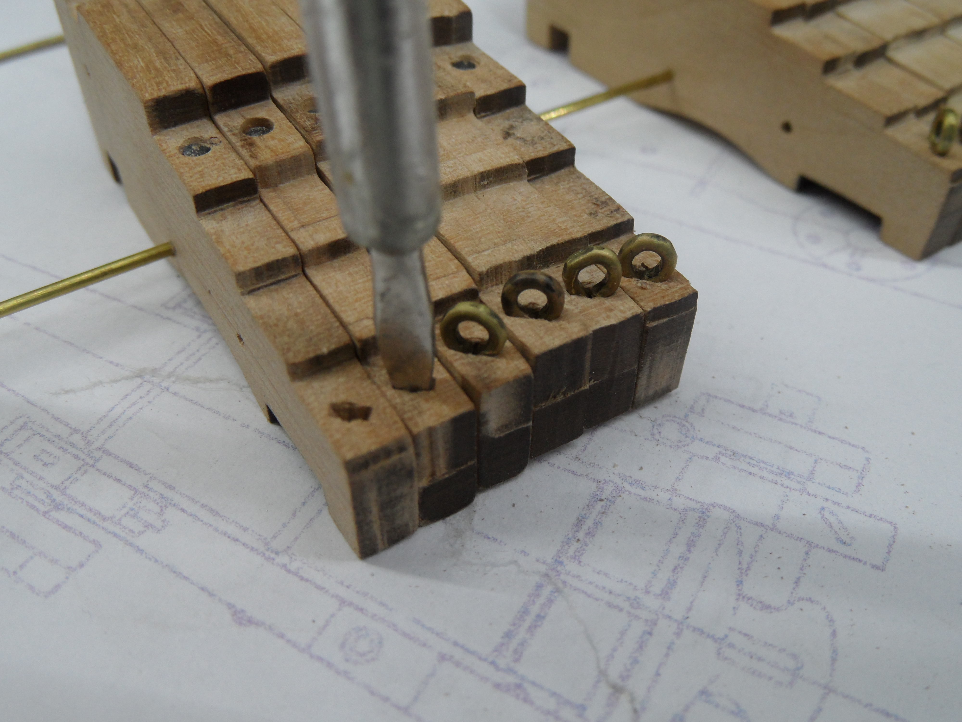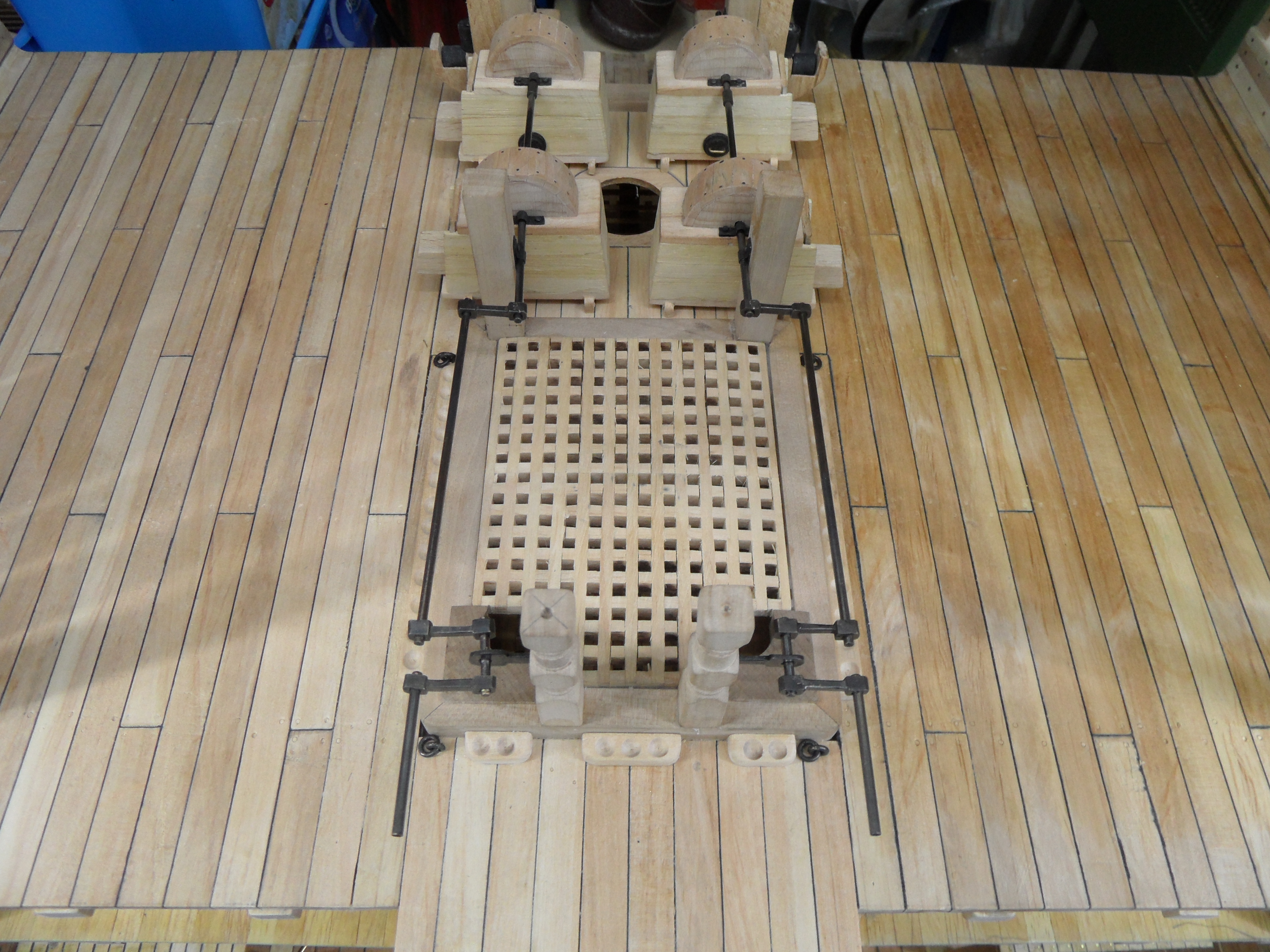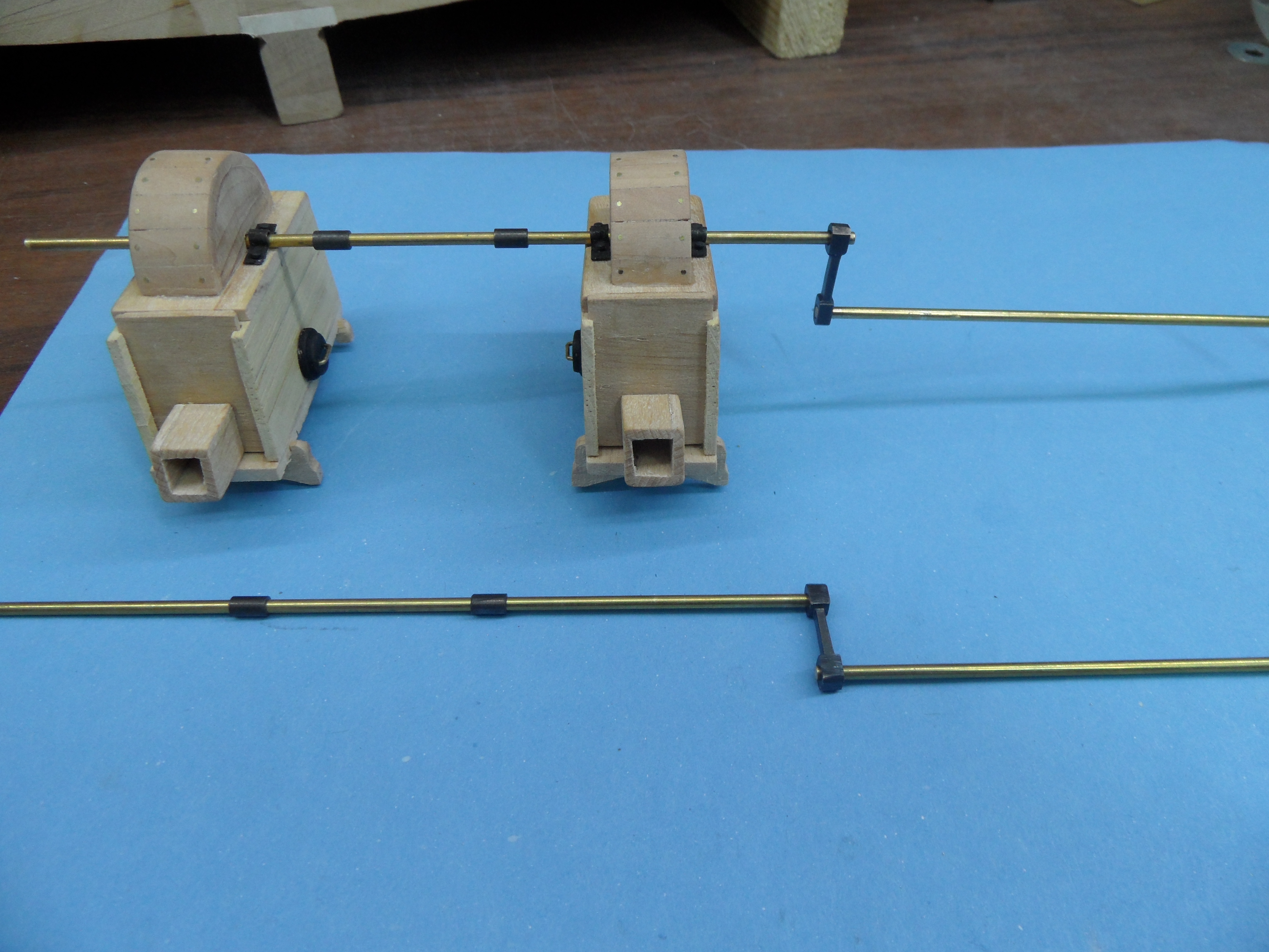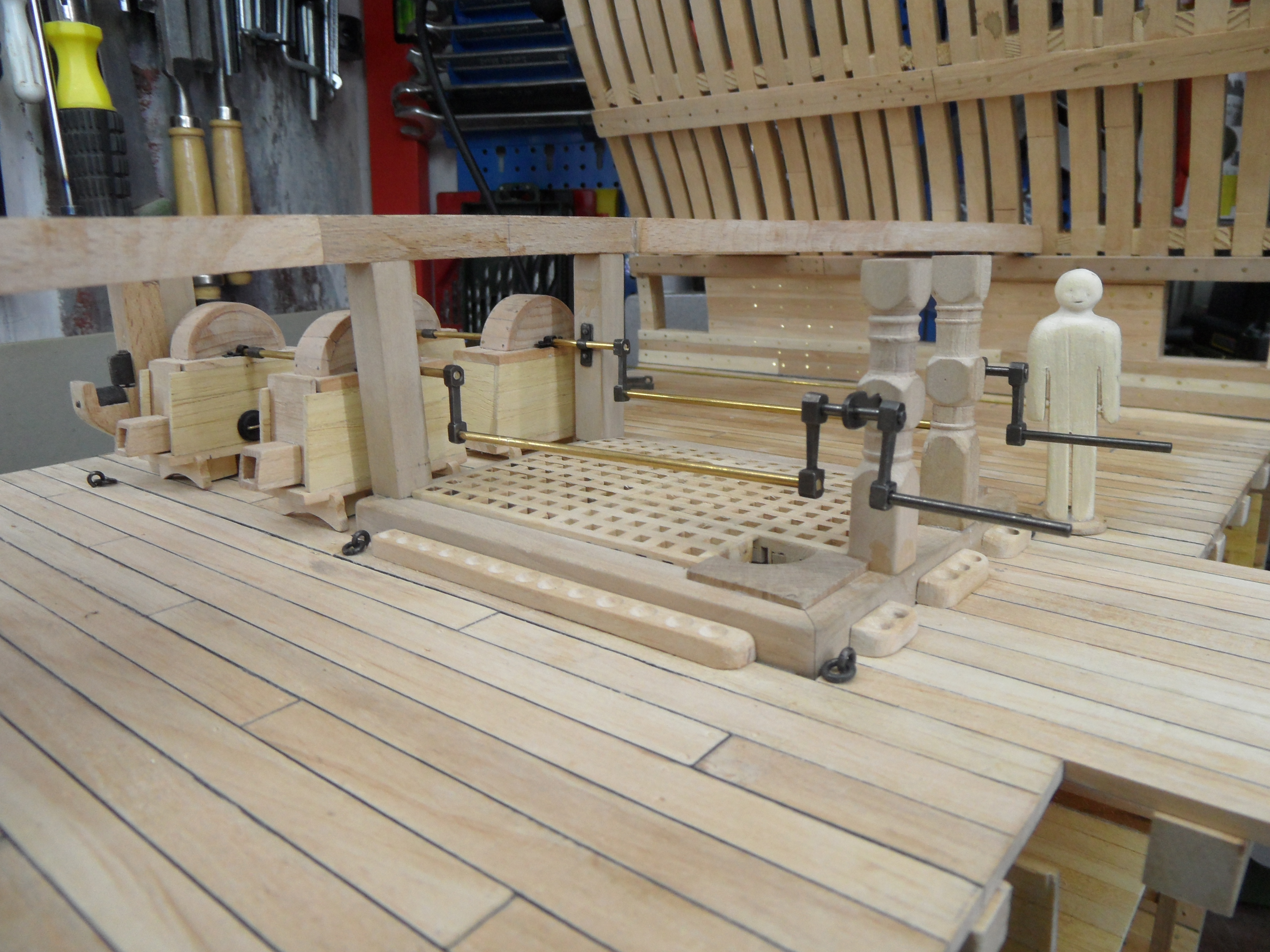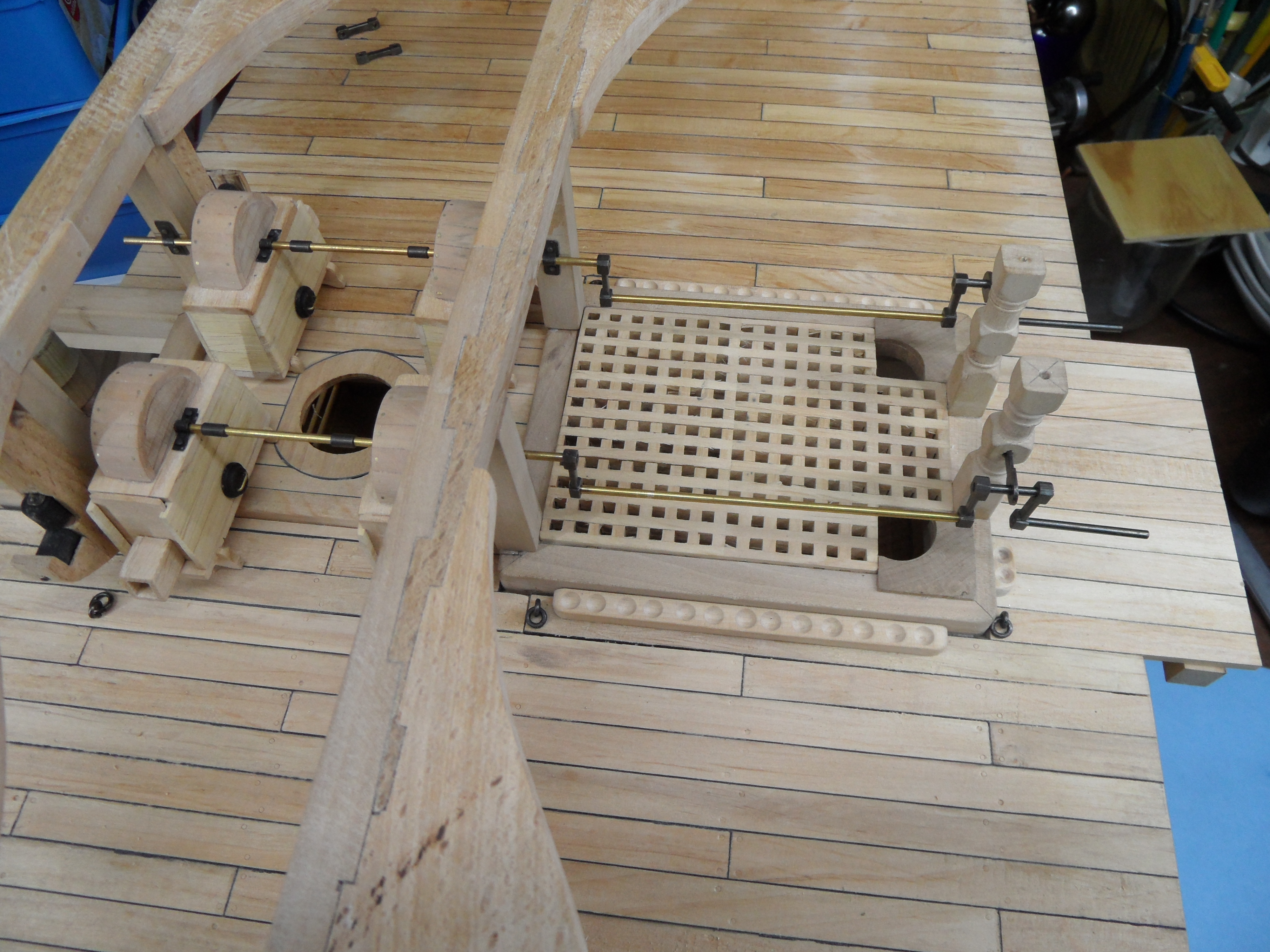 Wykonałem również próbę zmajstrowania uchwytów do korb pomp umieszczonych na belkach podtrzymujących pokładniki wyższego pokładu.