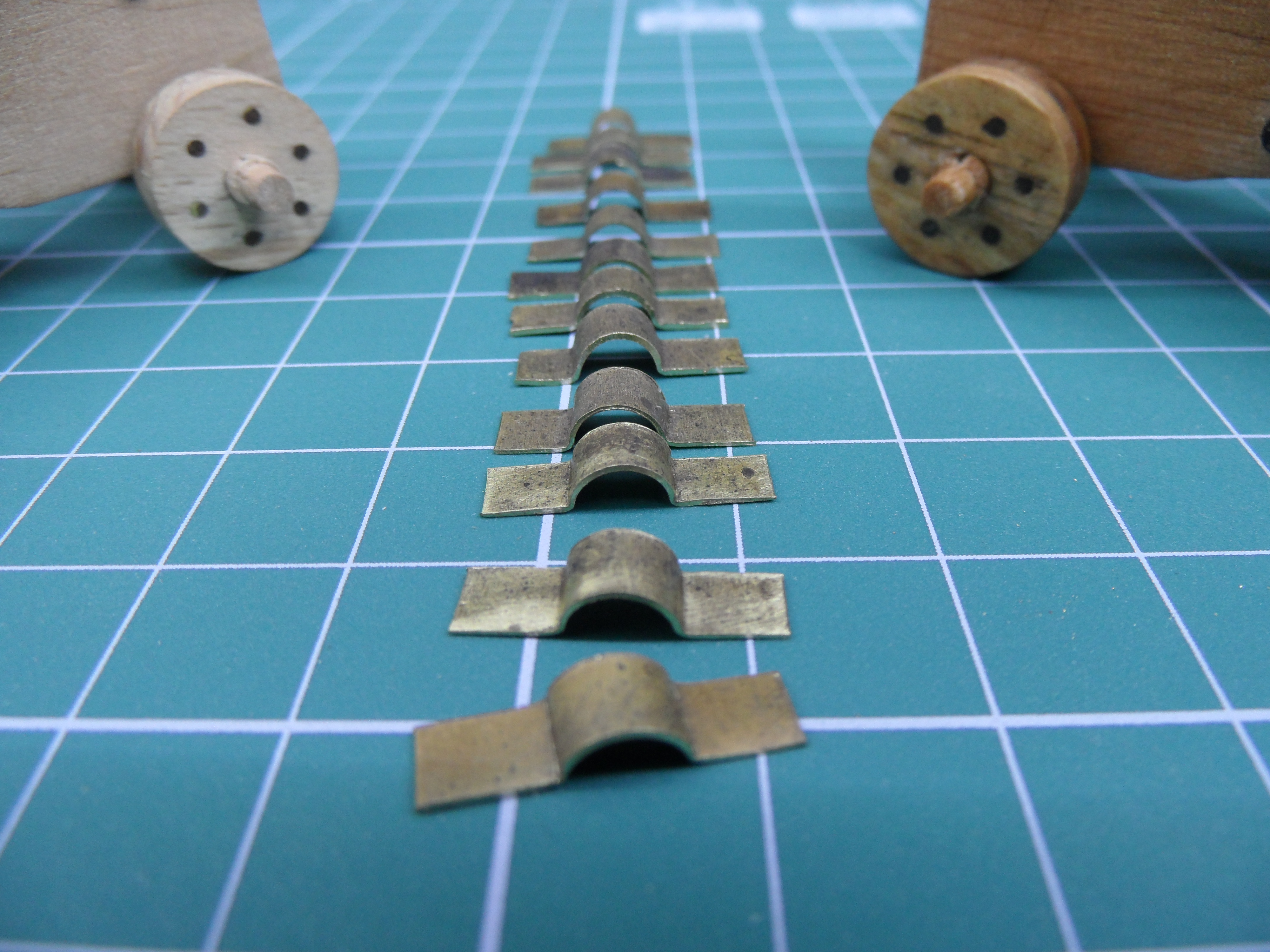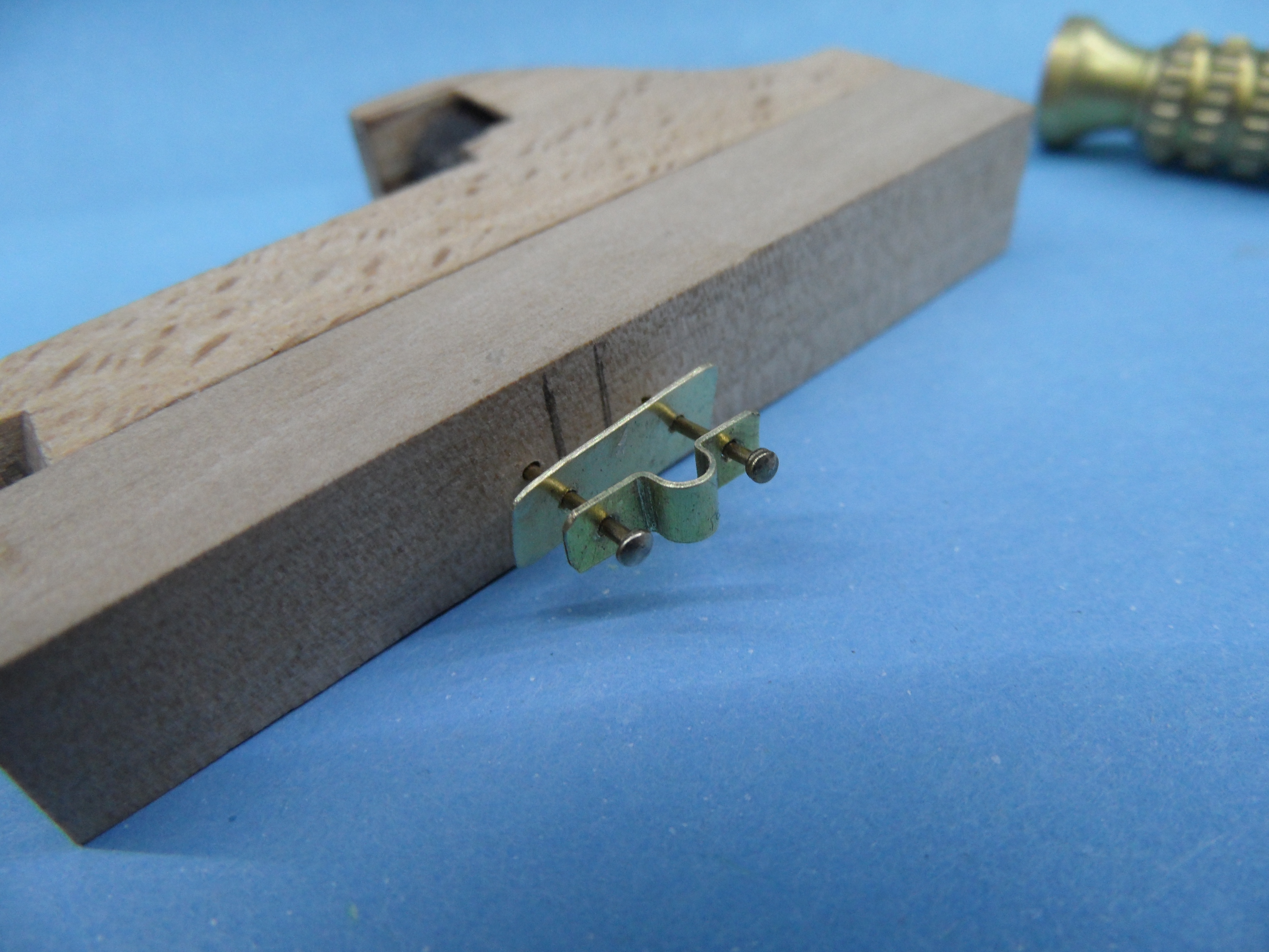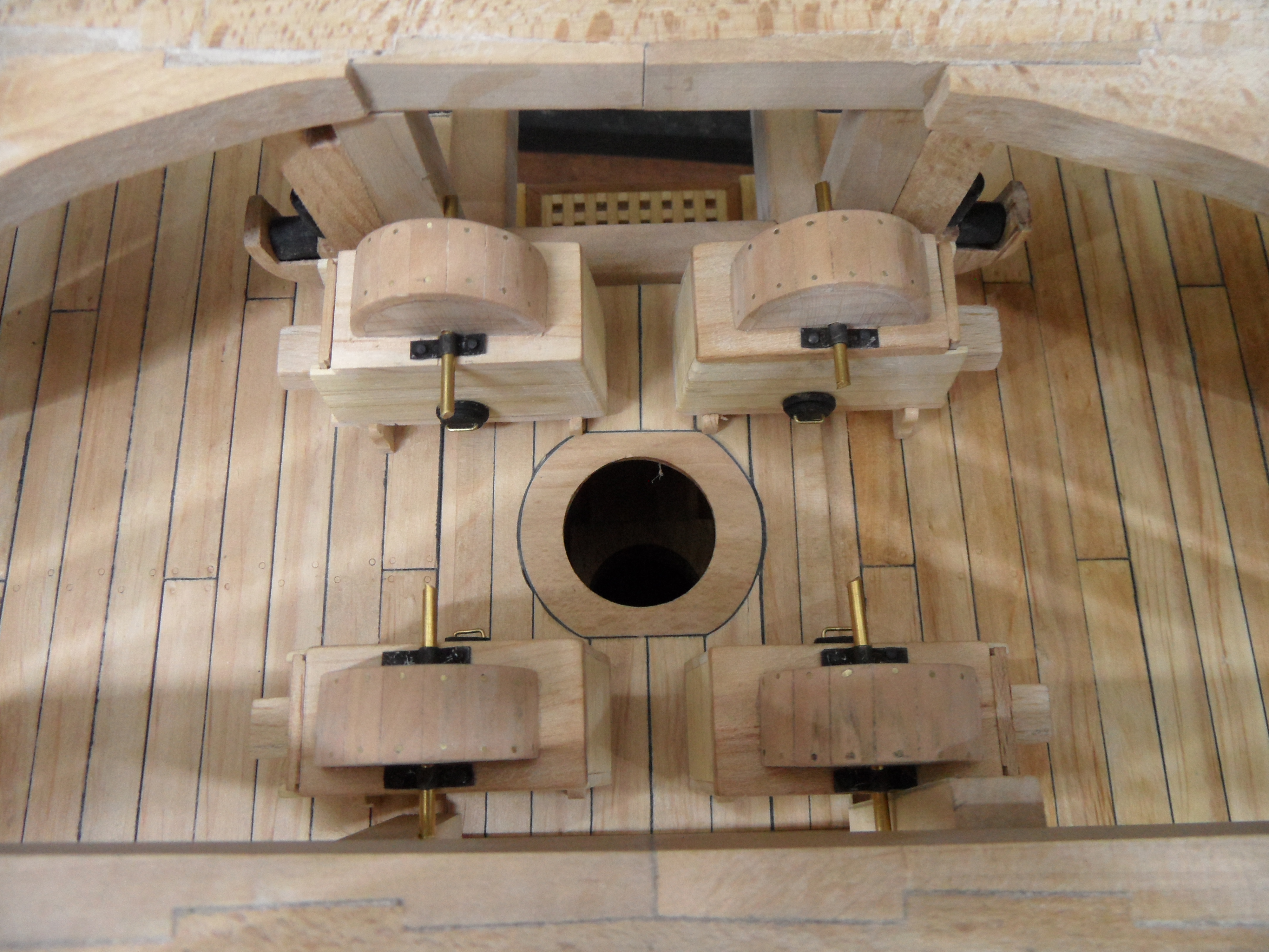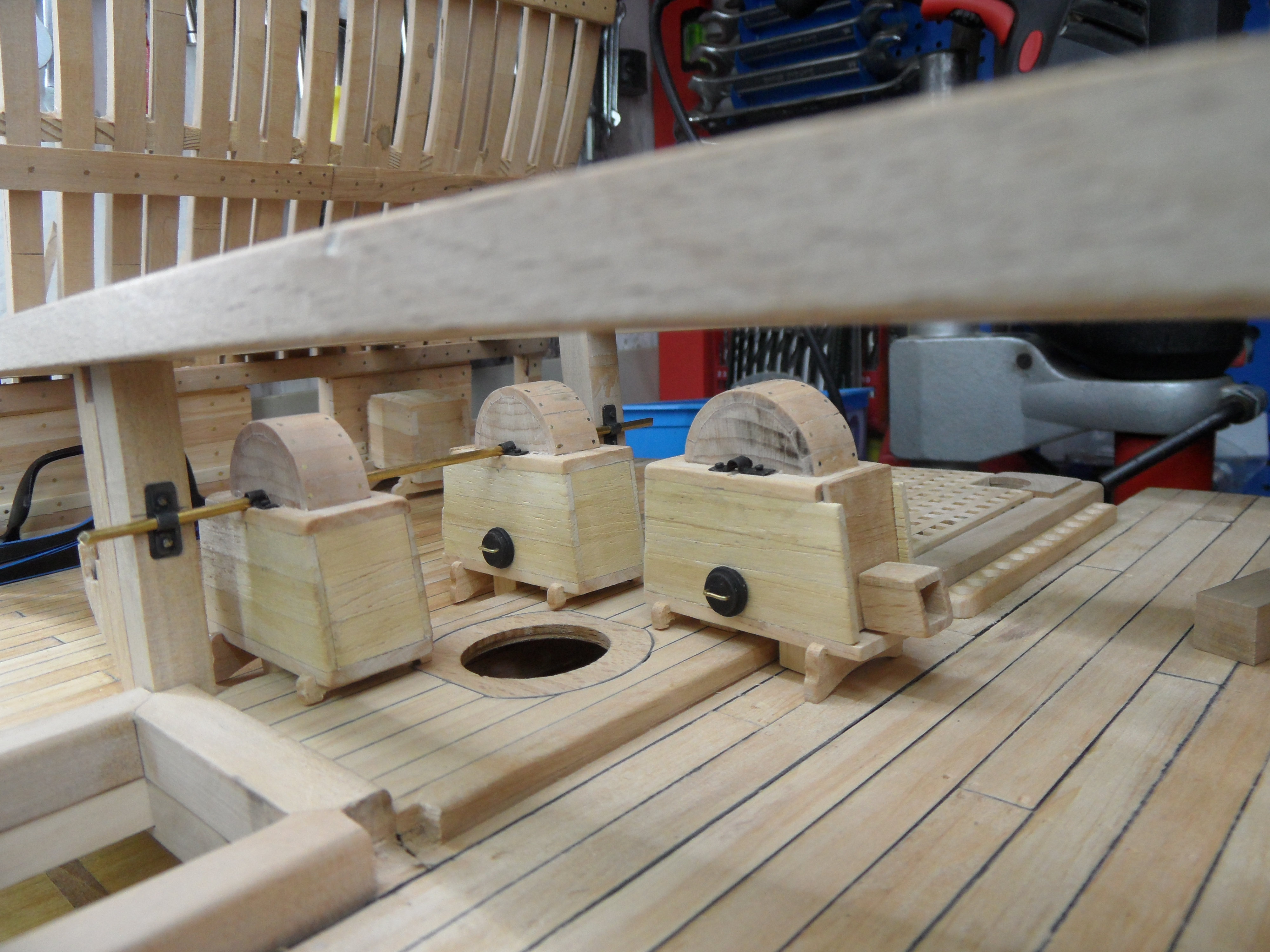 Wykonałem również próbę zmajstrowania uchwytów do korb pomp umieszczonych na belkach podtrzymujących pokładniki wyższego pokładu.