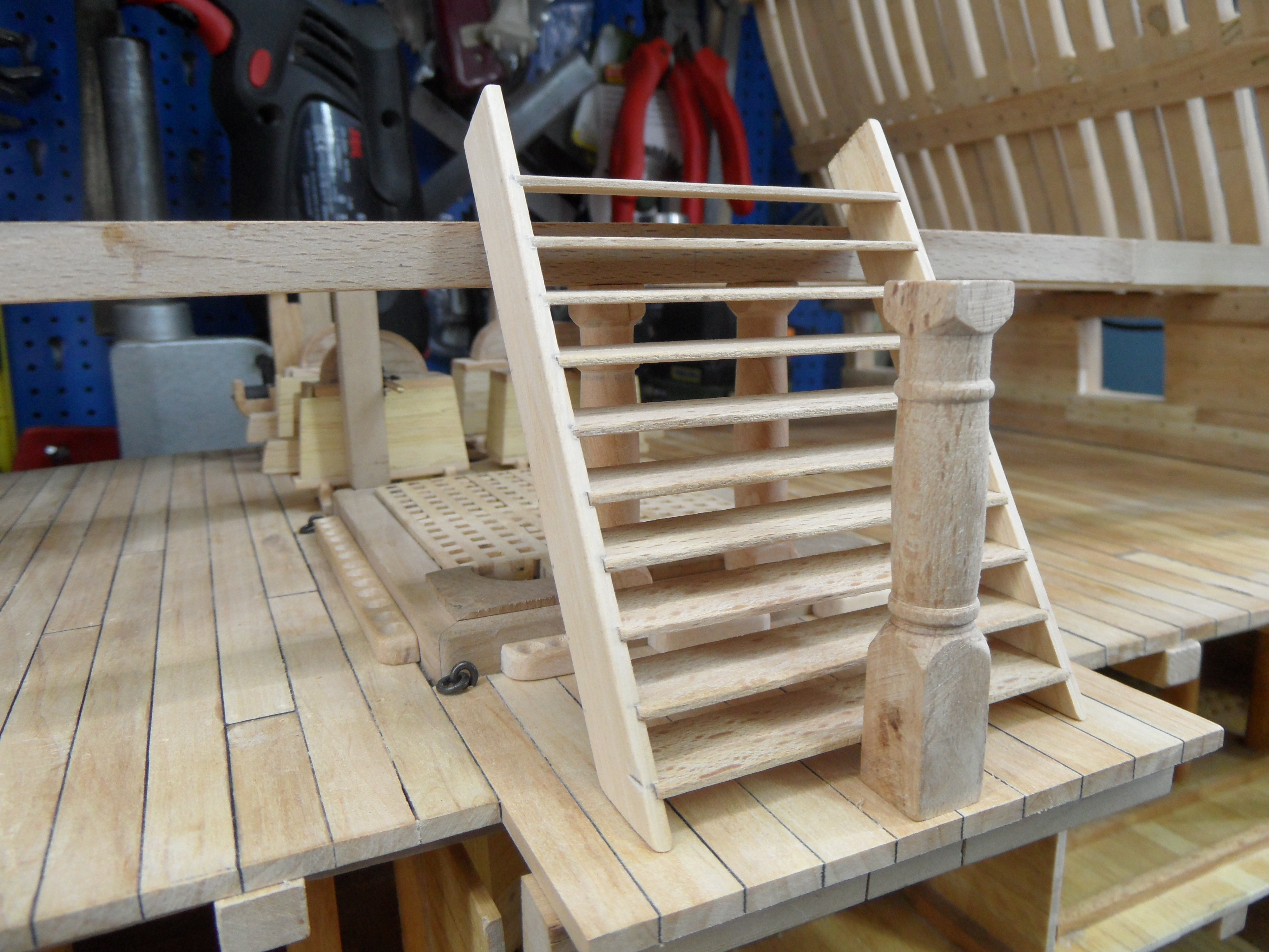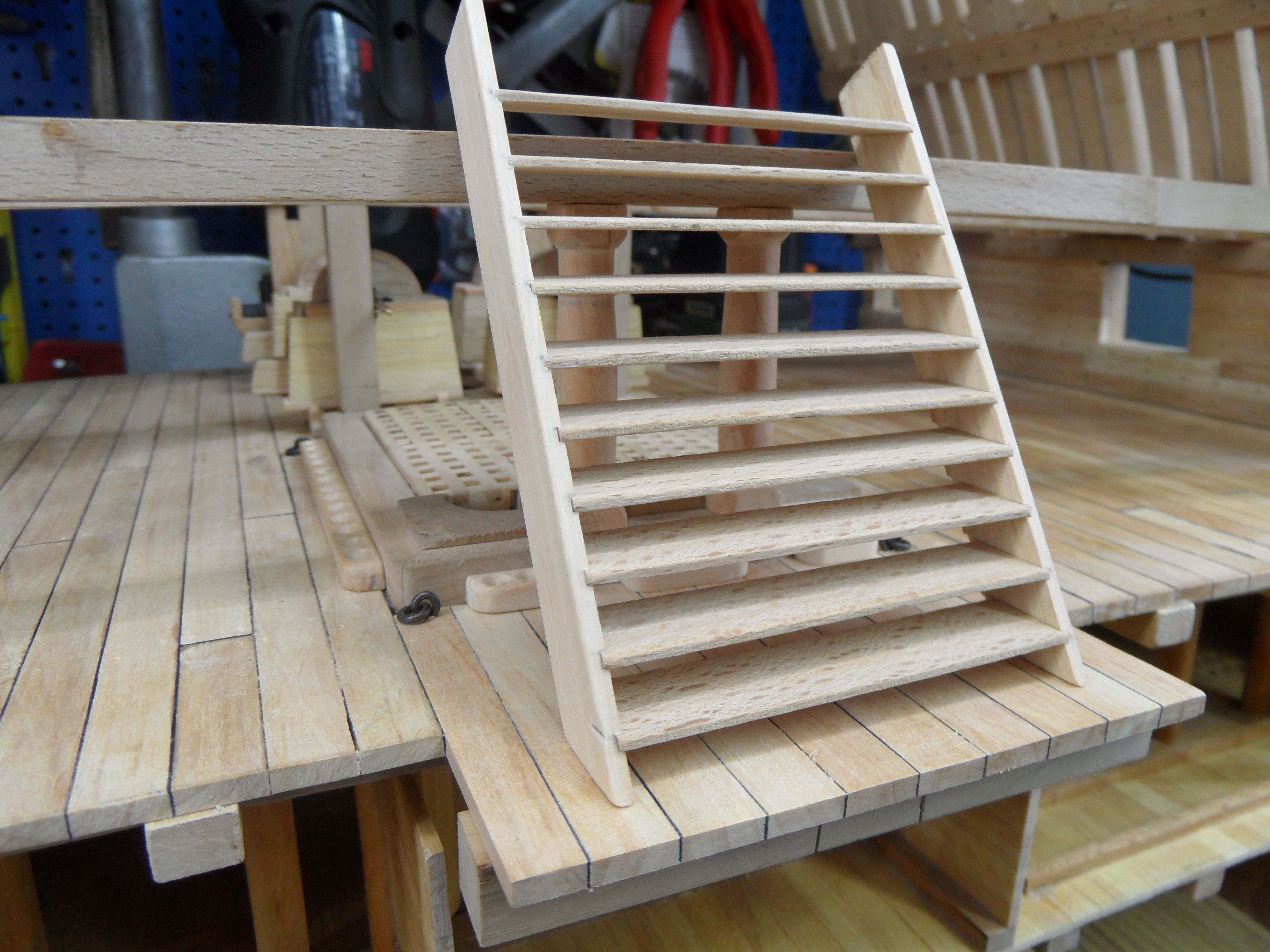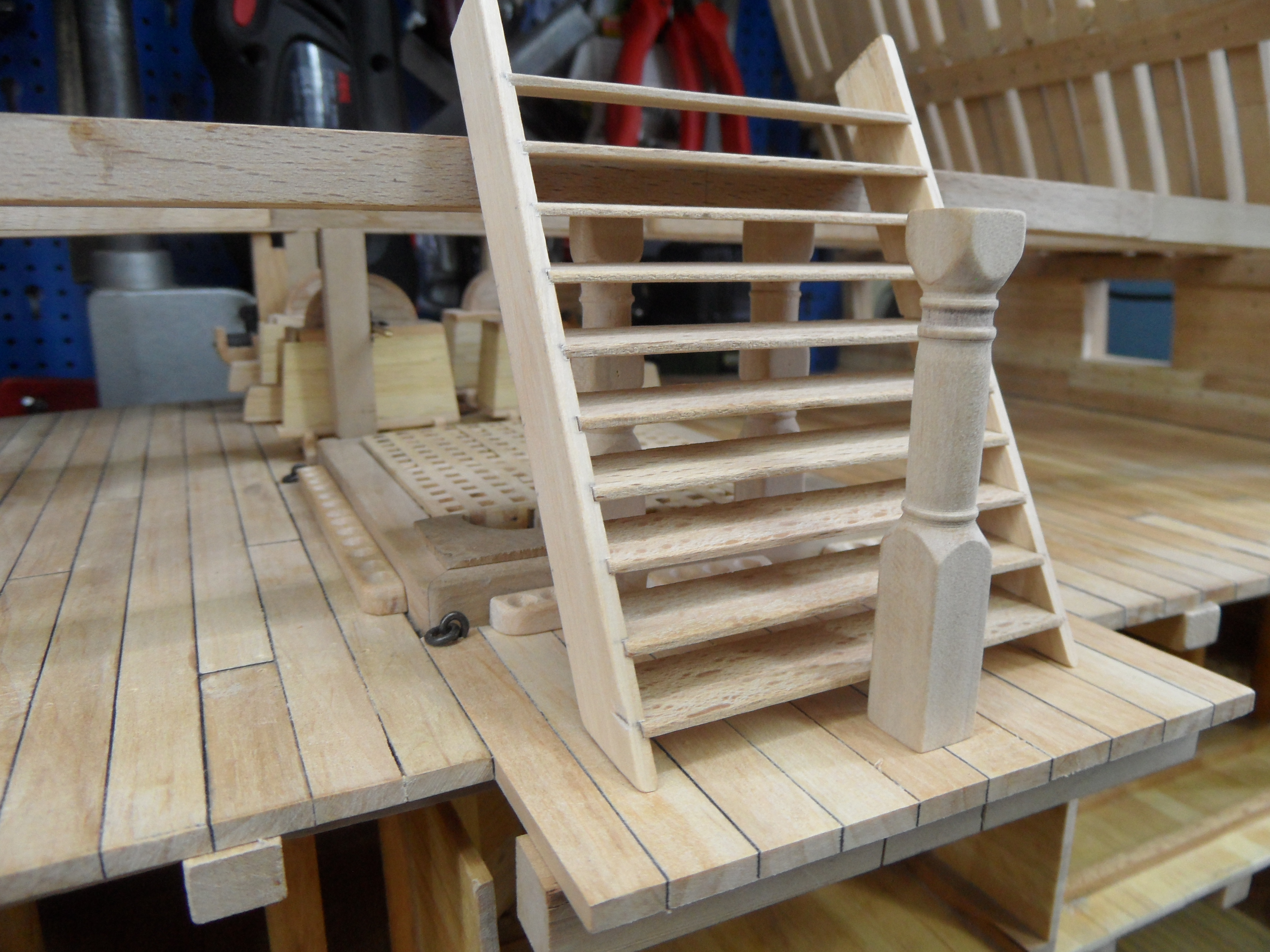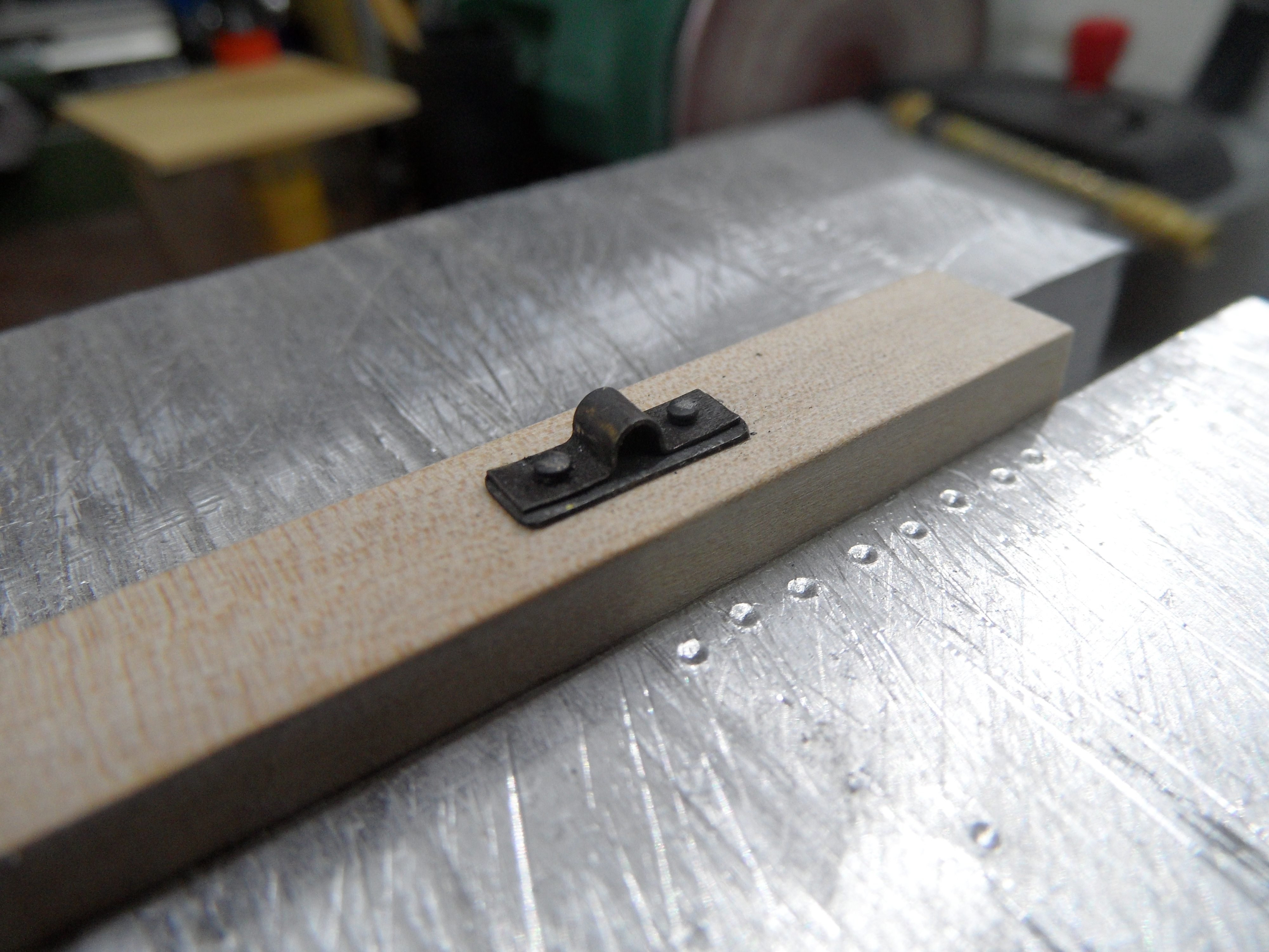 Wykonałem również próbę zmajstrowania uchwytów do korb pomp umieszczonych na belkach podtrzymujących pokładniki wyższego pokładu.