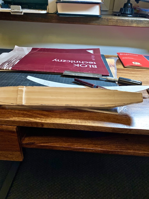 Biorąc pod uwagę obecny stan umiejętności stwierdziłem, że najprostszą metodą będzie wystruganie pełnego kadłuba. Oczywiście nawet tak trywialna kwestia okazała się prosta jedynie w teorii. Z braku sensownego kawałka drewna posklejałem kanapkę z deseczek (zdaje się olcha) i balsy. I tu mam pierwsze dwie obserwacje: