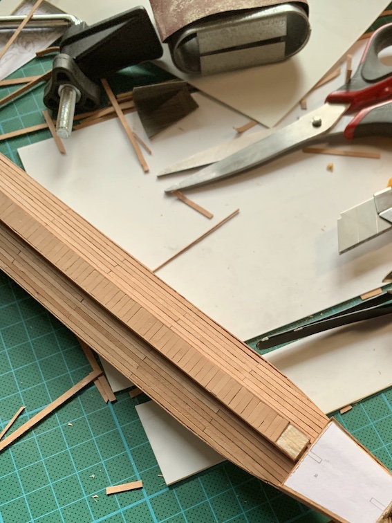 Patent z "cyklinowaniem" pokładu to strzał w 10. Użyłem do tego ostrej żyletki. Oczywiście pewnym problemem jest grubość planek - 0,5 mm. Tutaj wiele nie trzeba, żeby przejść na wylot.