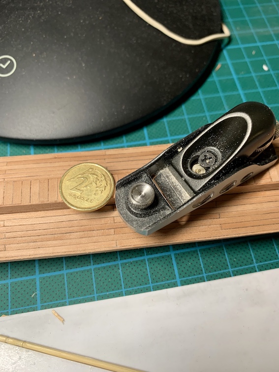 Listewki pociąłem na piłce proxxonowej na szerokość odpowiednio 1,8 mm (kładka nad pokładem właściwym) i 1,3 mm pokład właściwy.
