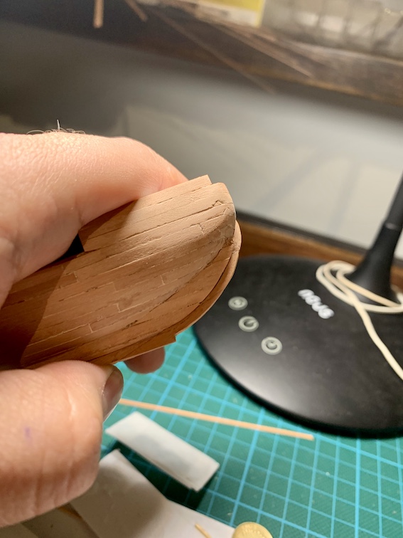 - poszywanie nawet w formie tak ułatwionej jak ja sobie zafundowałem - na pełnym kadłubie nie jest tak proste jak się wydawało :lol: gięcie na gorąco listewek gruszy o grubości 0,5 mm to przyjemność ale wyprofilowanie rufy mojej galery ze względu na niewielki promień wybrzuszeń to był koszmarek. Druga uwaga to nic się samo nie dopasuje i nie zamaskuje. Albo idealnie leży albo jest i będzie kłopot.