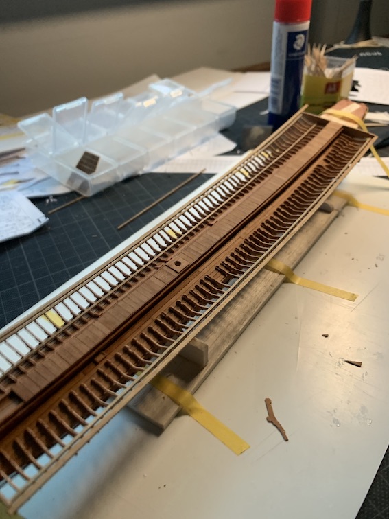 Skończyłem klejenie wsporników na obu burtach. Niestety ten etap jest kroniką porażek. Trzeba było to inaczej robić, czyli pojedyńczo z indywidualnym pasowaniem, a nie od razu cała burta bo rozeszło się wszystko w swoją stronę. Zostało ratowanie co dało wyniki jakośtam akceptowalne na tym poziomie moich umiejętności. Podstawowym problemem jest obróbka precyzyjna tak małych i powtarzalnych elementów. Pasek gruszy o grubości 0,6 mm kruszy się niemiłosiernie i nawet zachowując najwyższą ostrożność póki co nie opanowałem właściwej techniki.