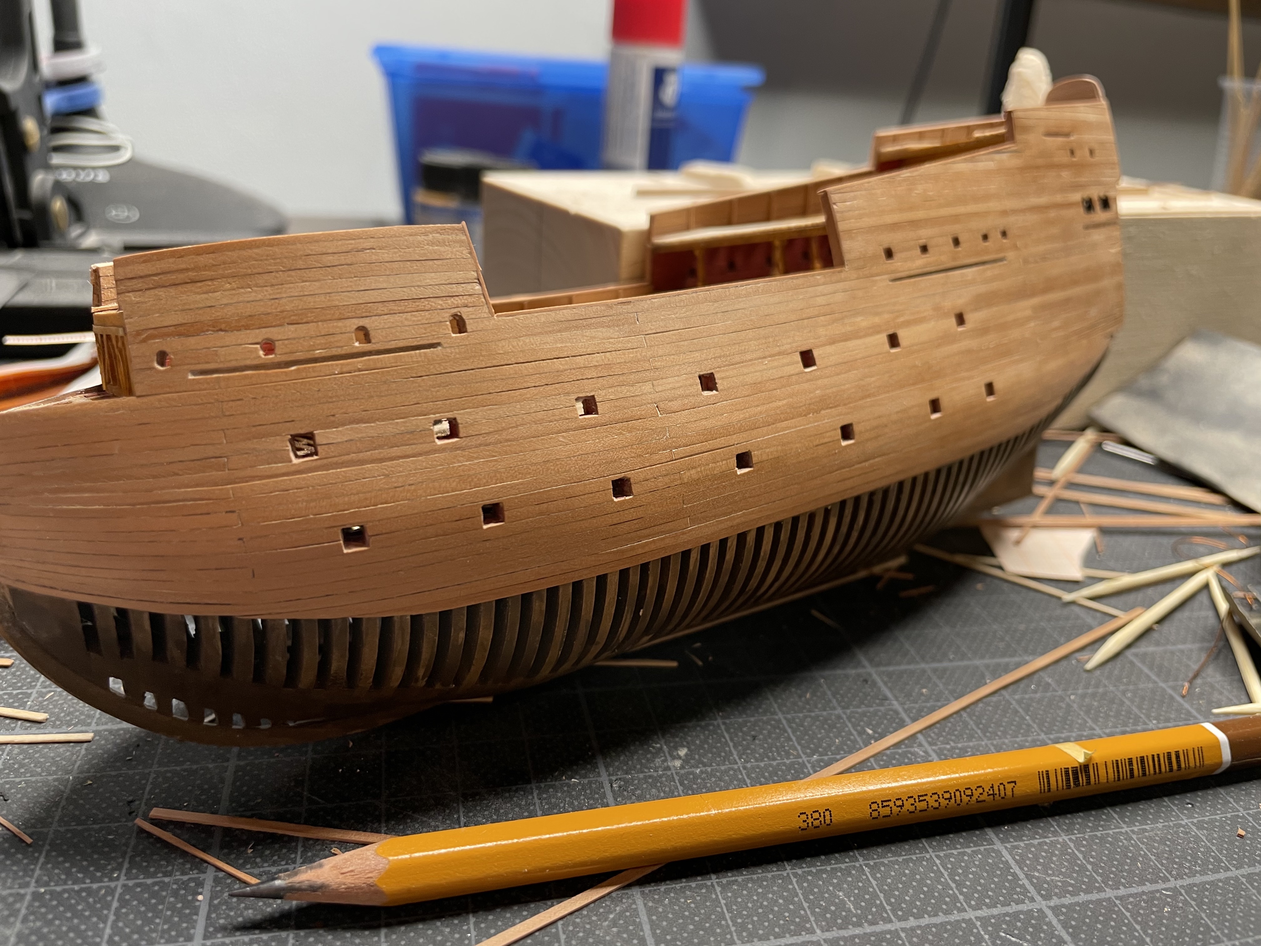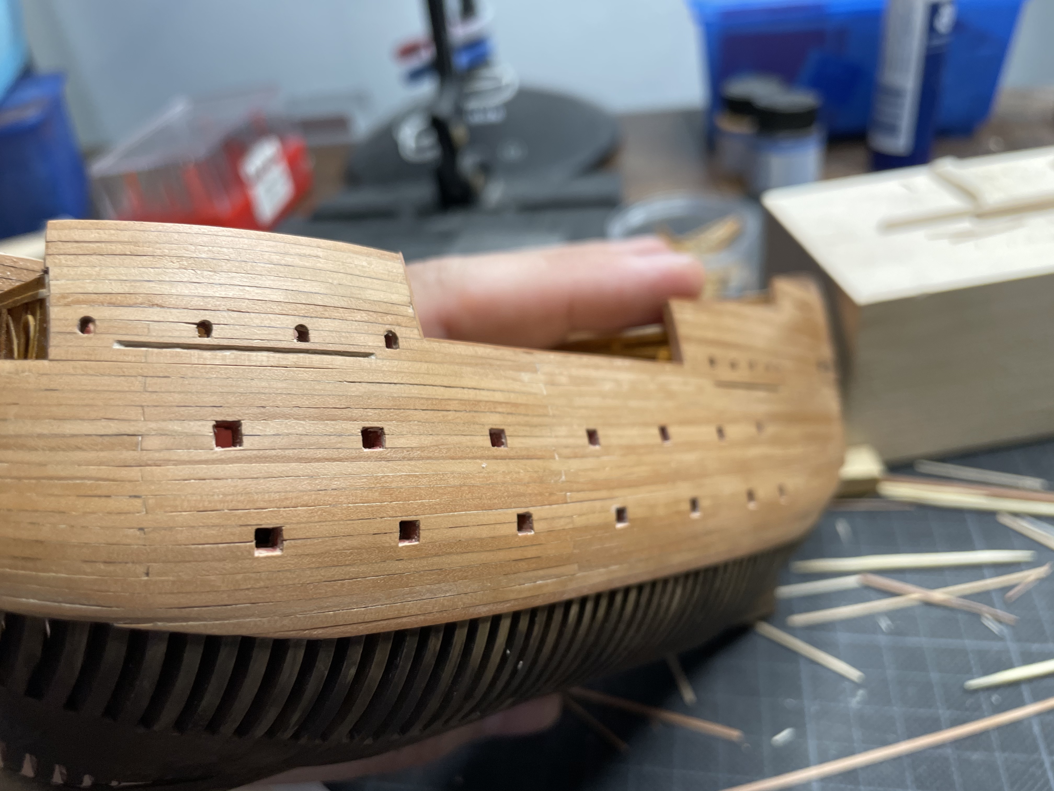 Wolno prace postępują. Permanentny brak czasu. Zabrałem się mimo różnych wątpliwości za plankowanie. Całość będzie rzecz jasna przeszlifowana dopiero. Wcięcia przygotowane pod ławy wantowe i zawnętrzną galerię rufową.