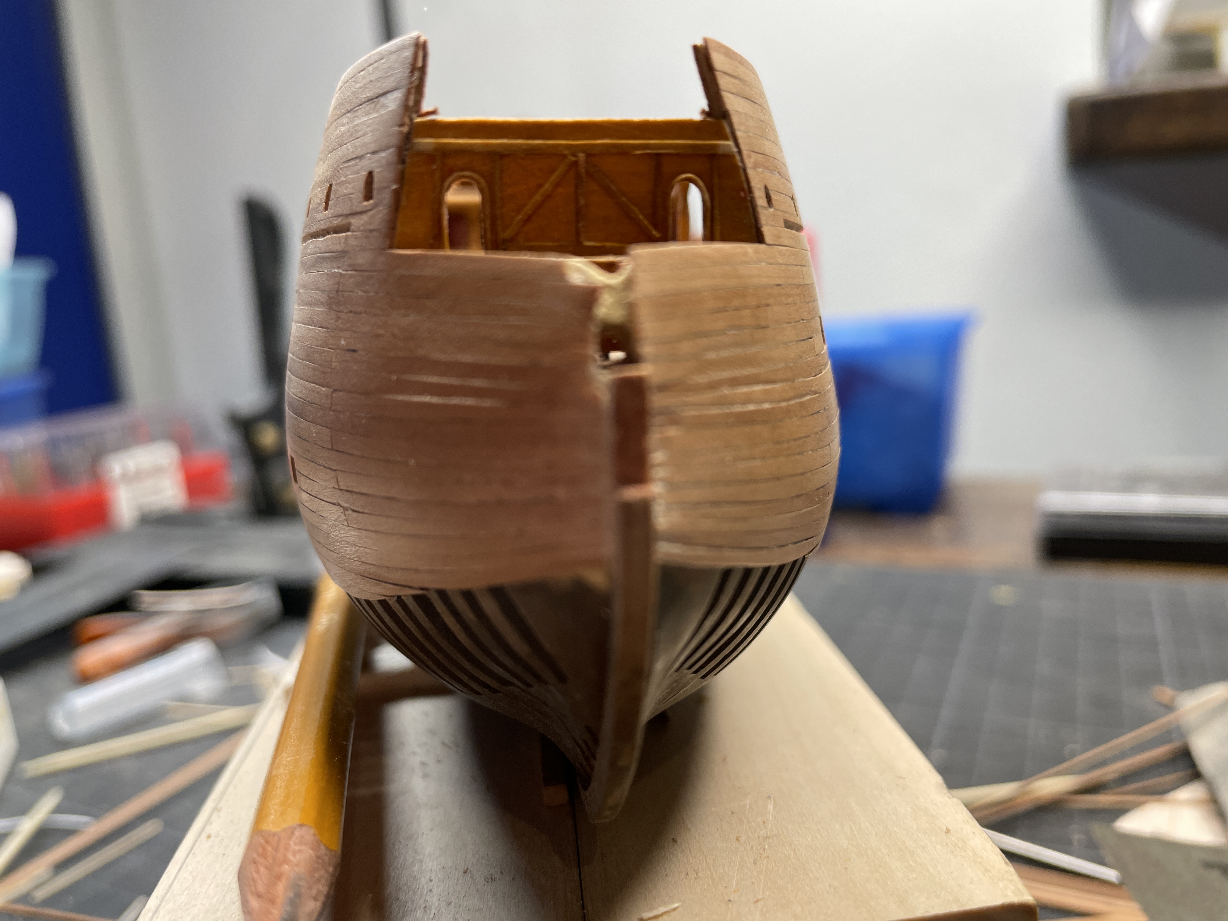 Do tego pozostaje dopracowanie okien rufowych, przygotowanie rufy pod ster.