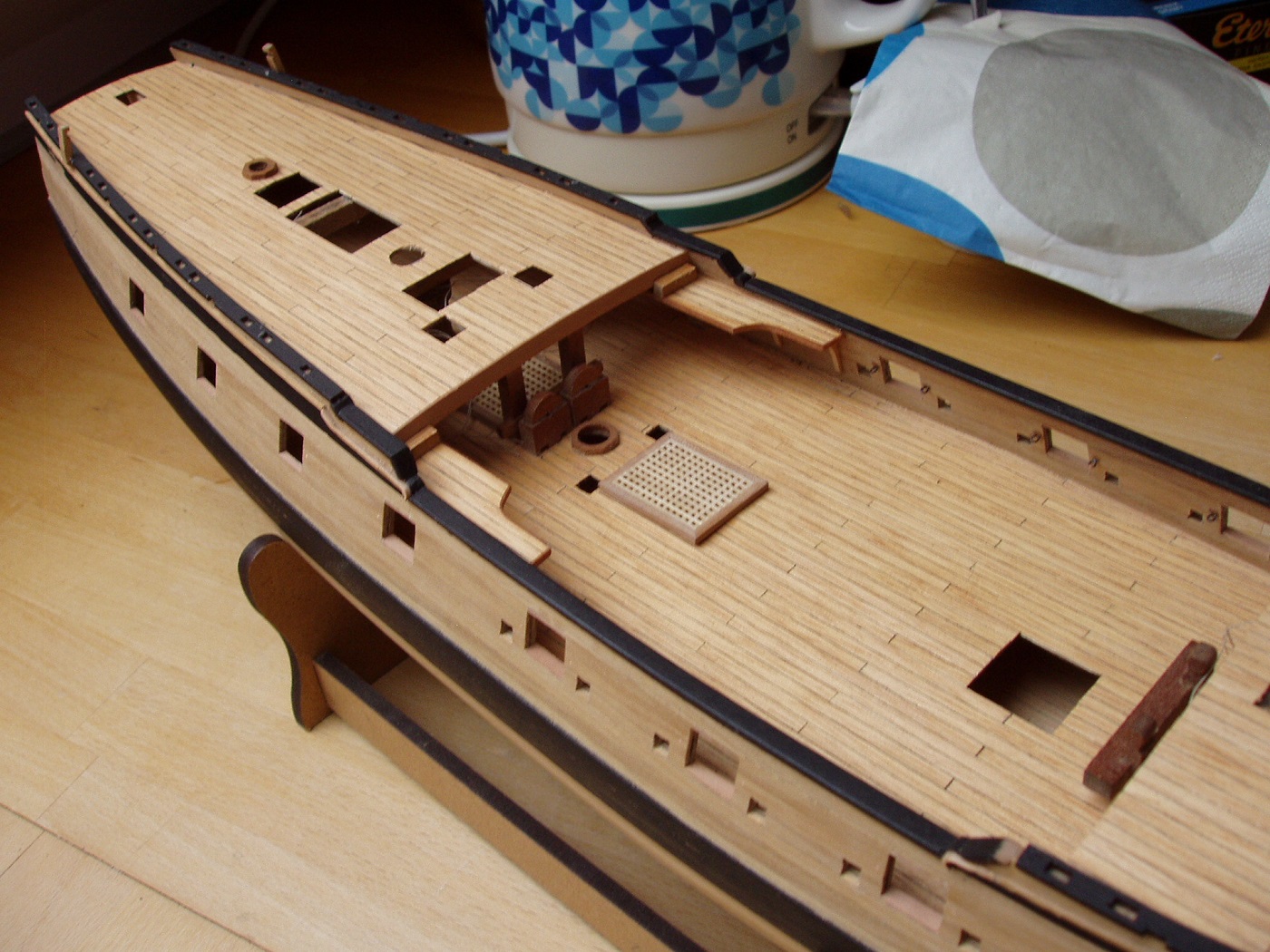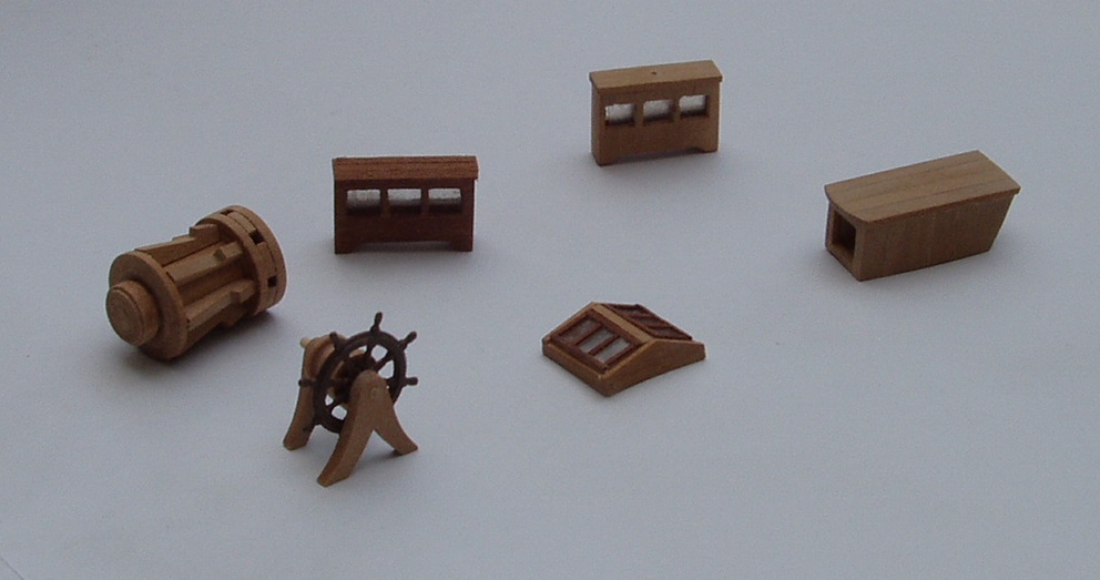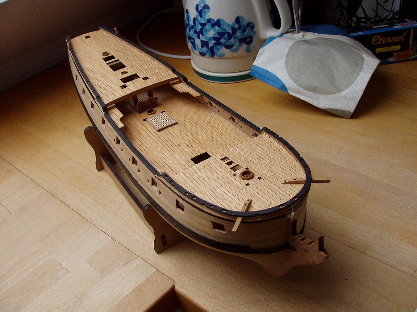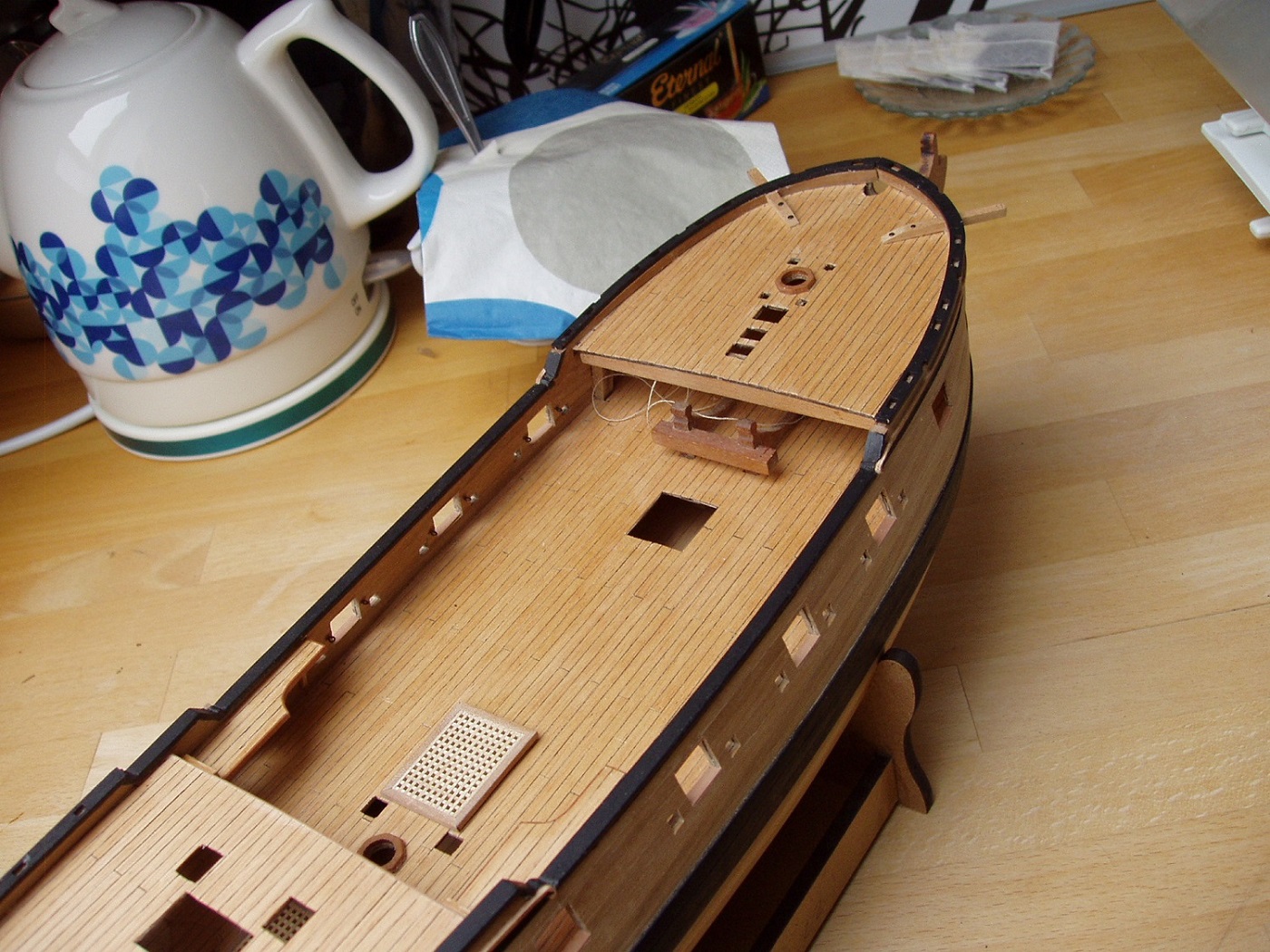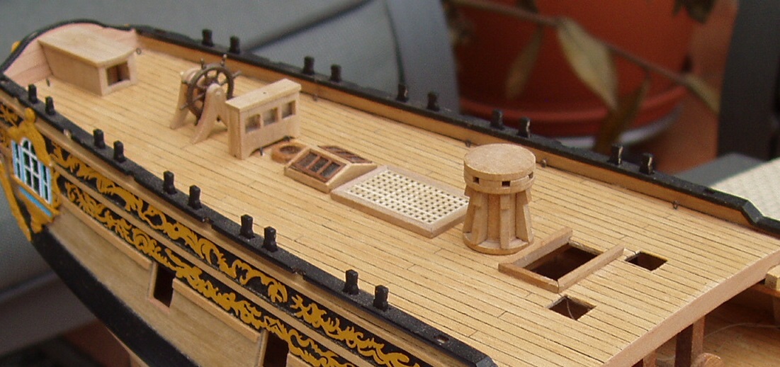 Jeśli chodzi o sam model to aktualnie robię "mebelki" pokładowe. Chcę uniknąć czerwonego koloru który maskuje sklejkę użytą do ich wykonania ale czerwony kabestanu czy osłony jarzma rumpla mnie nie odpowiada. Parę zdjęć niżej. Pozdrawiam Janek