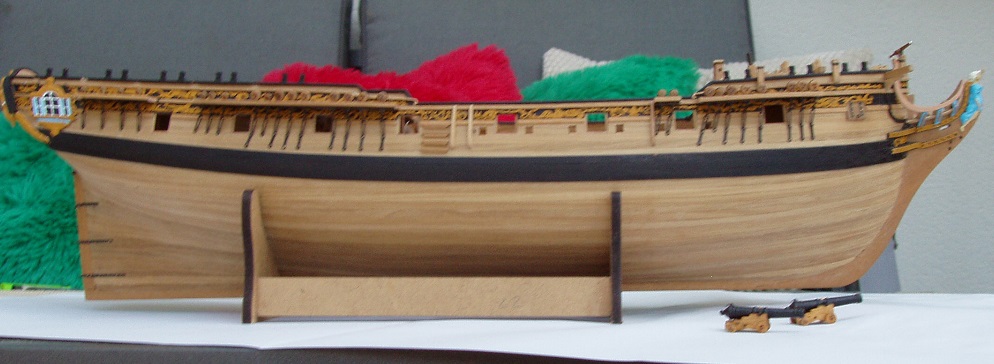 Prace trwają. Położyłem deski na pokładach i wewnętrznej stronie burt, zamocowałem oczka do mocowania lawet i położyłem pierwszą farbę. Przez oczka do tylnego mocowania lawet przykrytych już górnym pokładem przewlokłem nitki które posłużą później do wciągnięcia armat ze śródokręcia. Nie wiem jaka jest zasada przyjęta w modelarstwie czy lawety się wkleja czy pozostają mocowane tylko linami. Pozdrawiam Janek