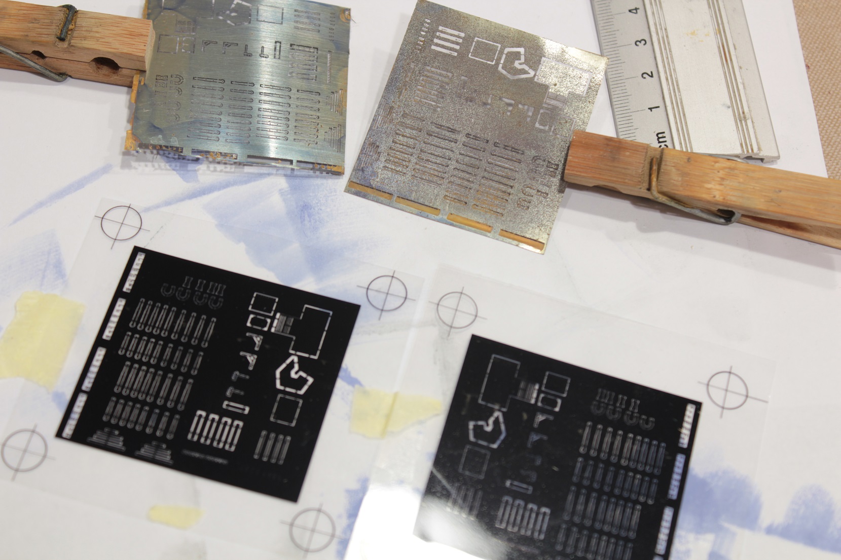 Blaszki z nieusuniętą fotoemulsją, widać która jest prześwietlona