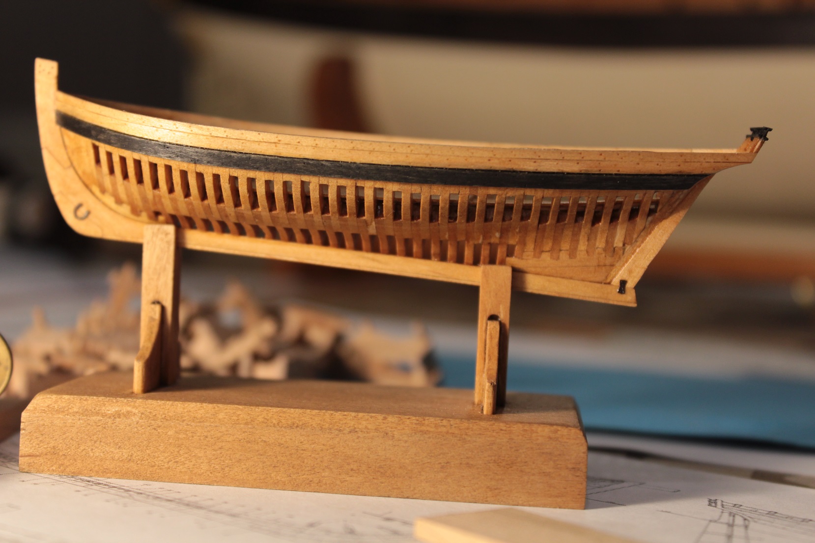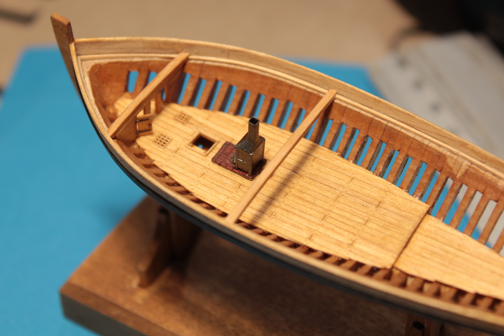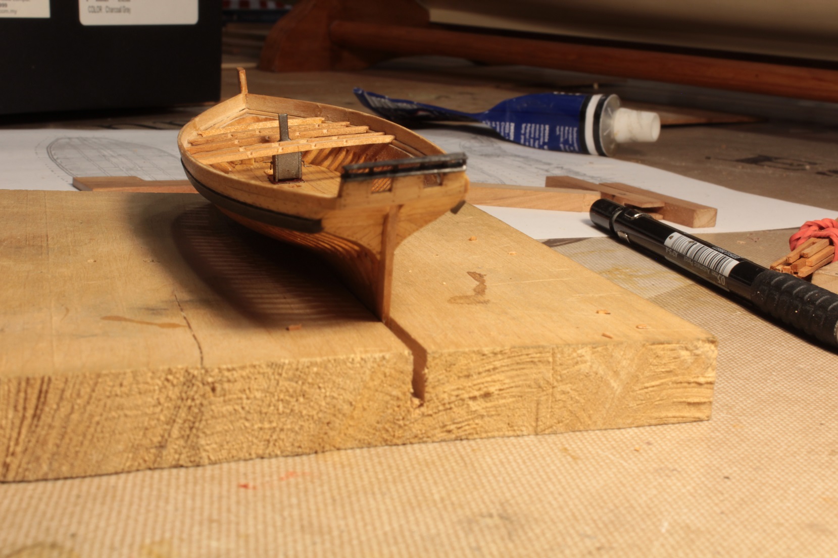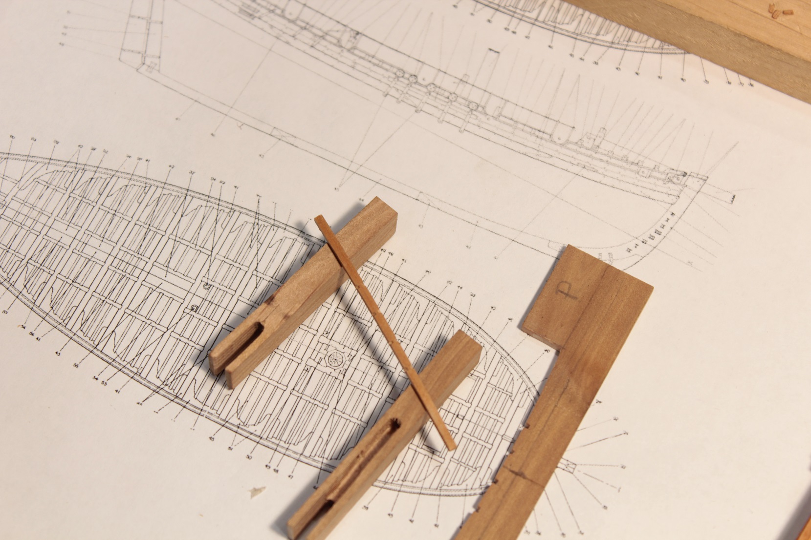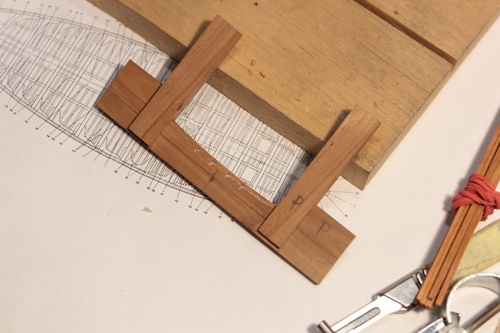 Siedząc przy nalewce Sylwka (miałem mały zjazd z Hadżi'm, znaczy się odwiedziny:)) dłubię przy pokładnikach. Pokładniki wyginam na sucho przy kształtce grzejąc małą lutownicą kolbową od wewnętrznej strony łuku. Wzornik ma coś w rodzaju dyb, którymi blokuję pokładnik