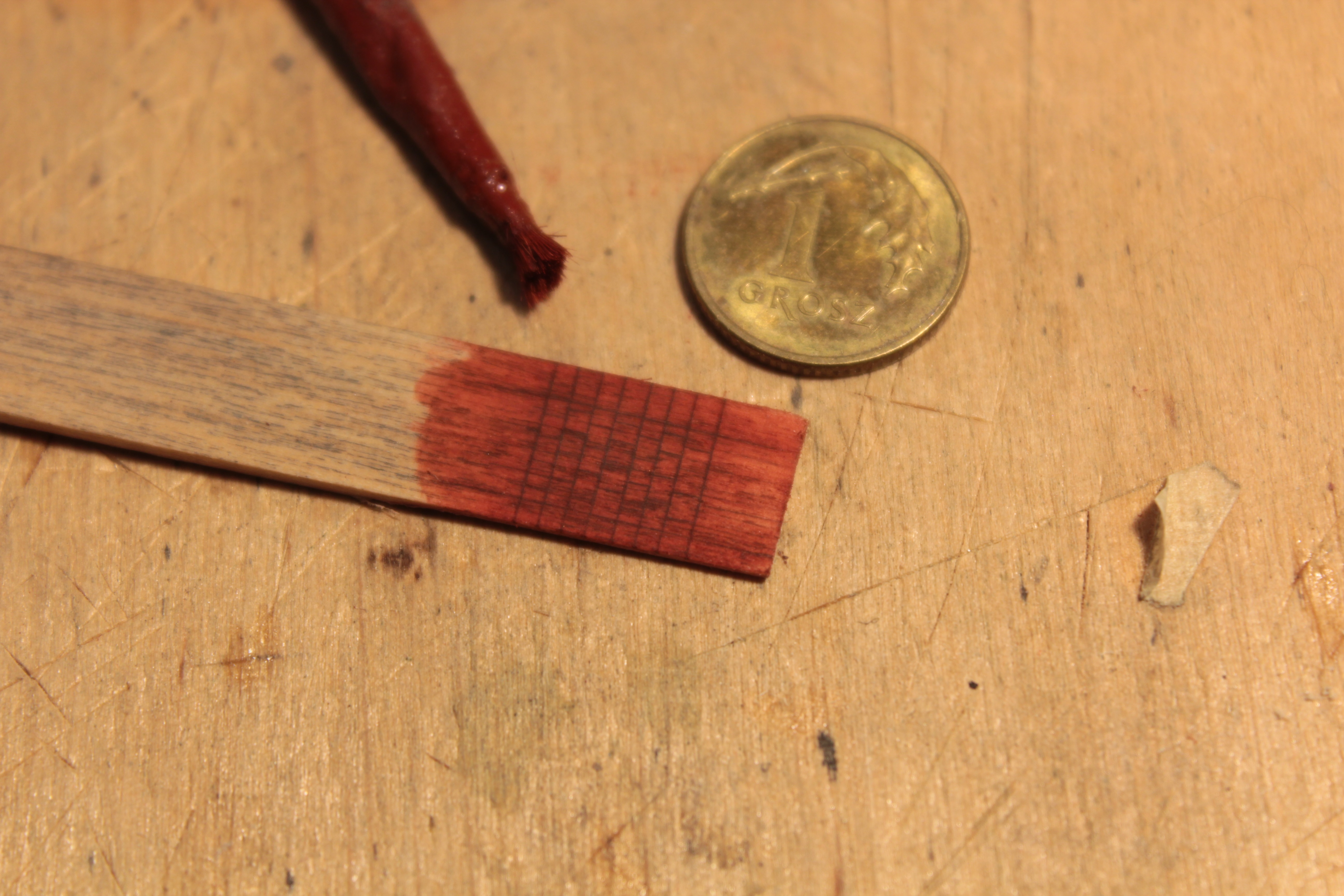 Mieszanką czerwonego tuszu i bejcy wiśniowej (dawno temu Kazik (Kagra) w jednej ze swoich relacji pisał o zastosowniau tuszu kreślarskiego) naniosłem ceglanego barwnika