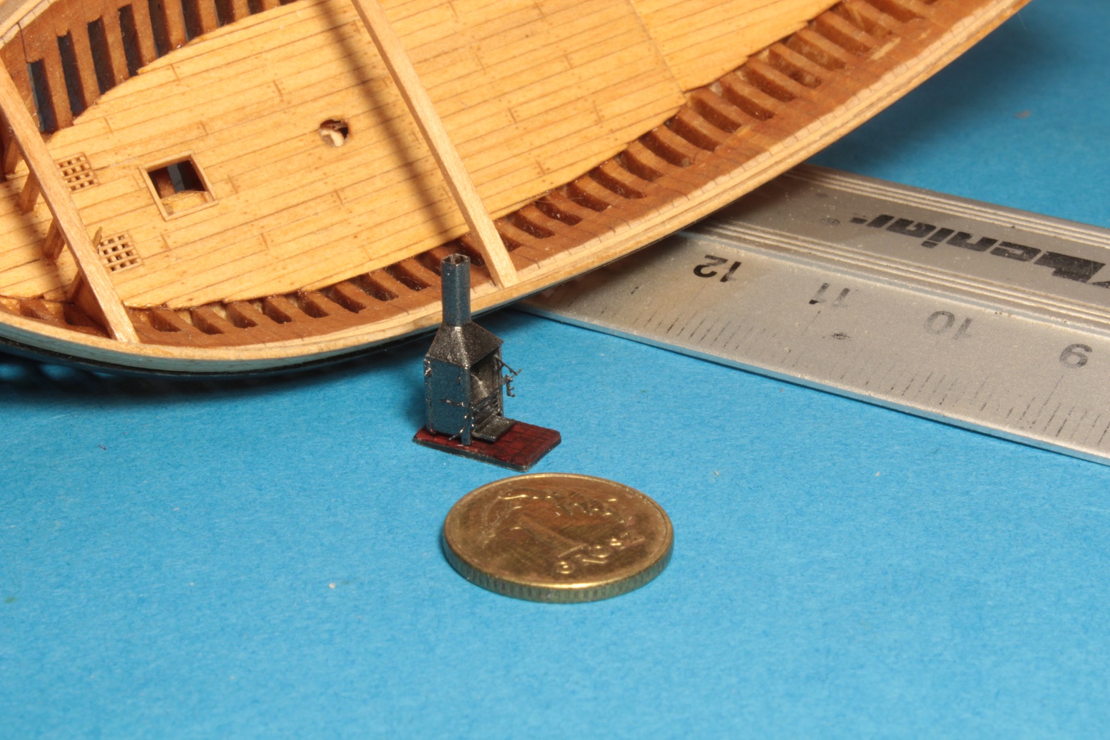 Po związaniu kleju (parę sekund) starłem imitację cegieł wraz z opaską na papierze ściernym do grubości około 0,5 mm i przykleiłem piec pryśnięty farbą Tamiya (gun metal, może byłby lepszy czarny mat?)