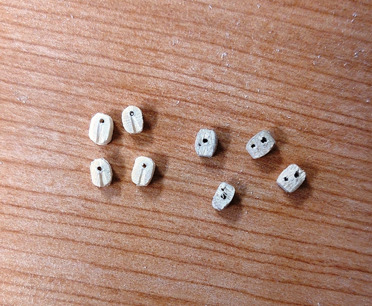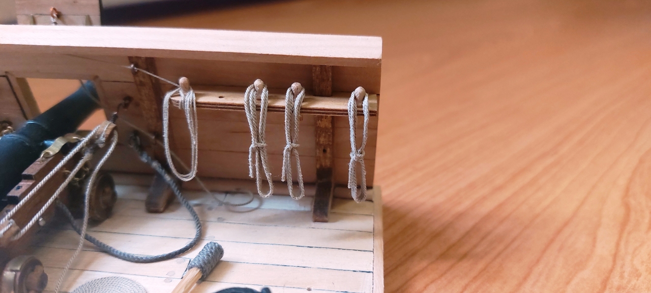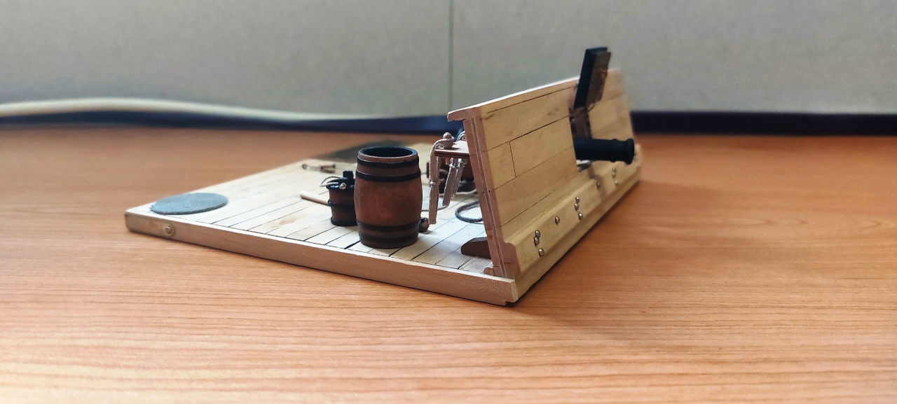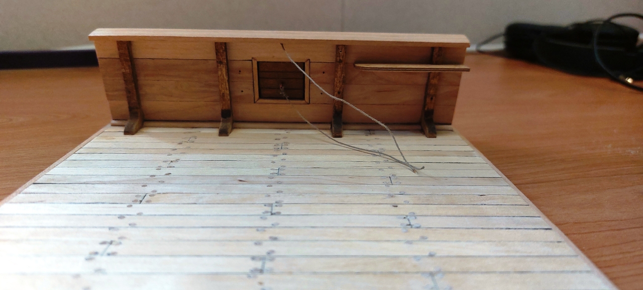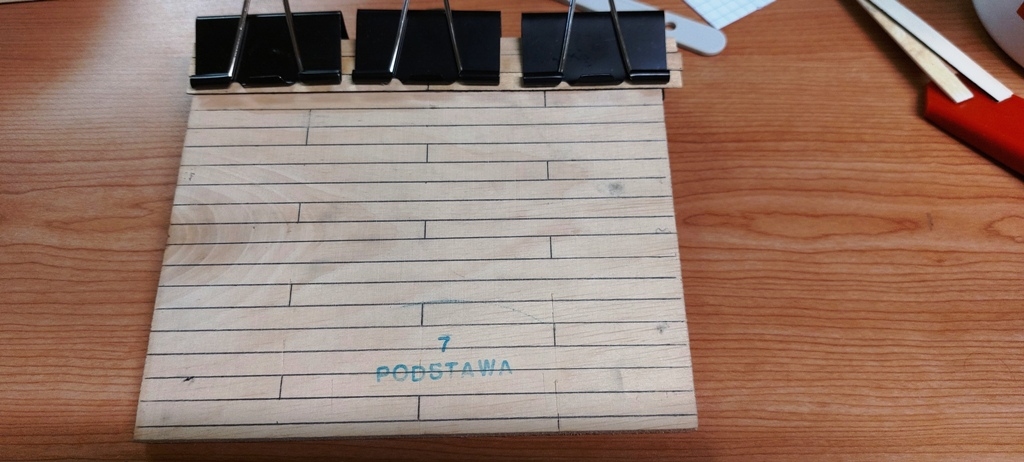 Pokład Nie byłem zachwycony z efektów, więc rozwiercilem wszystko i postanowiłem wbić normalne kolki bez malowania markerem dookoła. Burtą ciąg dalszy Laweta Bloczki Mocowanie lawety Efekt końcowy
