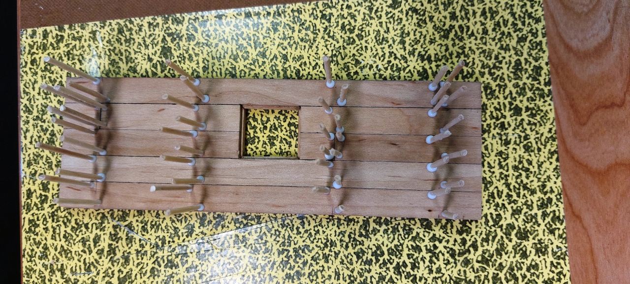 Pokład Nie byłem zachwycony z efektów, więc rozwiercilem wszystko i postanowiłem wbić normalne kolki bez malowania markerem dookoła. Burtą ciąg dalszy Laweta Bloczki Mocowanie lawety Efekt końcowy