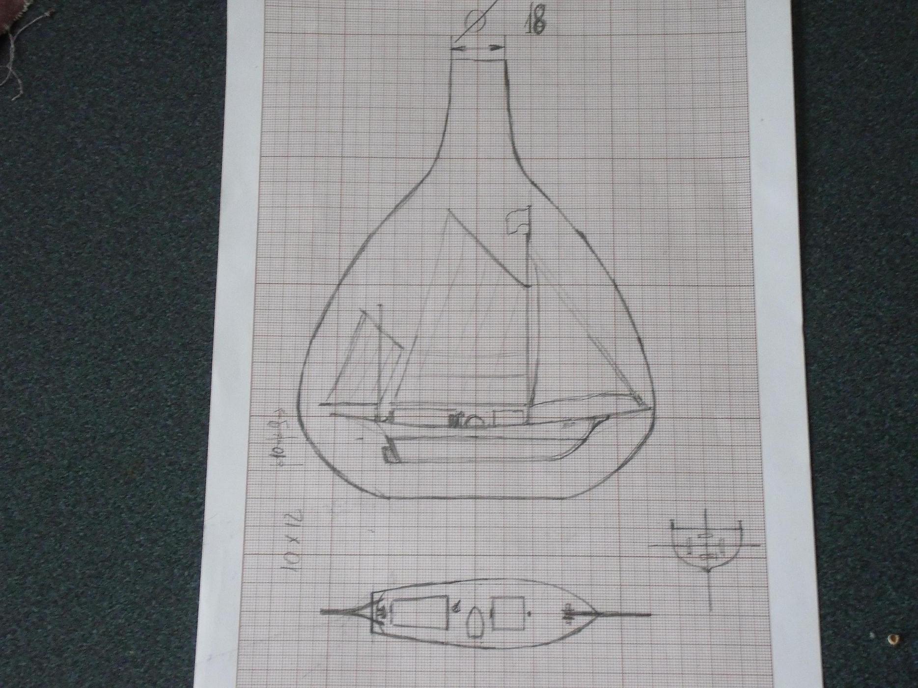 Postanowiłem pokazać (tym razem od A do Z) sposób umieszczania jachtu w butelce. Mój wybór padł na jacht J.Slocuma SPRAY. Zamierzając wciskać cokolwiek do butelki najpierw musimy postarać się o butelkę. Mnie udało się zdobyć szkło w którym pierwotnie było PORTO lecz teraz będzie nieco szlachetniejsza zawartość. Zatem mając butlę rozrysowuję jej kształt i wpisuję rysunek miniaturki tak, by zajmował jak najwięcej przestrzeni wewnętrznej. Moja butla wygląda tak; Średnicę szyjki butelki mierzyłem przenośnikiem nawigacyjnym ale równie dobrze można zrobić ten pomiar za pomocą zwykłego cyrkla. Moja butelka ma średnicę wewnętrzną szyjki 18 mm z czego wynika, że kadłub łodzi będzie musiał być wprowadzany w czterech częściach.
