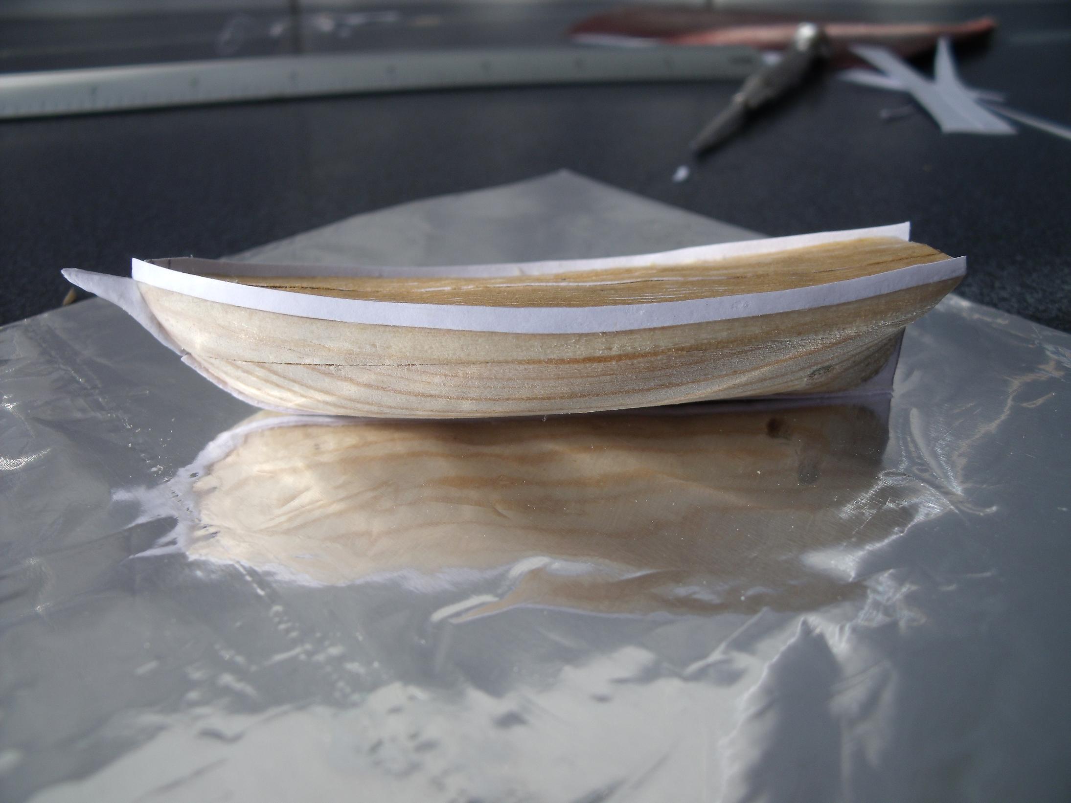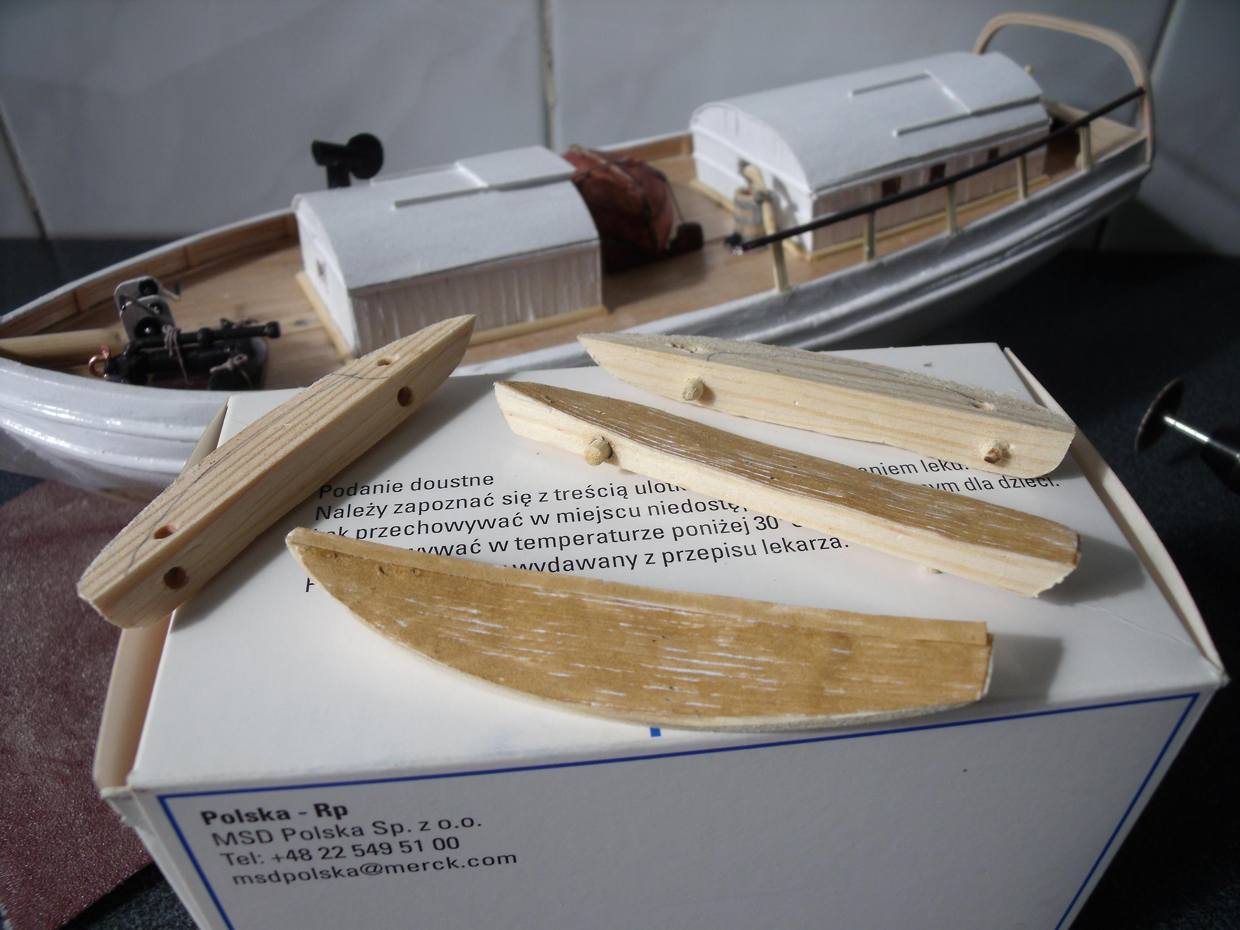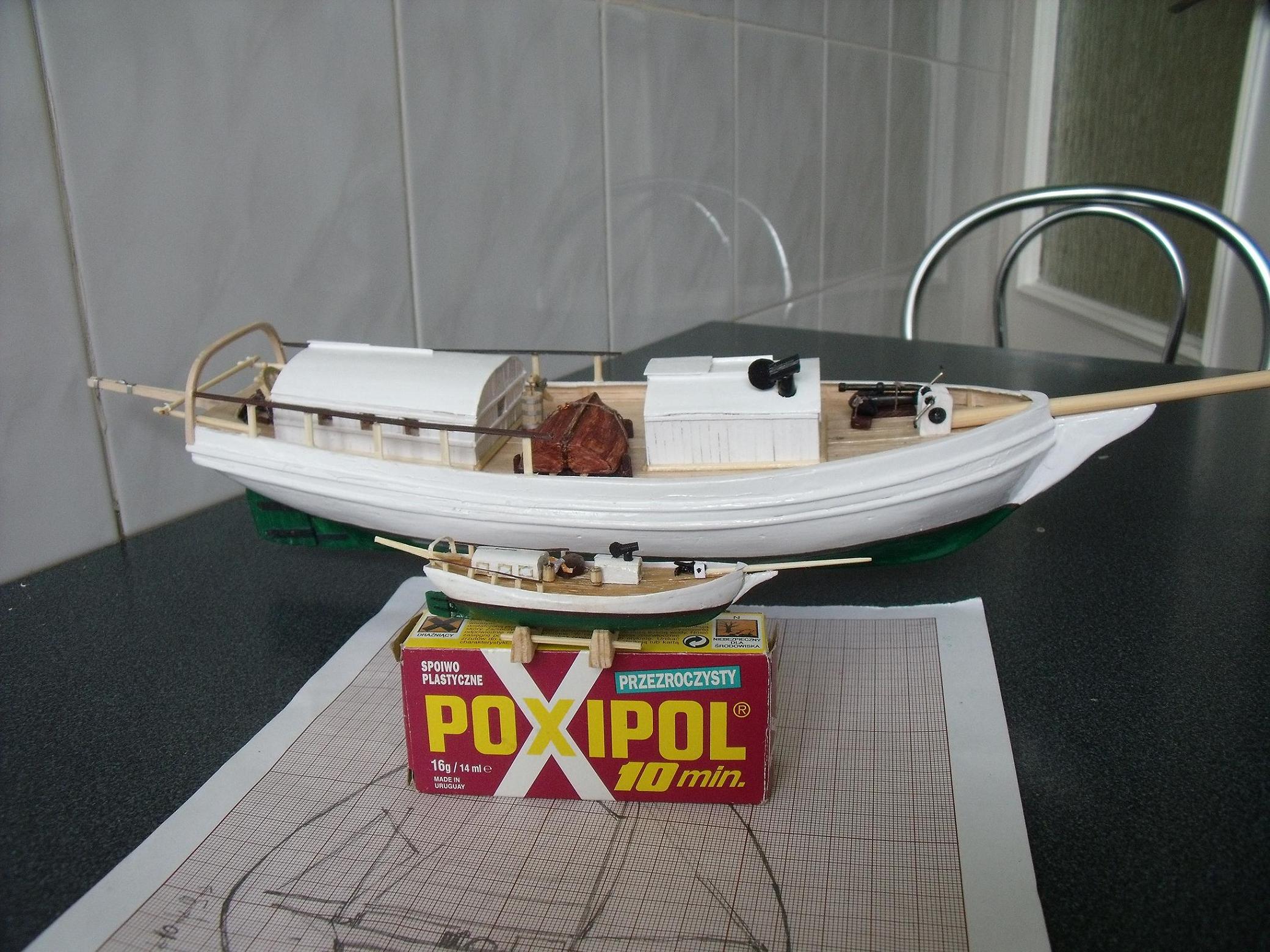 Następnym etapem jest dodanie do kadłuba stępki i dziobnicy. Oczywiście zarówno stępka jak i dziobnica sądoklejone tylko do jednej części kadłuba tak, by po złożeniu wyglądało jak całość. Doklejam też wykonane z kartonu falszburty i wzmacniam je malując wstępnie klejem o wdzięcznej nazwie Rakoll. Uważam, że jest lepszy od swojego kuzyna - WIKOLU a i czas schnięcia jest znacznie krótszy.Po wypacykowaniu wszystkiego klejem i przeszlifowaniu kadłub wygląda tak; Przyszedł czas na pomalowanie kadłuba i dodanie paru drobiazgów, które muszą być na pokładzie każdego porządnego jachtu.