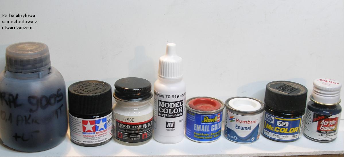 akrylowa farba samochodowa z utwardzaczem oraz wodne farby Vallejo.