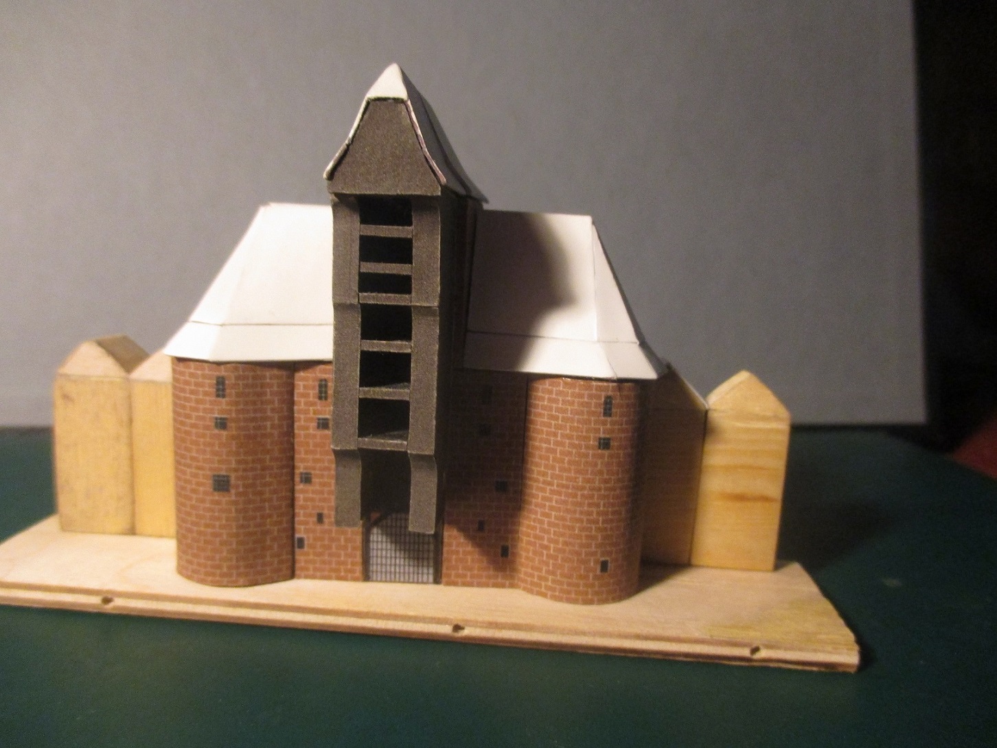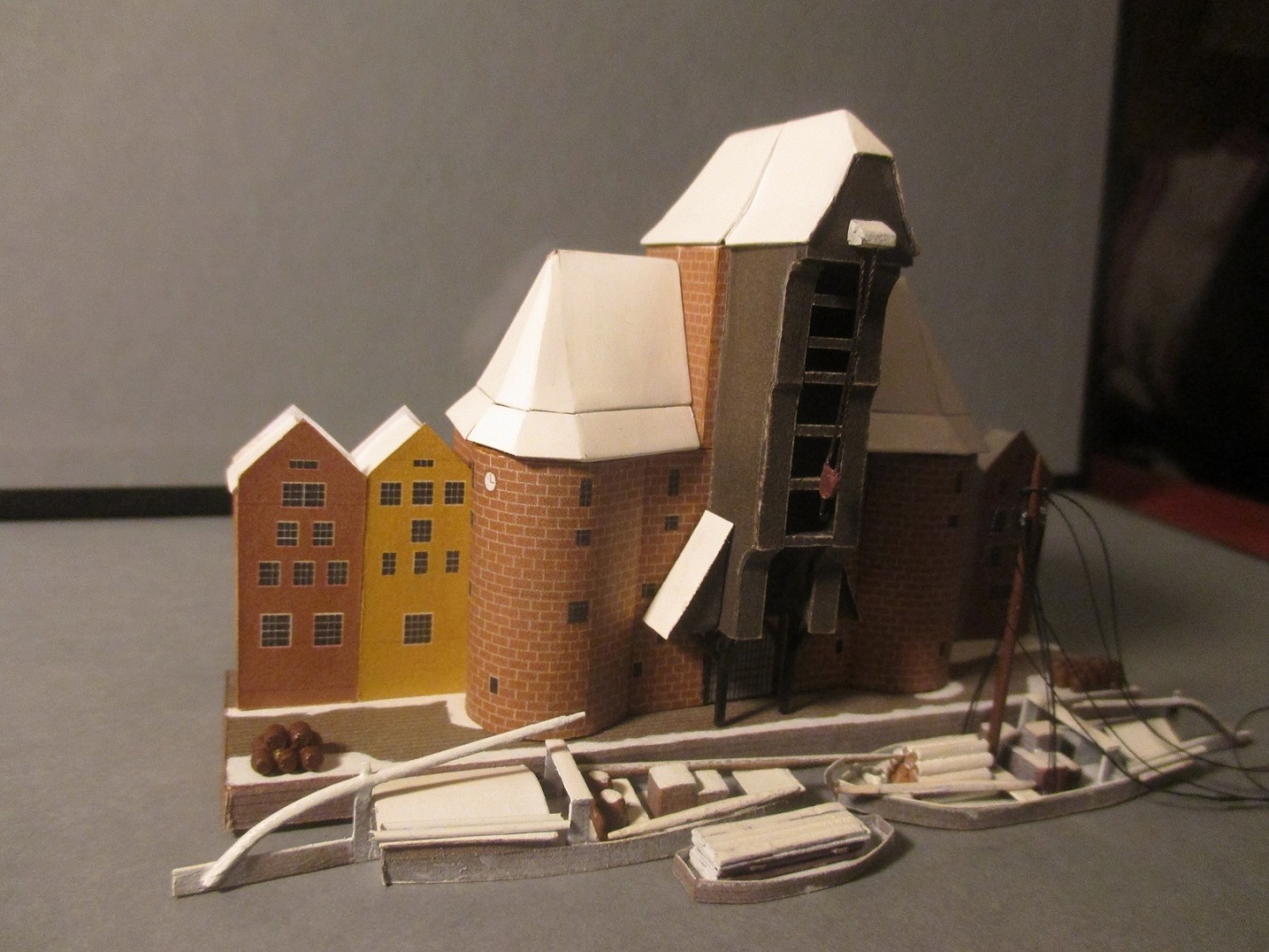 Przedstawiam postępy przy żurawiu. Jest już prawie ukończony. Niestety nie jestem do końca zadowolony z wykonania dachów. Za duże szpary, postrzępiony papier a i paluchy swoje zrobiły. W rękawiczkach gumowych nie umiem robić. Jednak papier trzeba zabezpieczyć wcześniej lakierem. Nauczka na przyszłość. Postanowiłem,że wykonam go z scenerii zimowej jak na pierwszym zdjęciu.Robię próbę na małym dachu. Po pomalowaniu ,jeszcze bardziej widać wszystkie niedokładności, ale to już jestem w stanie delikatnie doszlifować papierem ściernym. Może tego wszystkiego nie widać byłoby w butelce ale ja nie mogę patrzeć na tak żle zrobioną robotę.