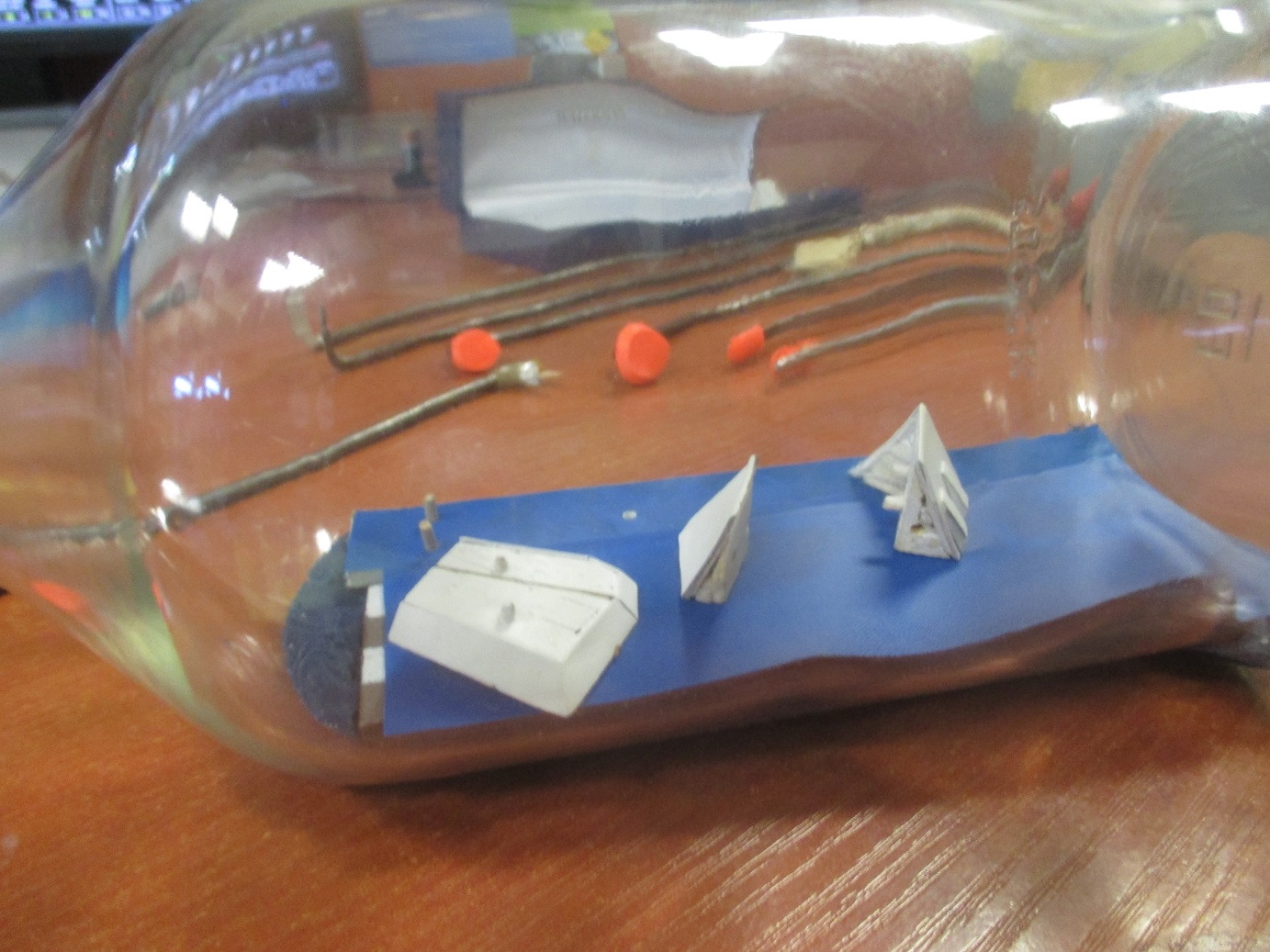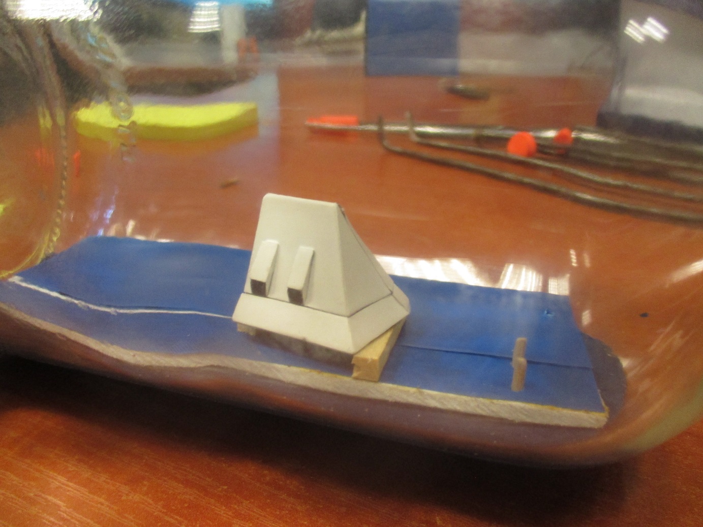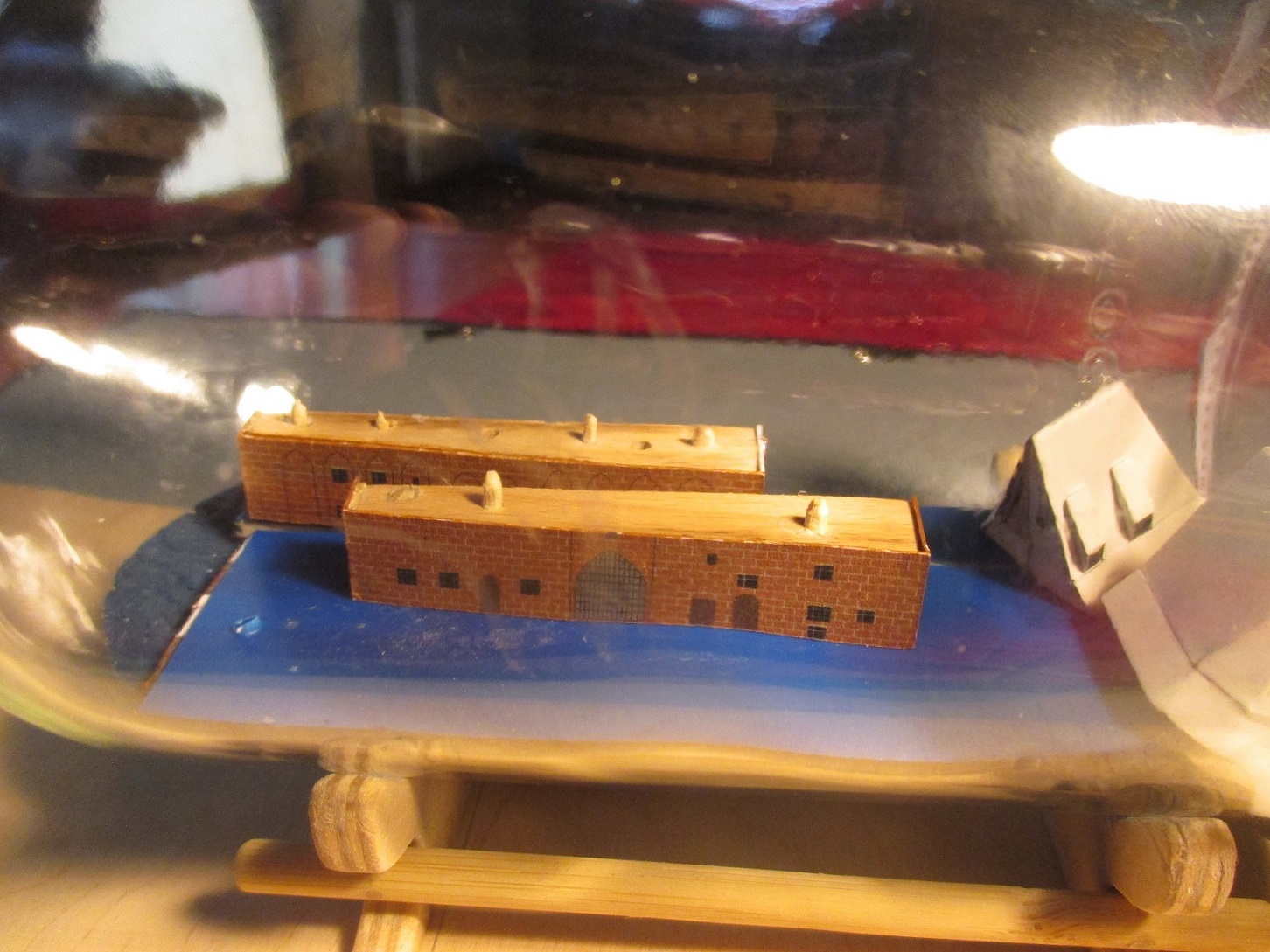 Pierwsze elementy złożone w butelce. Zaczynam od dachów ze względu na to, że póżniej będę miał mało miejsca na ich złożenie w środku. Teraz spróbuję zlikwidować widoczne połączenia. Nie wiem czy w 100 procentach mi się to uda.