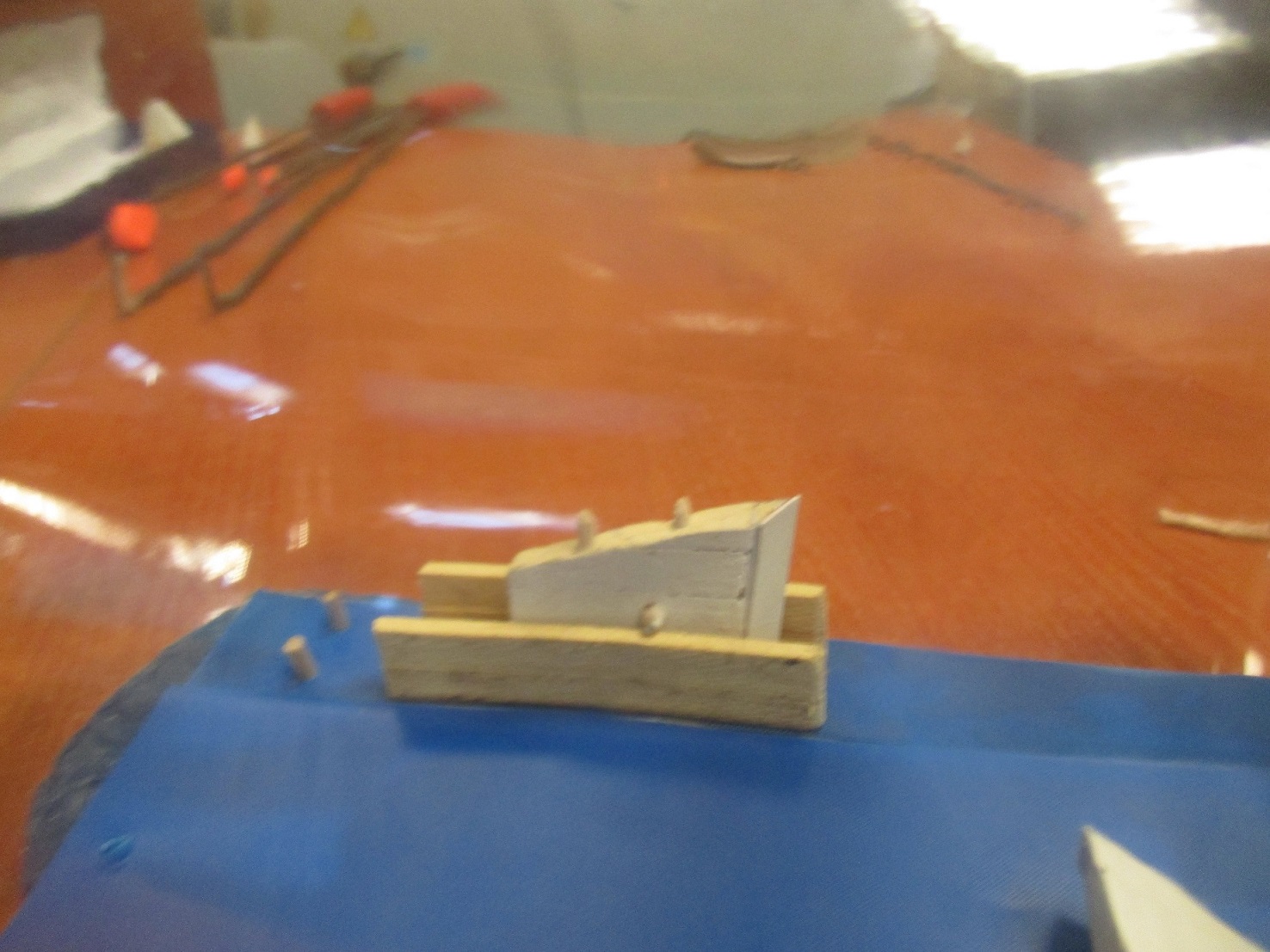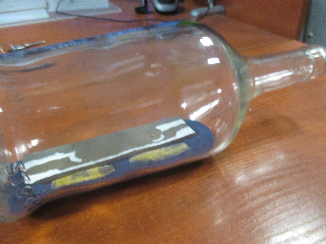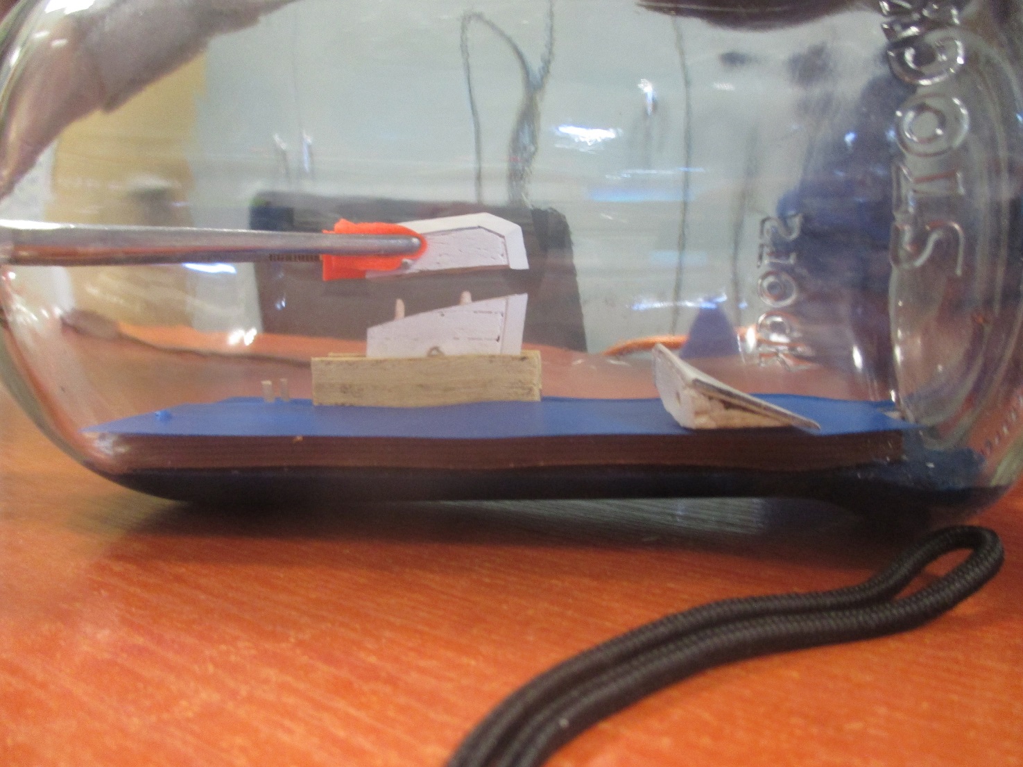 Pierwsze elementy złożone w butelce. Zaczynam od dachów ze względu na to, że póżniej będę miał mało miejsca na ich złożenie w środku. Teraz spróbuję zlikwidować widoczne połączenia. Nie wiem czy w 100 procentach mi się to uda.