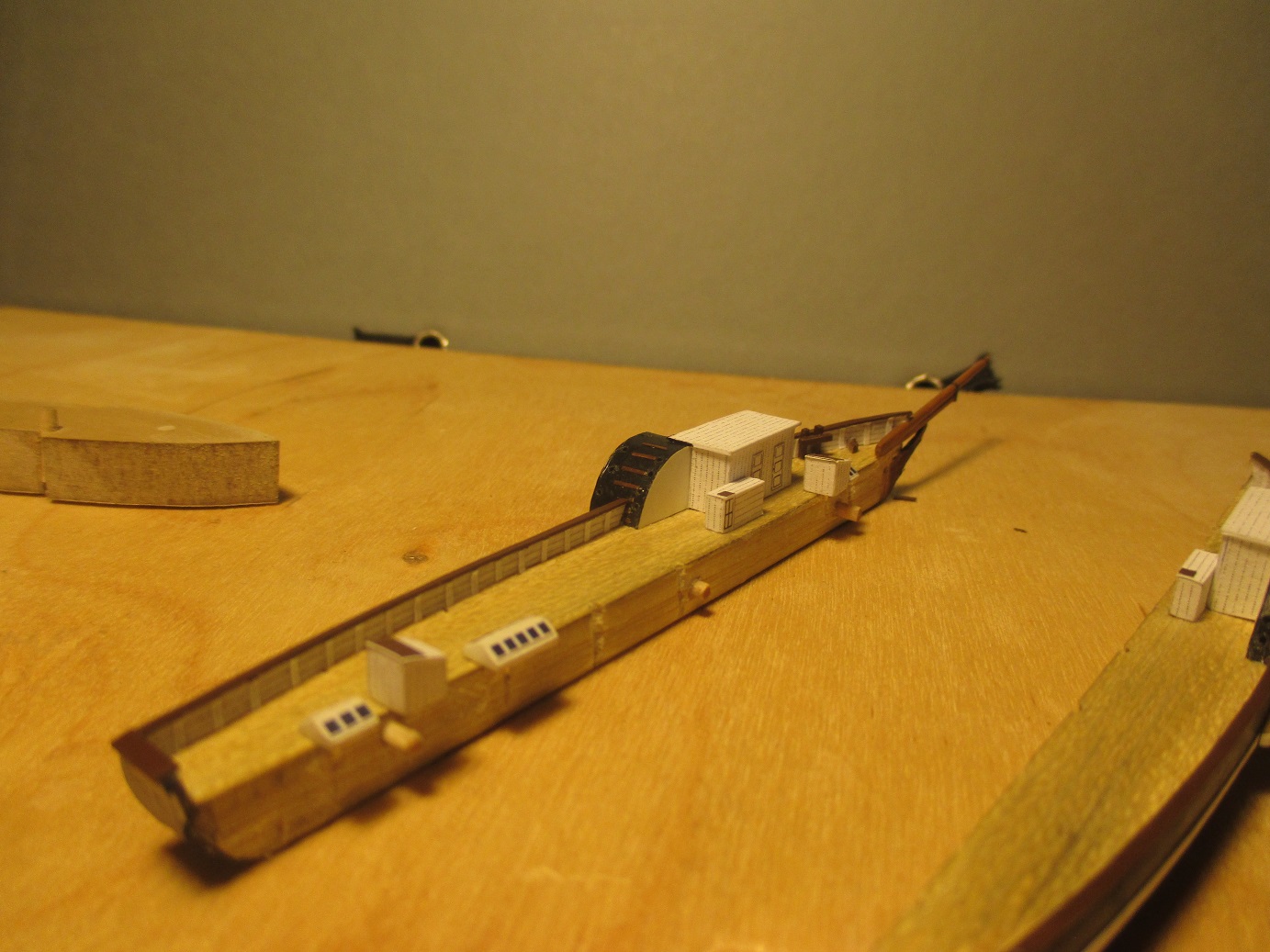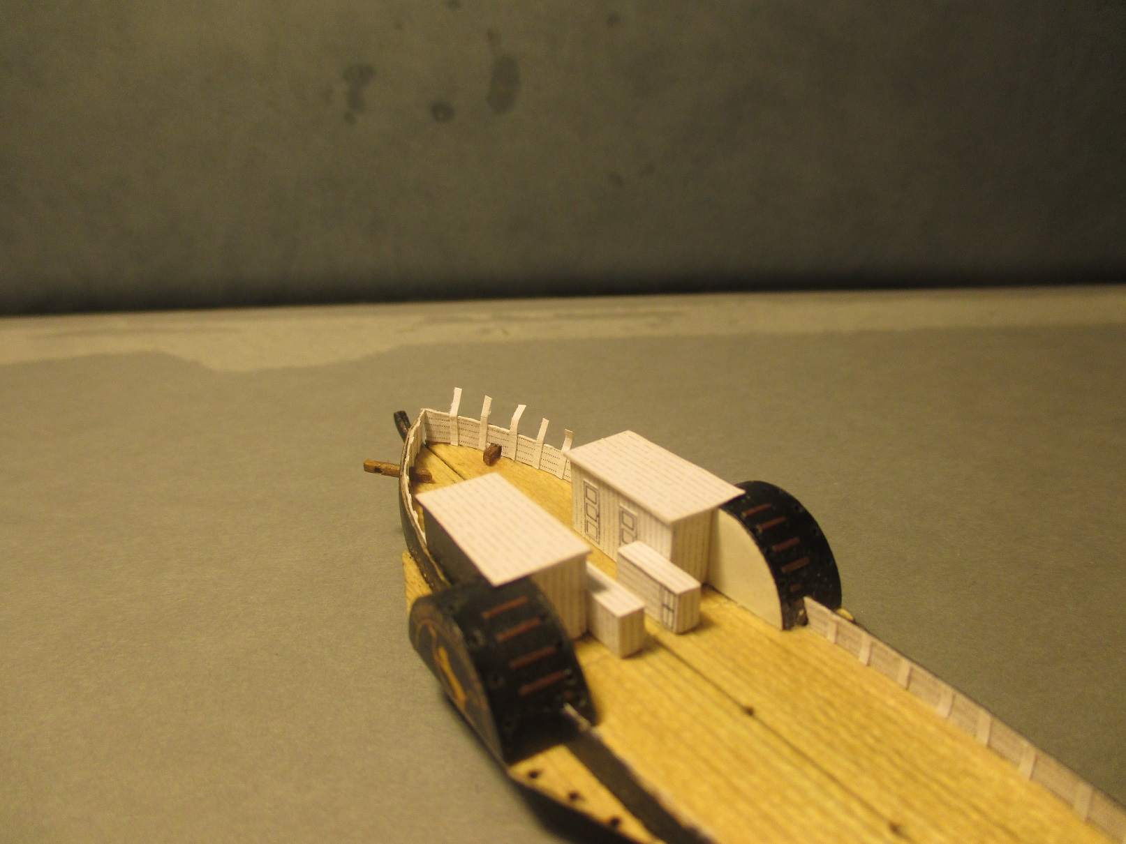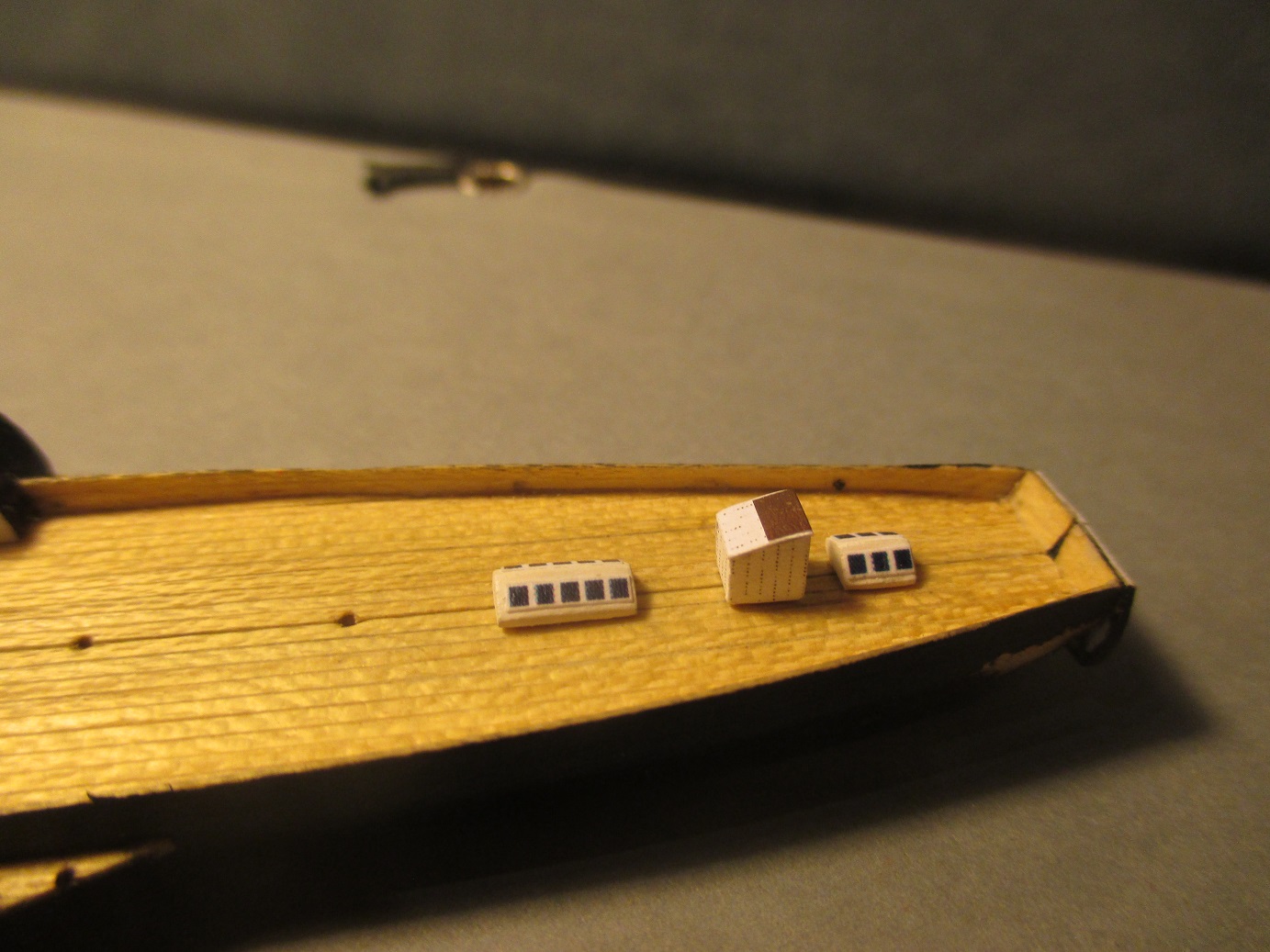 Po trzykrotnych nieudanych próbach wykonania pokładu w dwóch częściach postanowiłem zrobić deskowanie. Dlaczego? Niestety łączenie połówek kadłuba było zbyt widoczne. Oczywiście przy takiej skali nie uda mi się tego zrobić tak jak to było w rzeczywistości. Deseczki mają szerokość ok 1 mm. Zastanawiam się nad kolorem pokładu i czym go pomalować. Obecny kolor jest dla mnie za jasny i za czysty. Może macie jakieś pomysły?